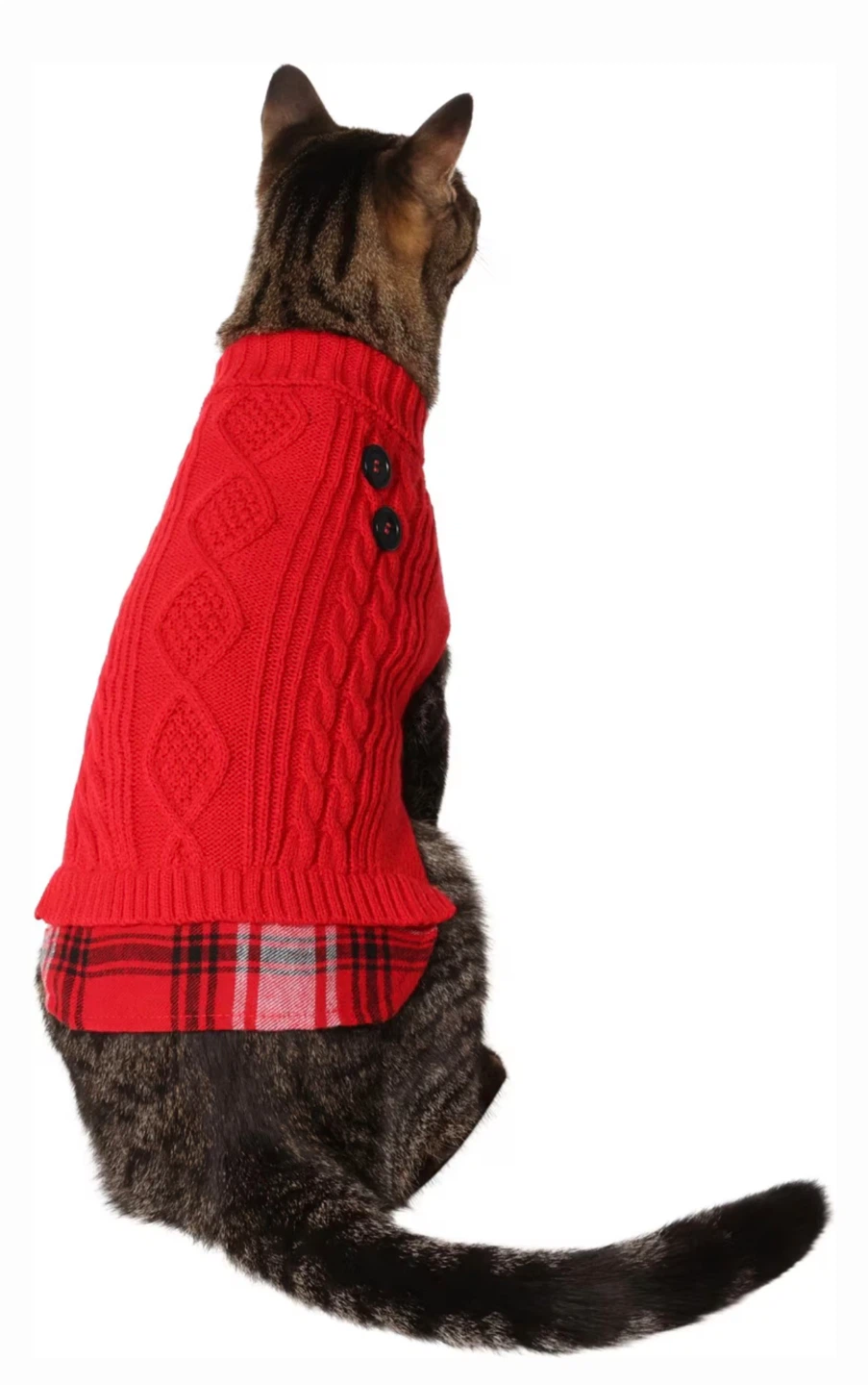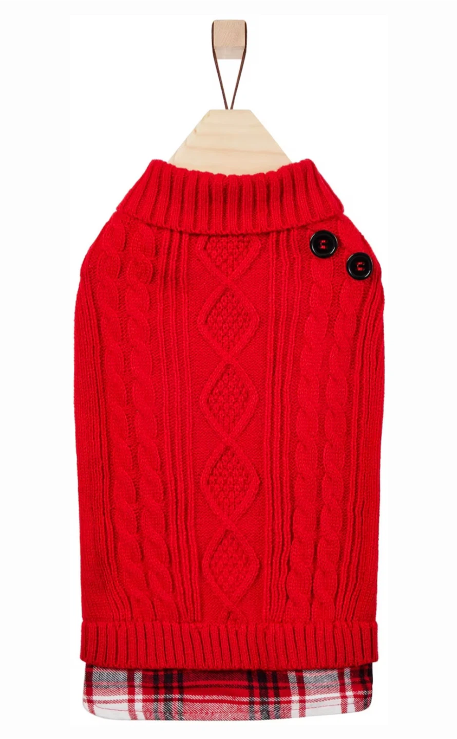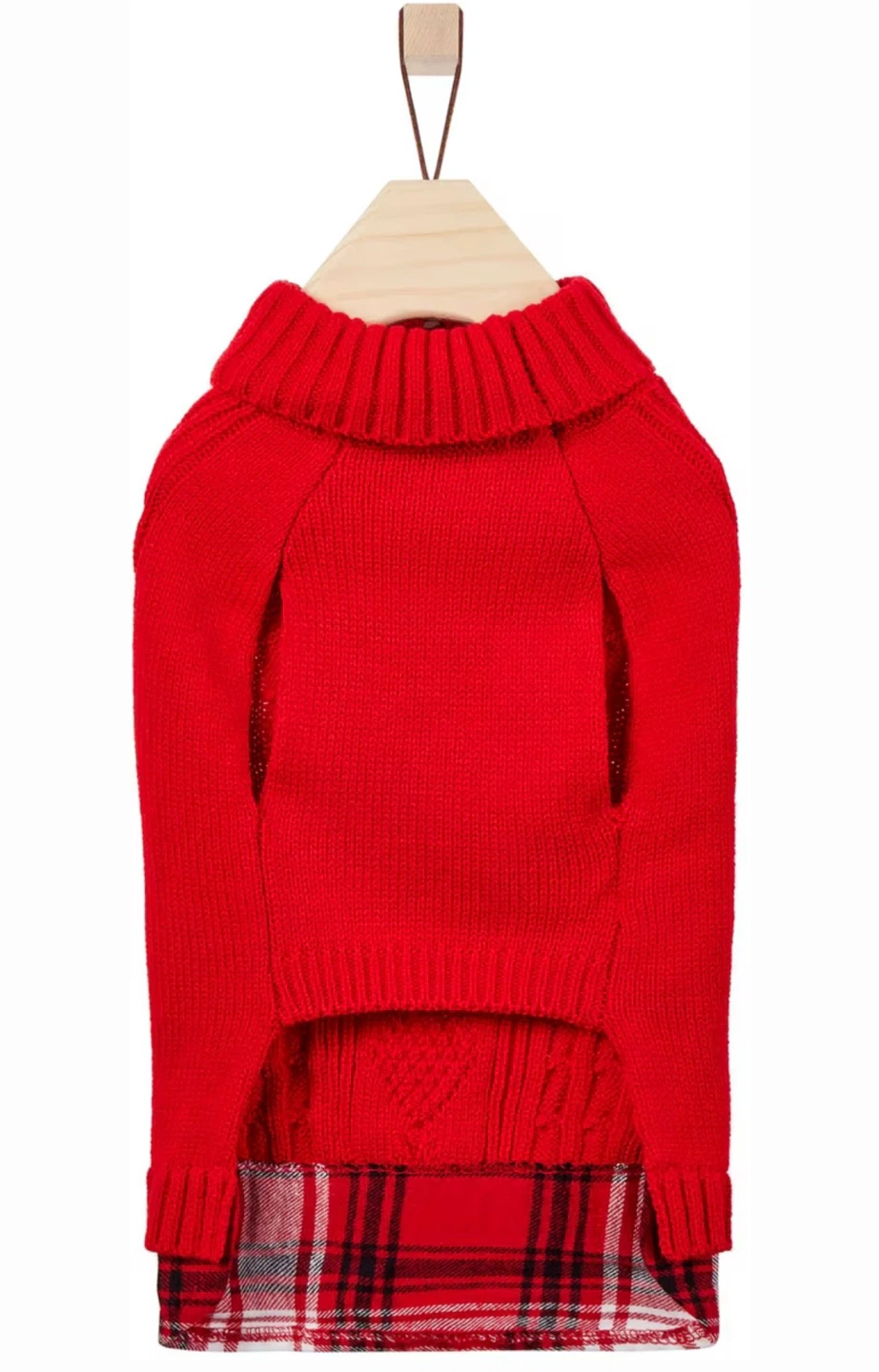 This is a Frisco brand pet sweater in a vibrant red cable knit design! XS size, It has a stylish layered look with a plaid shirt detail at the bottom. The sweater is a size medium, perfect for pets weighing between 6to 8 lbs with a body length of 12 inches, neck of 13 inches, and chest of 20 inches. It's a super cute way to keep your furry friend warm and fashionable!