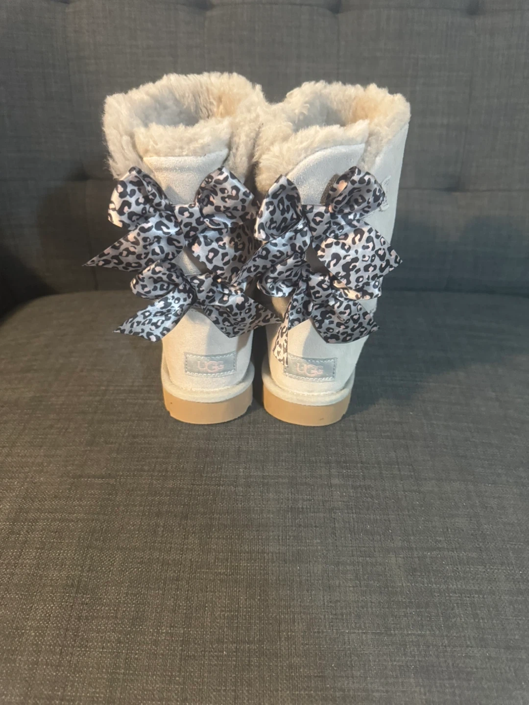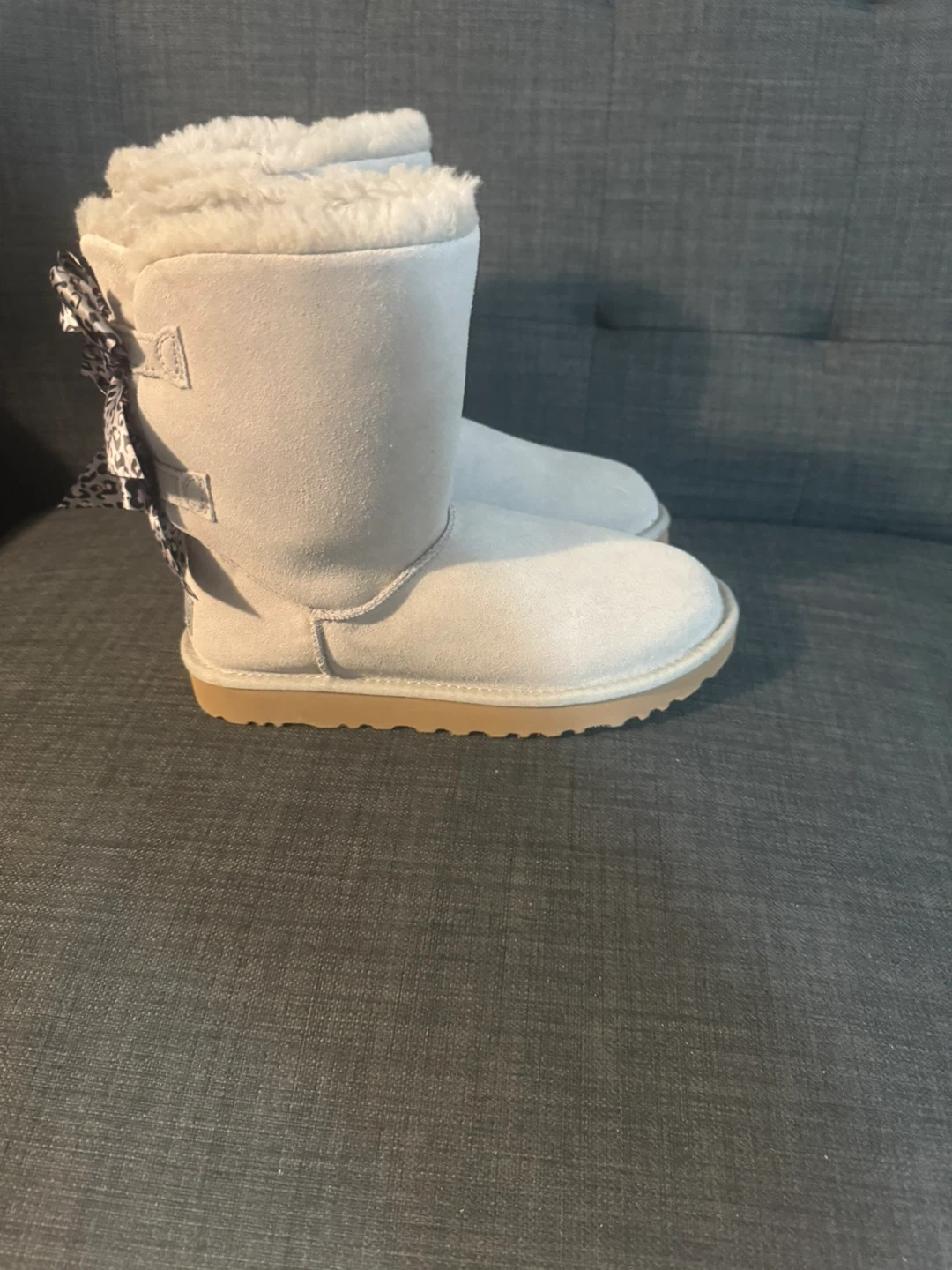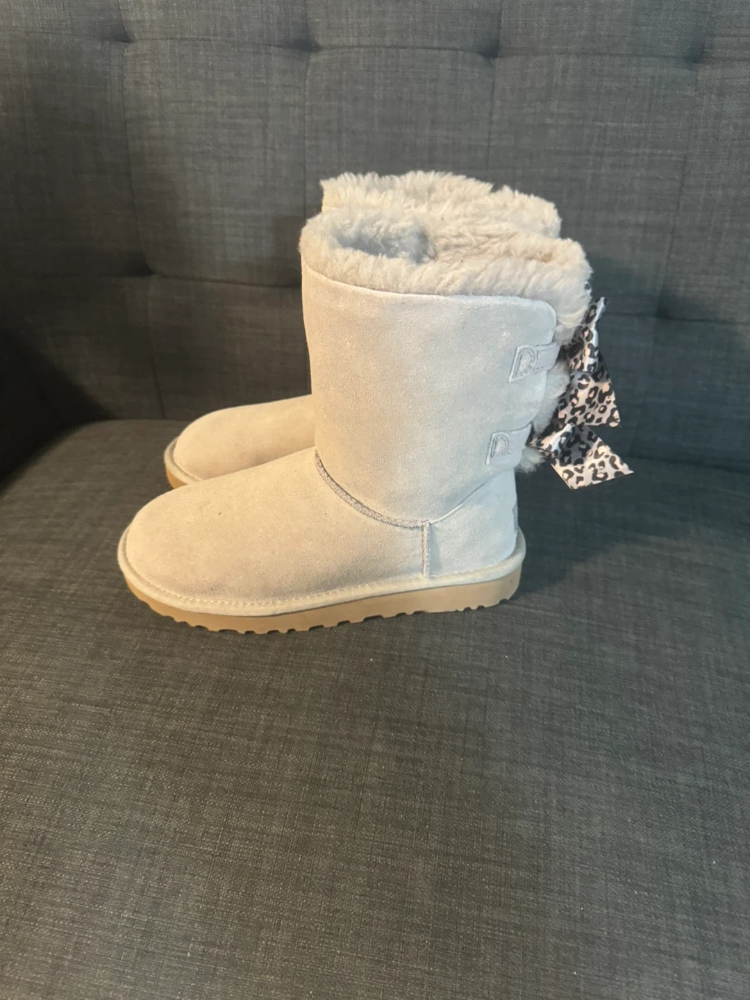 Cozy UGG boots in a neutral colour! They feature a cute bow detail on the back. Size 7.