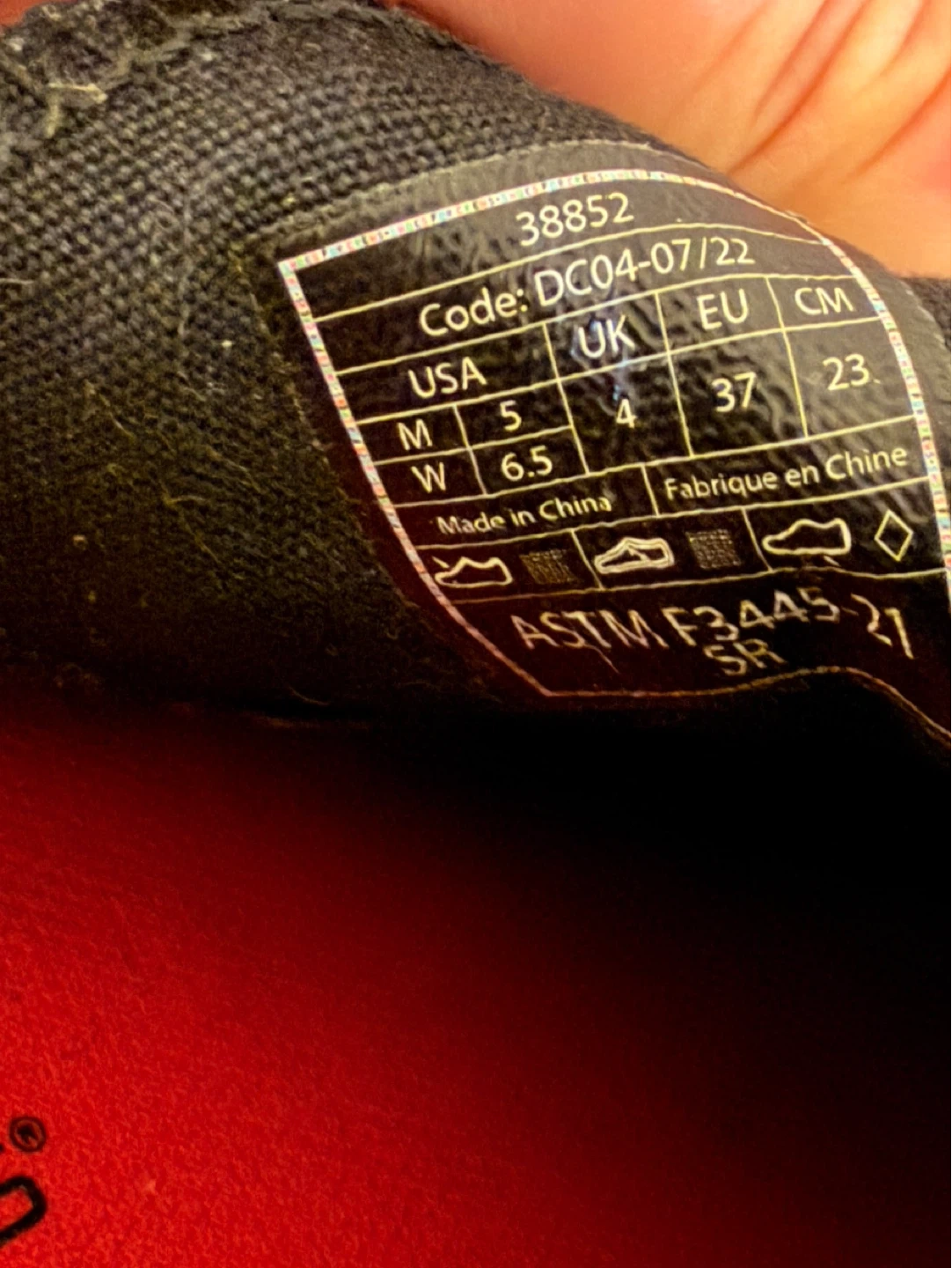 Shoes for Crews, size 5. The label indicates a US size of 5 for men and 6.5 for women. The European size is 37. They are black.