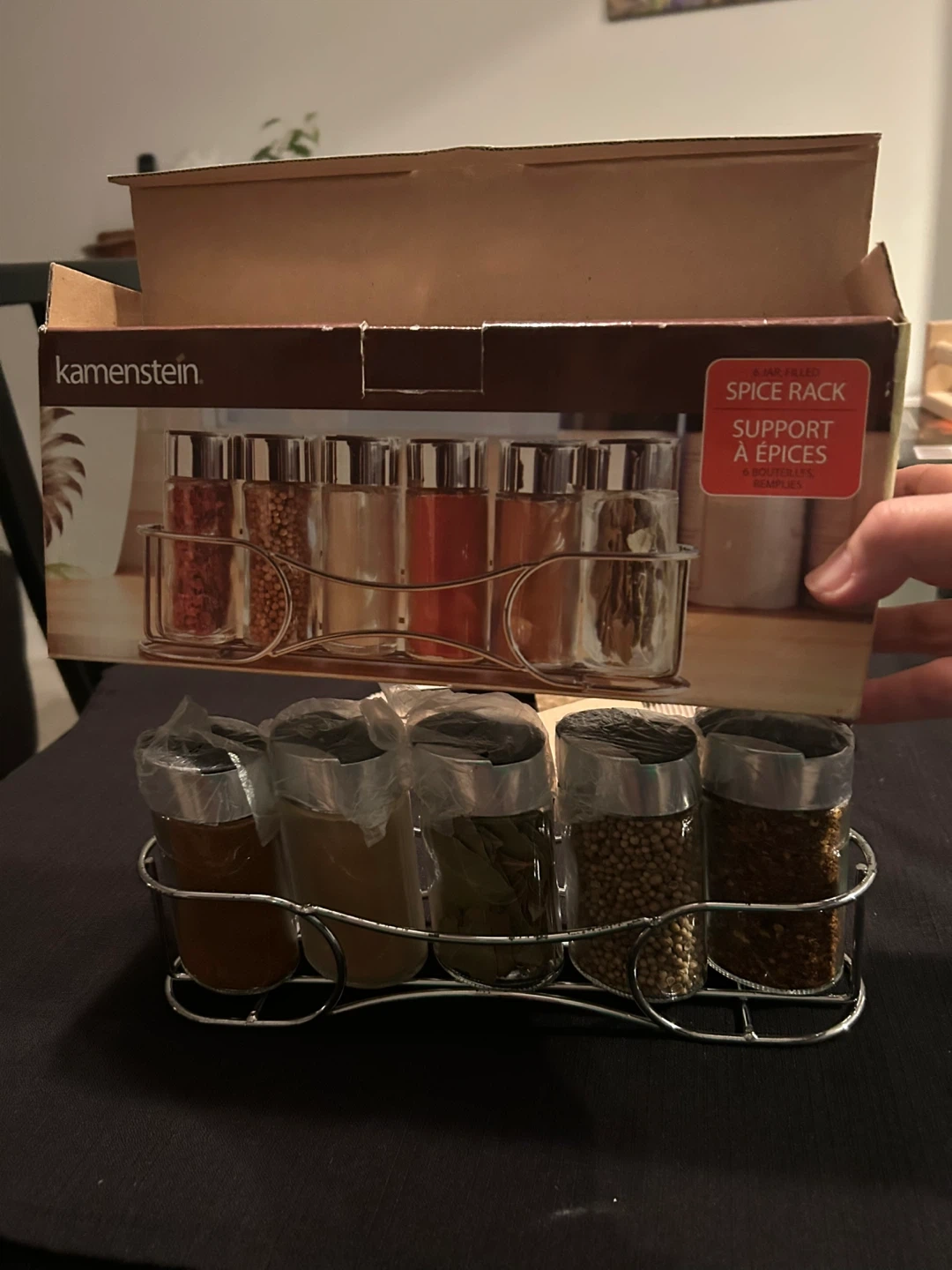 I'm selling a Kamenstein spice rack that comes with 5 glass containers pre-filled with spices that have never been used. Originally came with 6 jars but don’t know what happened to the sixth. Selling for friend.