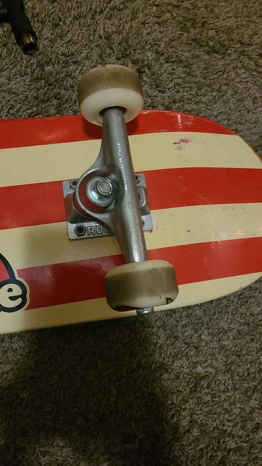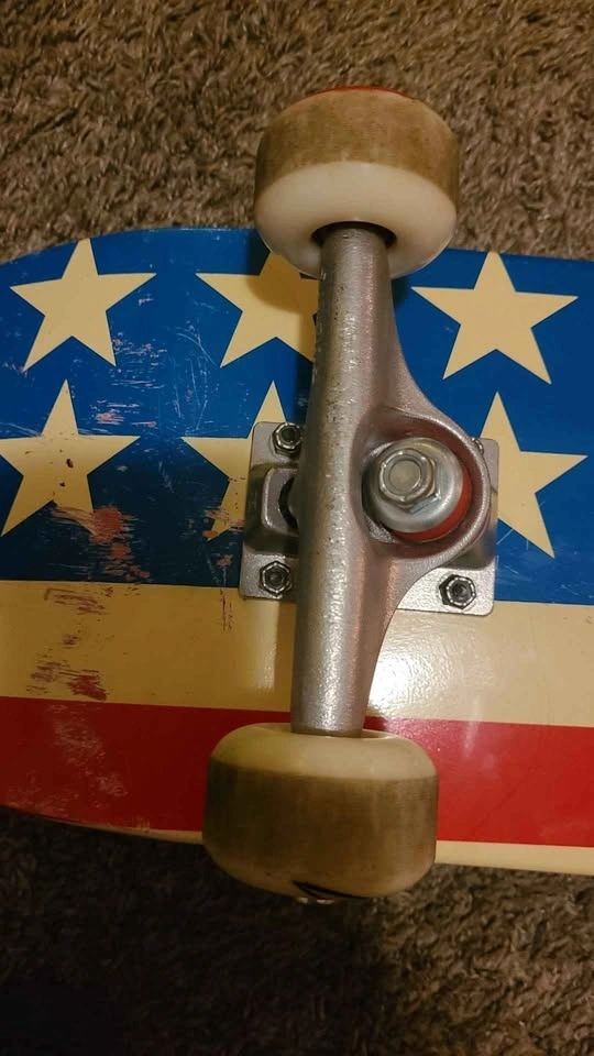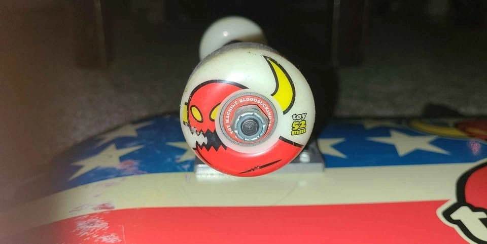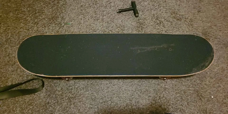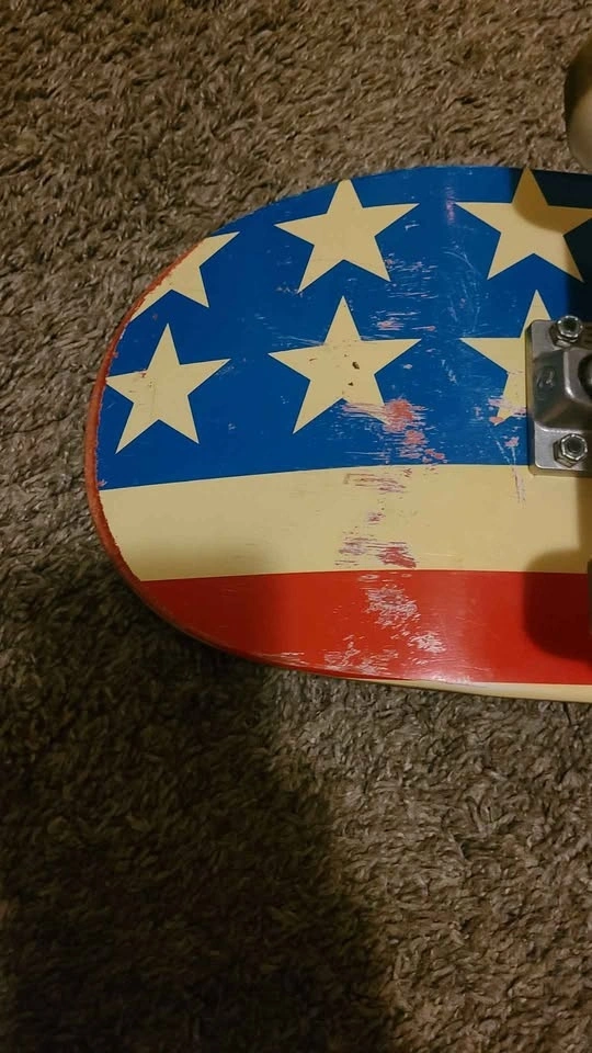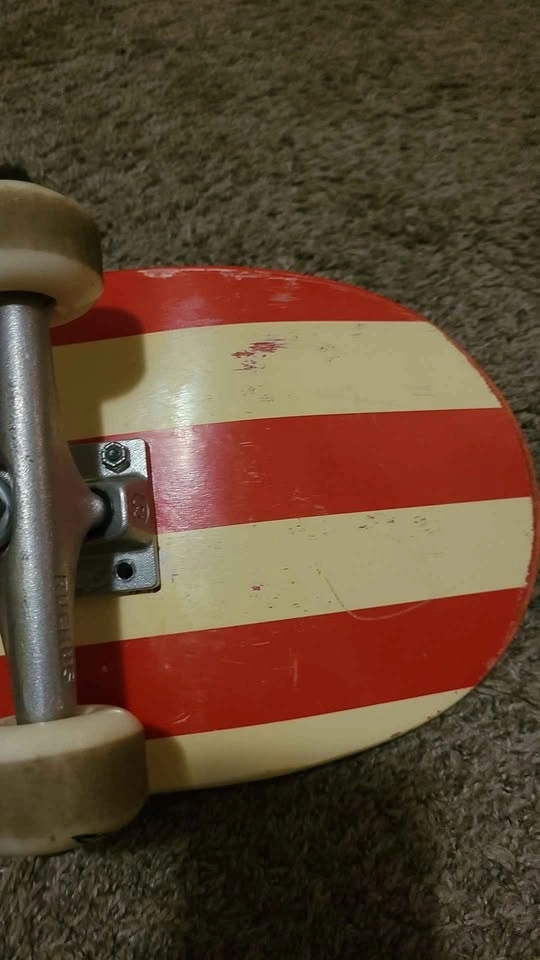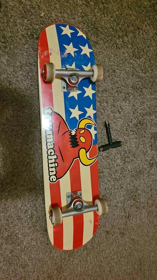 I think its a 7.75. Minor scratches on deck and trucks. Minor scuffs on griptape. Missing bolt in pictures but I found it. Can include t tool.