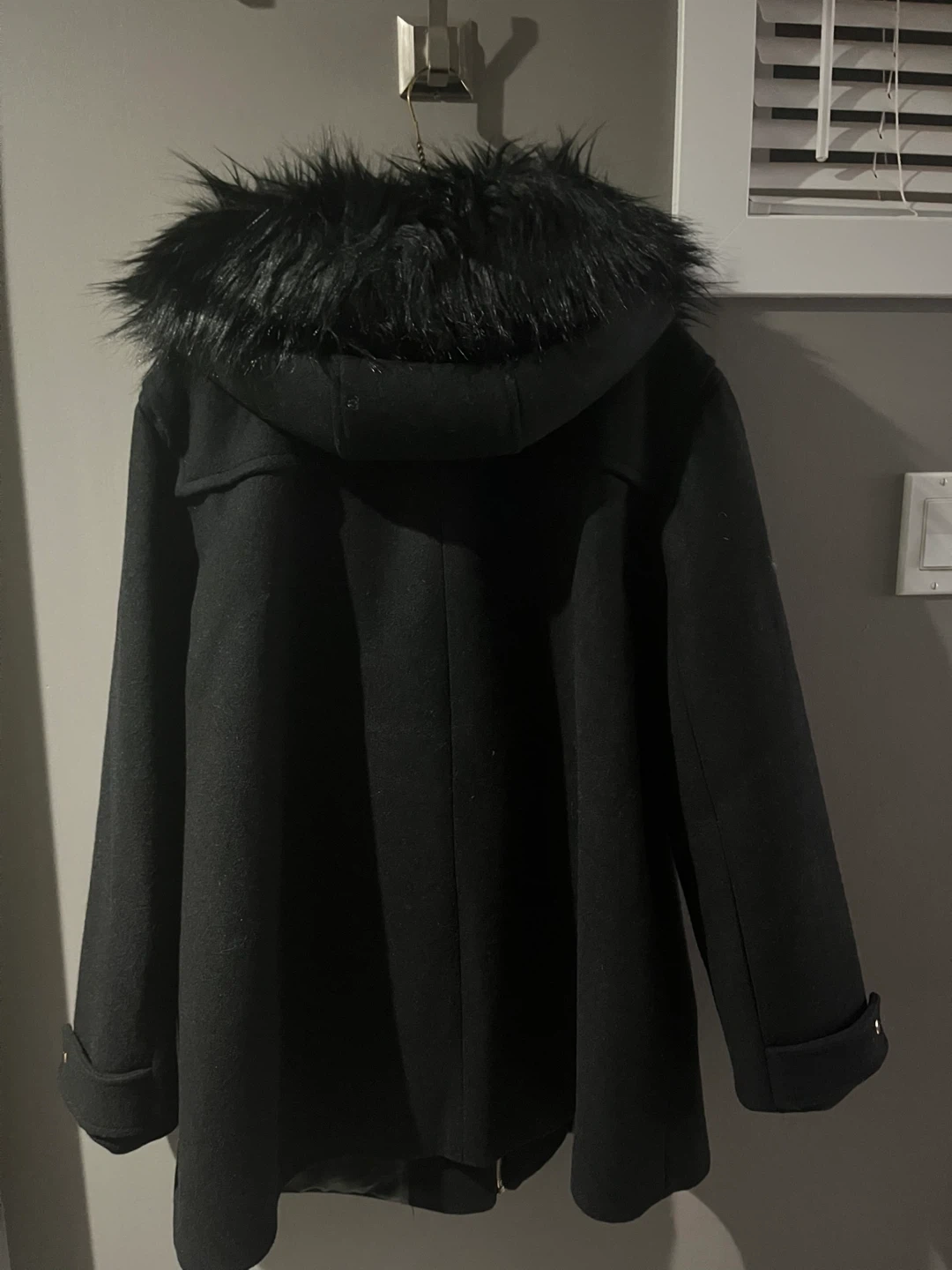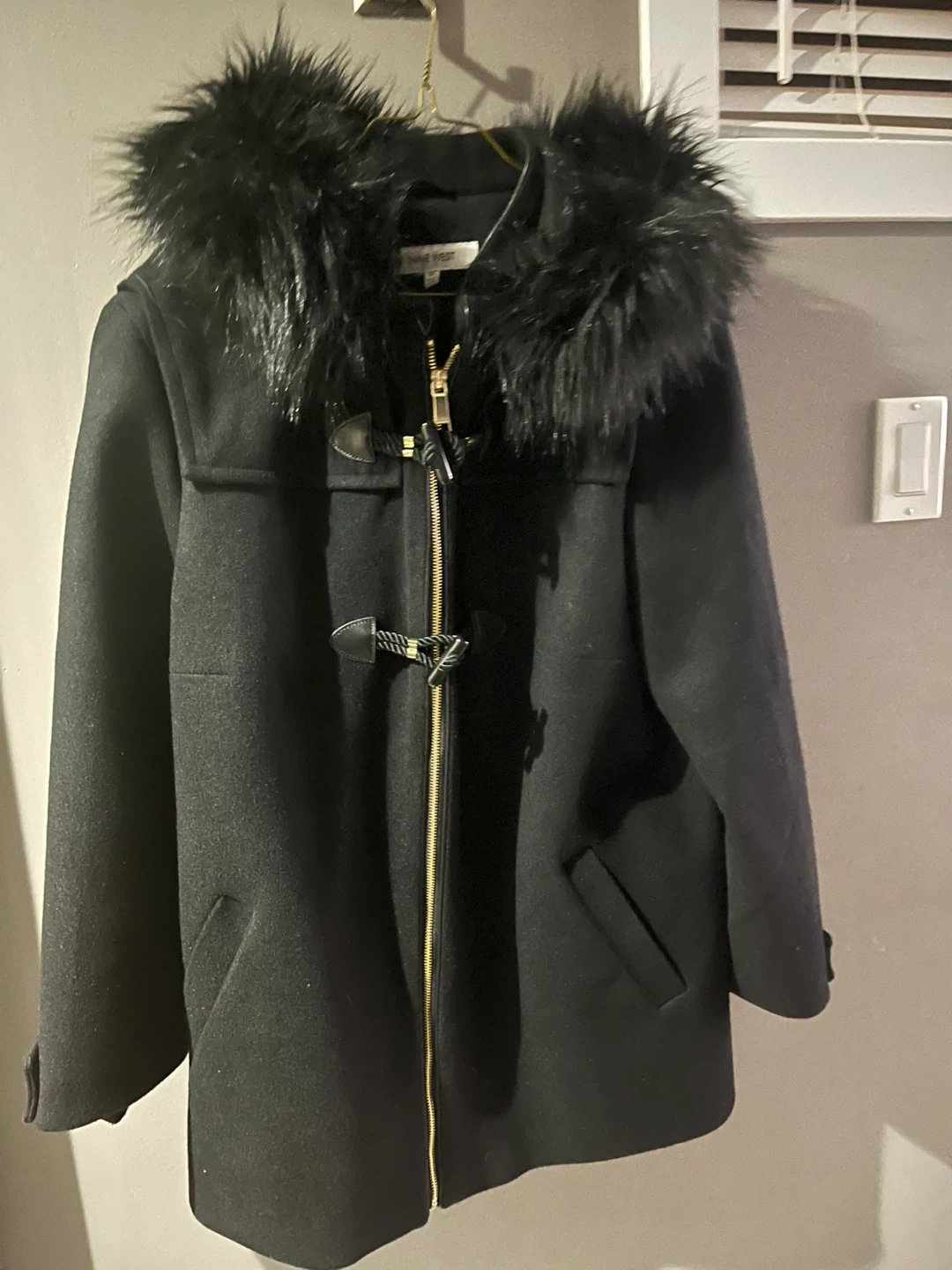 New Black Wool Blend Coat with gold zipper & buttons on sleeve. Japanese style accent closure on front. Black fur hood.
