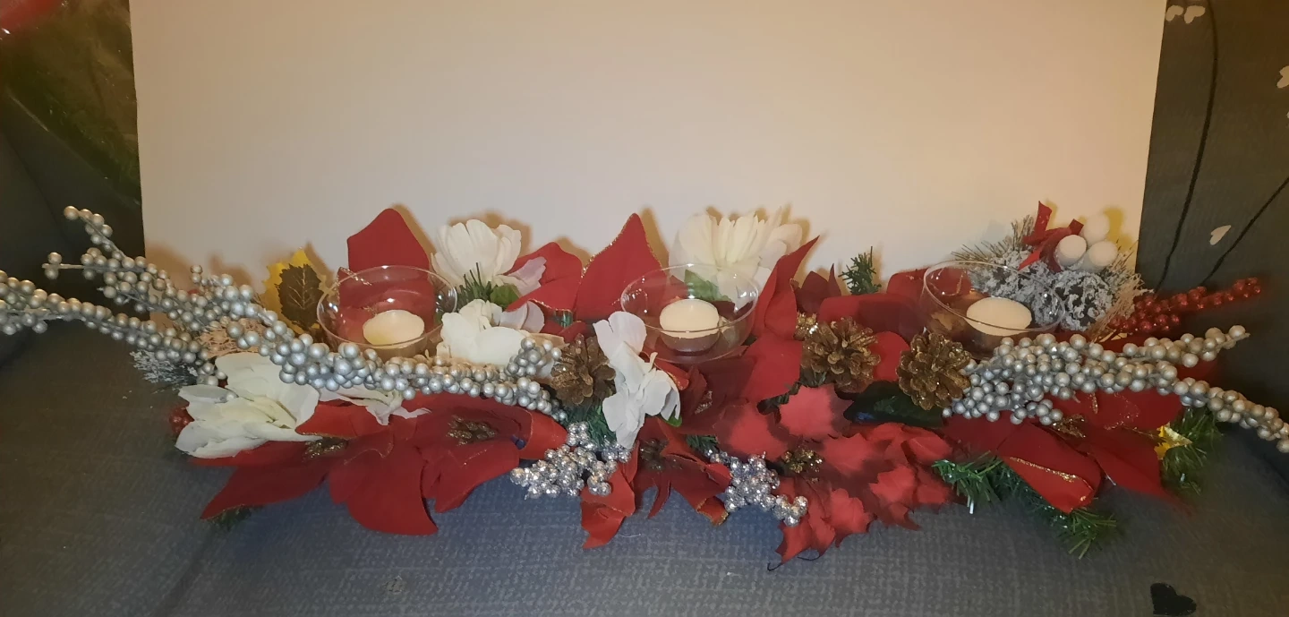 Add a touch of festive charm to your home with this lovely Christmas floral centerpiece! It features beautiful red poinsettias, white flowers, pine cones, and silver berries, all surrounding three glass candle holders. Perfect for your holiday table or mantelpiece! Pool noodle. Hand made
