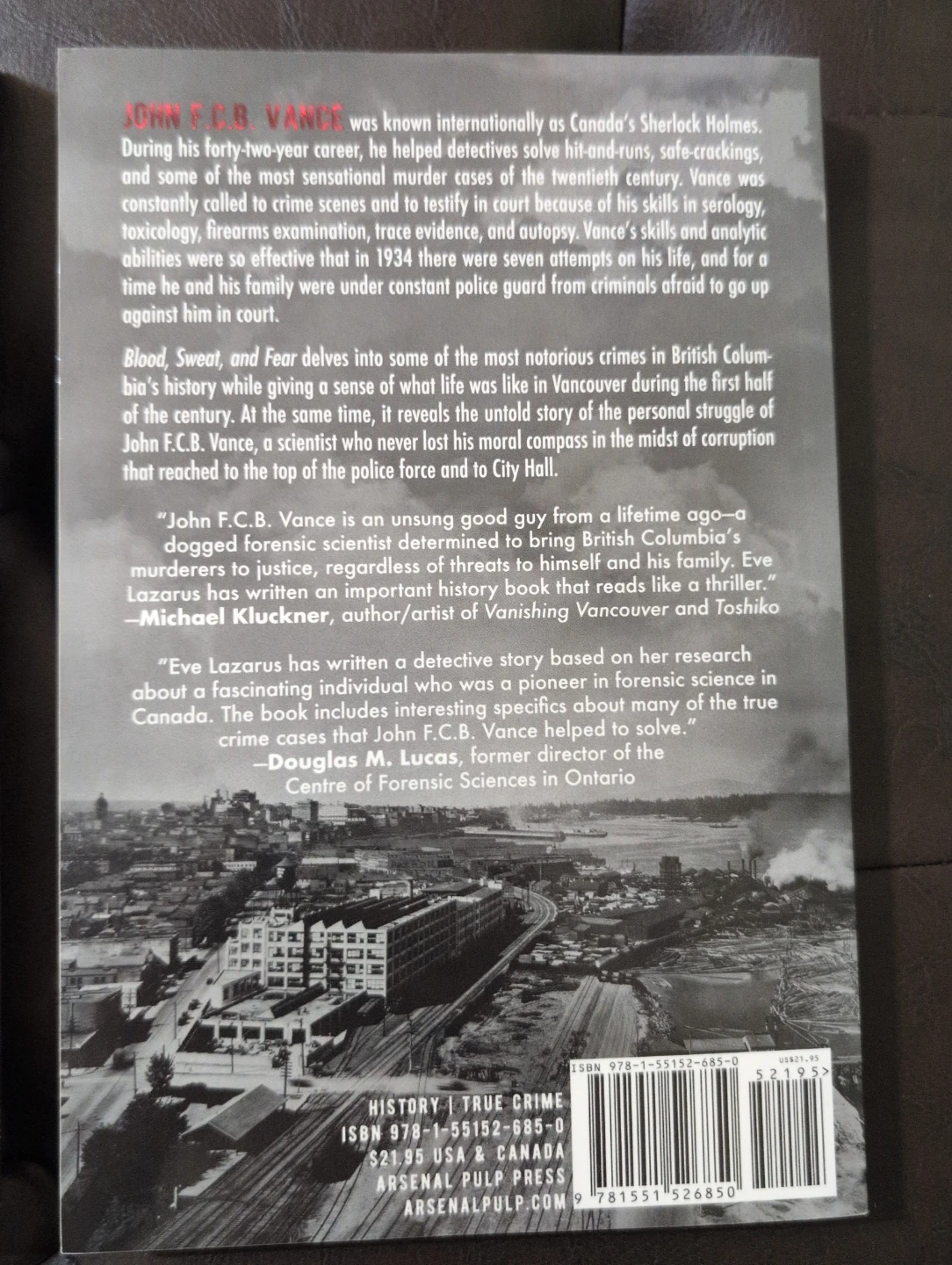 Selling 2 Vancouver area true crime books together: Vancouver Confidential, edited by John Belshaw, and Blood, Sweat, and Fear by Eve Lazarus. Both books delve into aspects of Vancouver's history and true crime stories. Vancouver Confidential includes essays from various writers, while Blood, Sweat, and Fear tells the story of Vancouver's first forensic investigator. Brilliant read into some dark history. Books are like new.