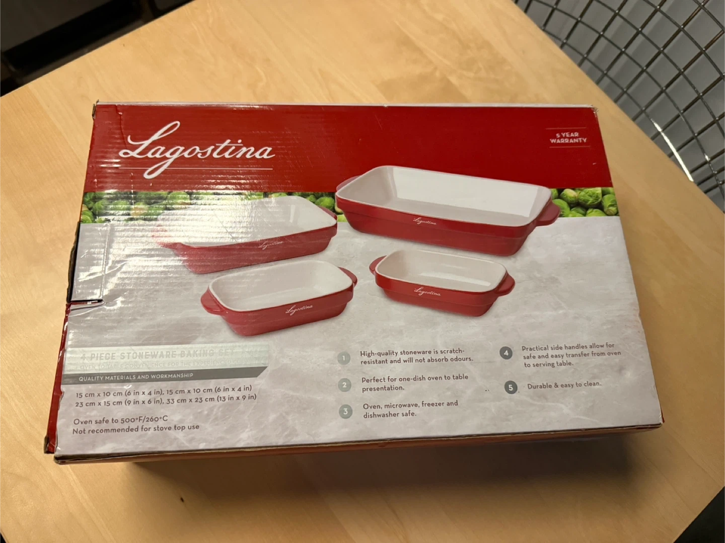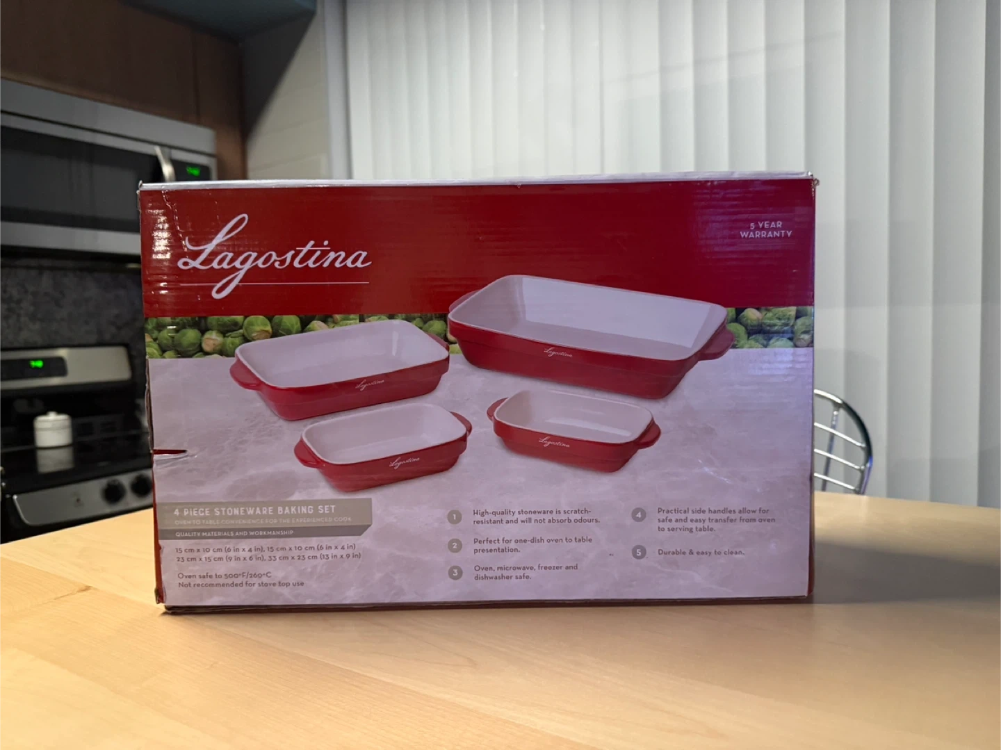 Selling a brand new Lagostina 4-piece stoneware baking set! It's oven safe to 500°F/260°C and not recommended for stovetop use.
