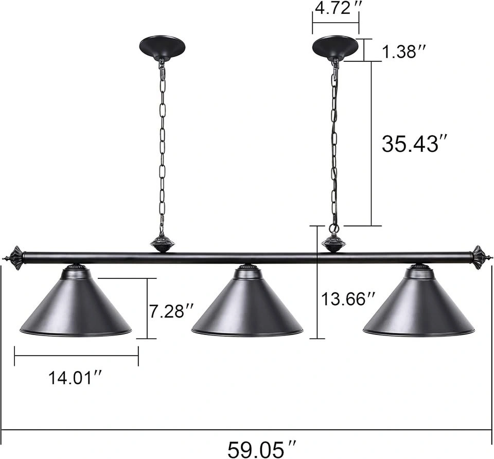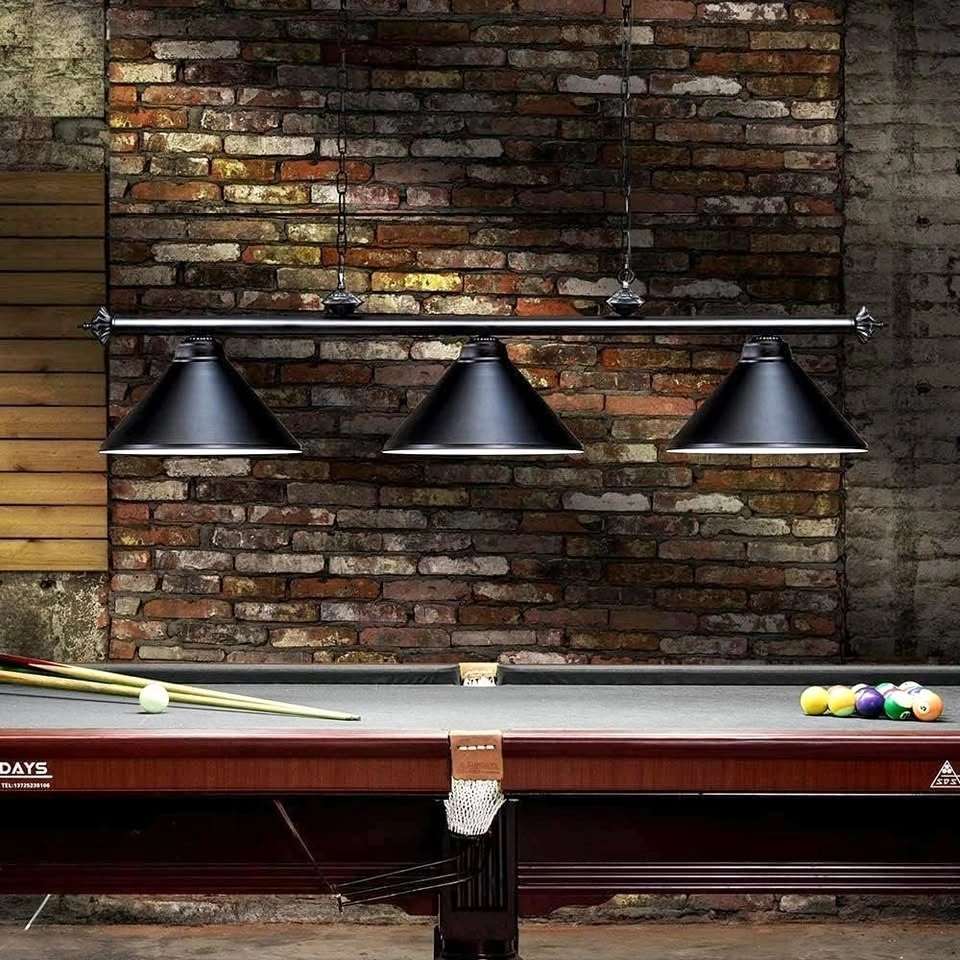 A modern, metal billiard light designed with three wide ceramic-metal shades to deliver bright, even table illumination with minimal shadows. Sized at 59" × 14.1" × 13.5" and adjustable with a 35.4" chain, it fits 7–8 ft pool tables perfectly. The sturdy matte-black finish adds a clean, classic look ideal for game rooms, bars, dining spaces, or kitchen islands. Compatible with three E26 bulbs (max 60W each) so you can tailor the lighting style to your space.