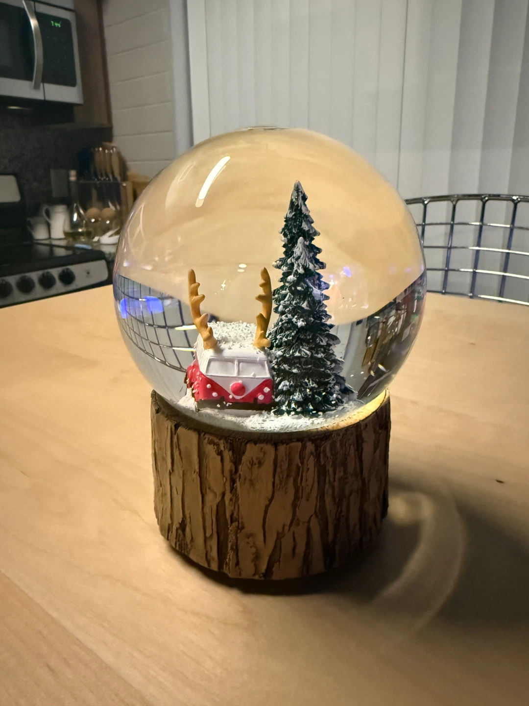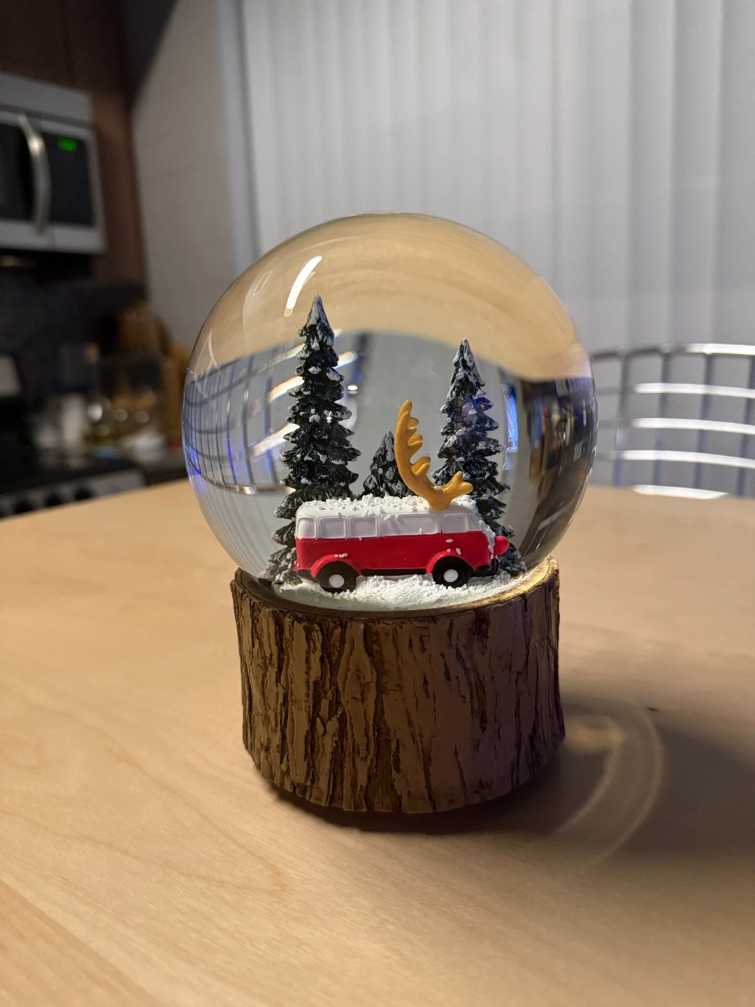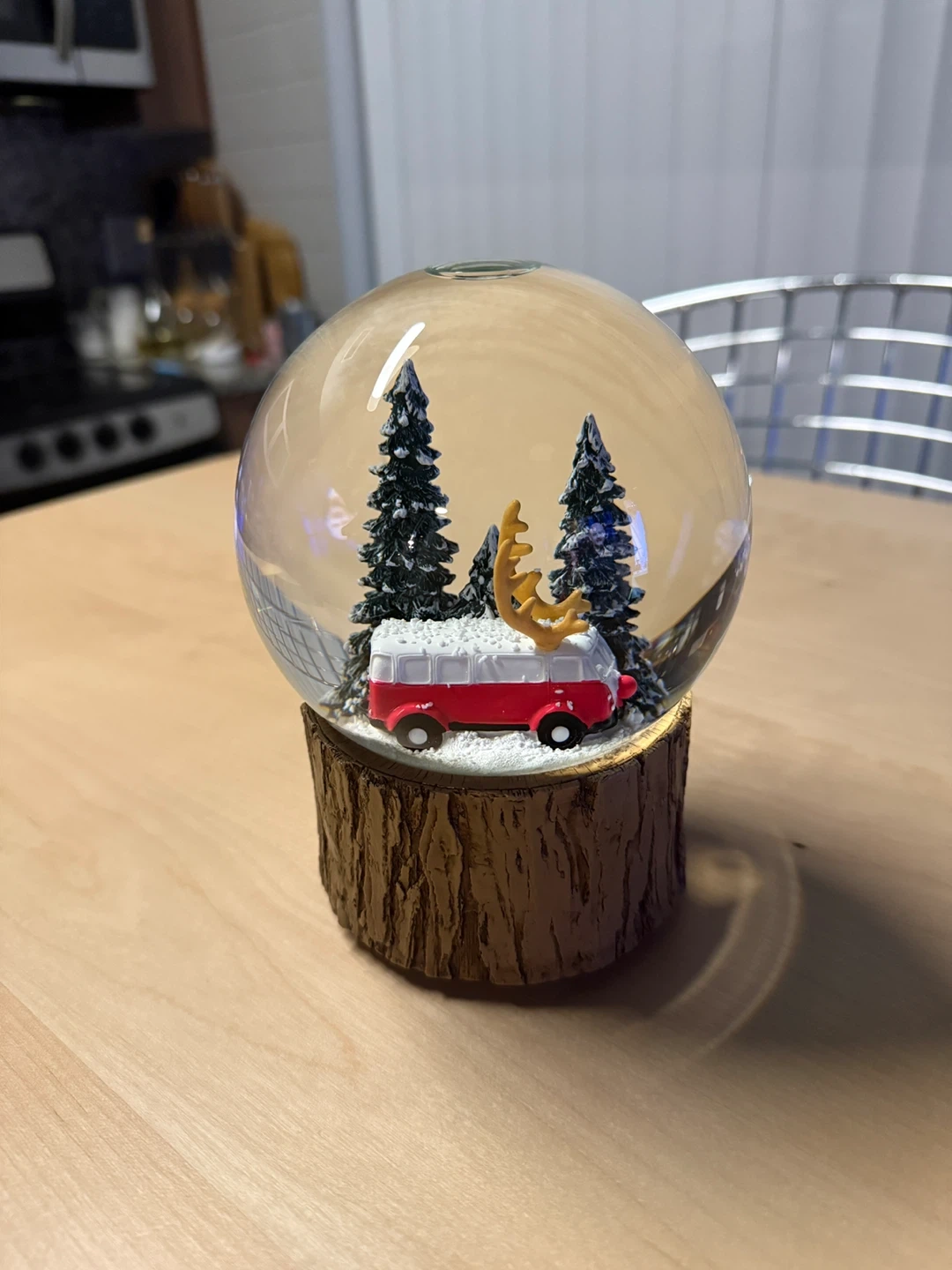 Selling a cute Indigo snow globe! It features a red VW bus with reindeer antlers, nestled among pine trees. The base is a faux wood design. It's in great condition and would make a lovely addition to any room