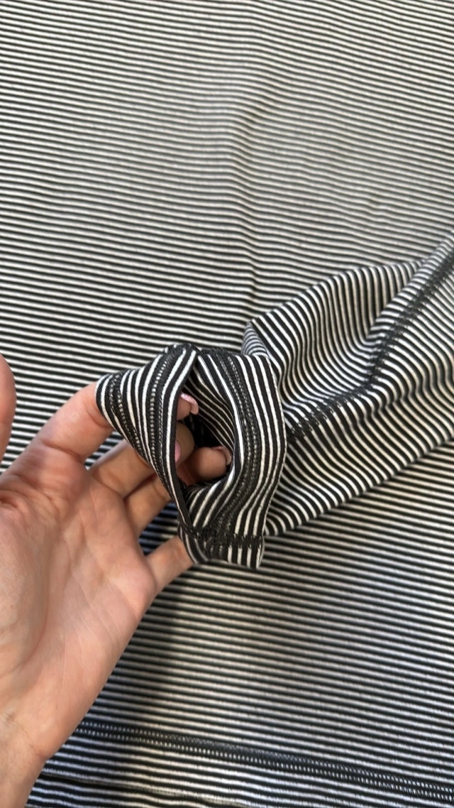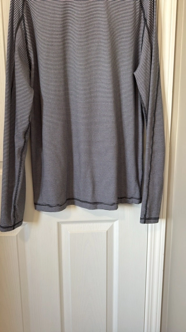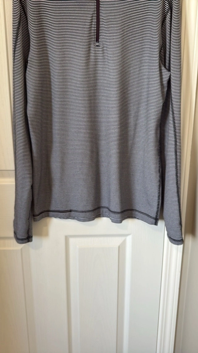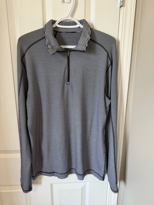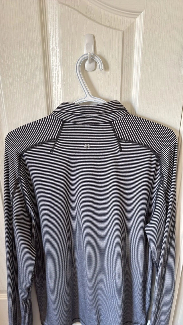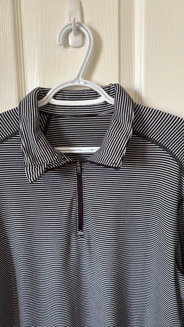 Excellent condition Lululemon Surge Warm 1/2 Zip. Color: Mini Pop Stripe Black White. Key features: sweat-wicking Rulu™ fabric is four-way stretch. LYCRA® fibre adds stretch and shape retention. Hidden thumb loops help keep your sleeves down under layers. Reflective details help keep you visible in low light. No size dot. Measurements: 21 inches pit to pit, 29 inches top to bottom. Smoke free home. Pick up in Wolf Willow SE. For Sale By: Owner