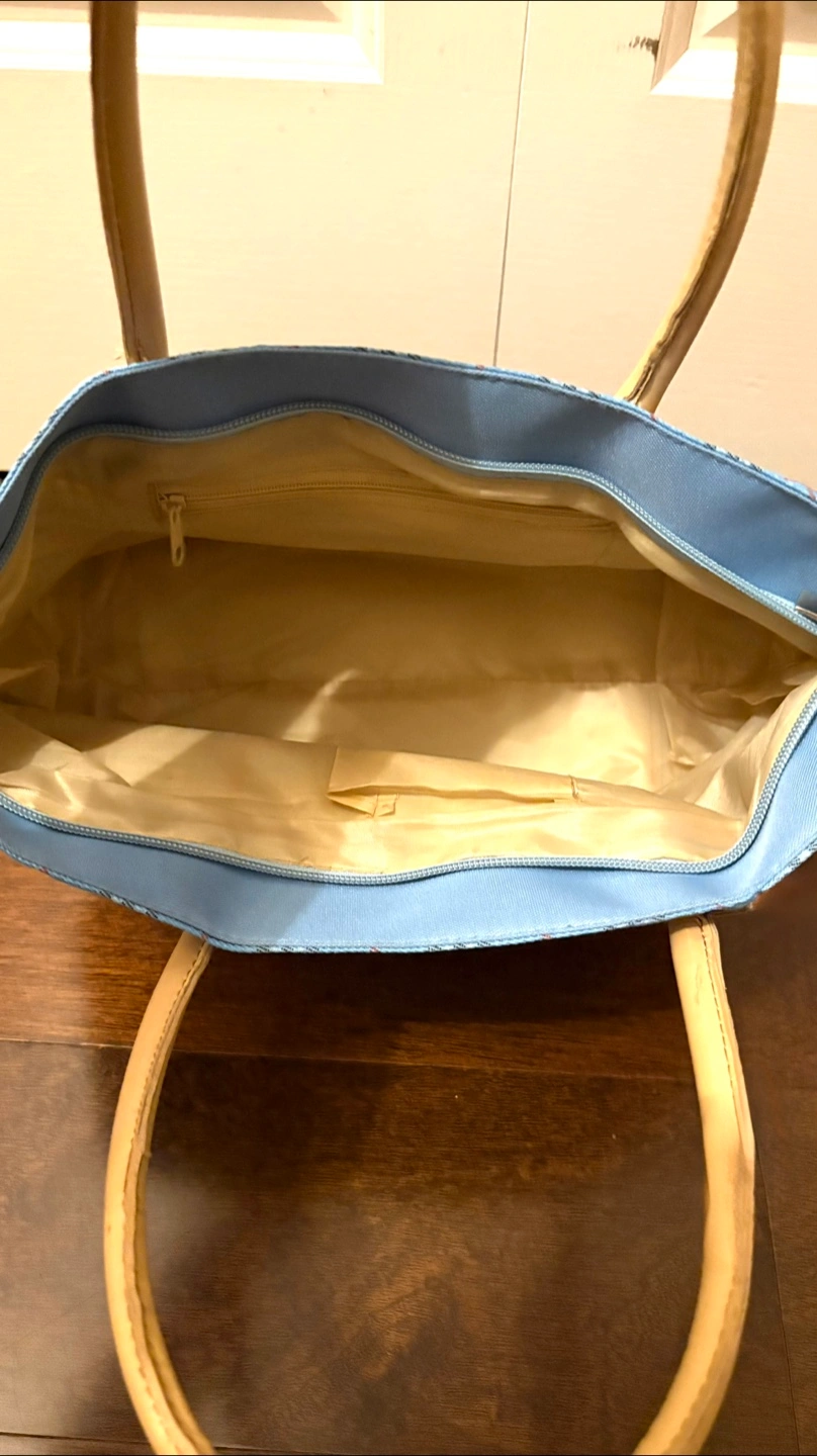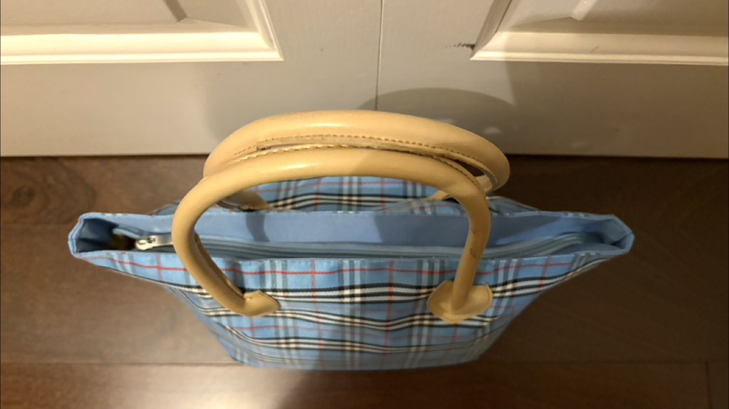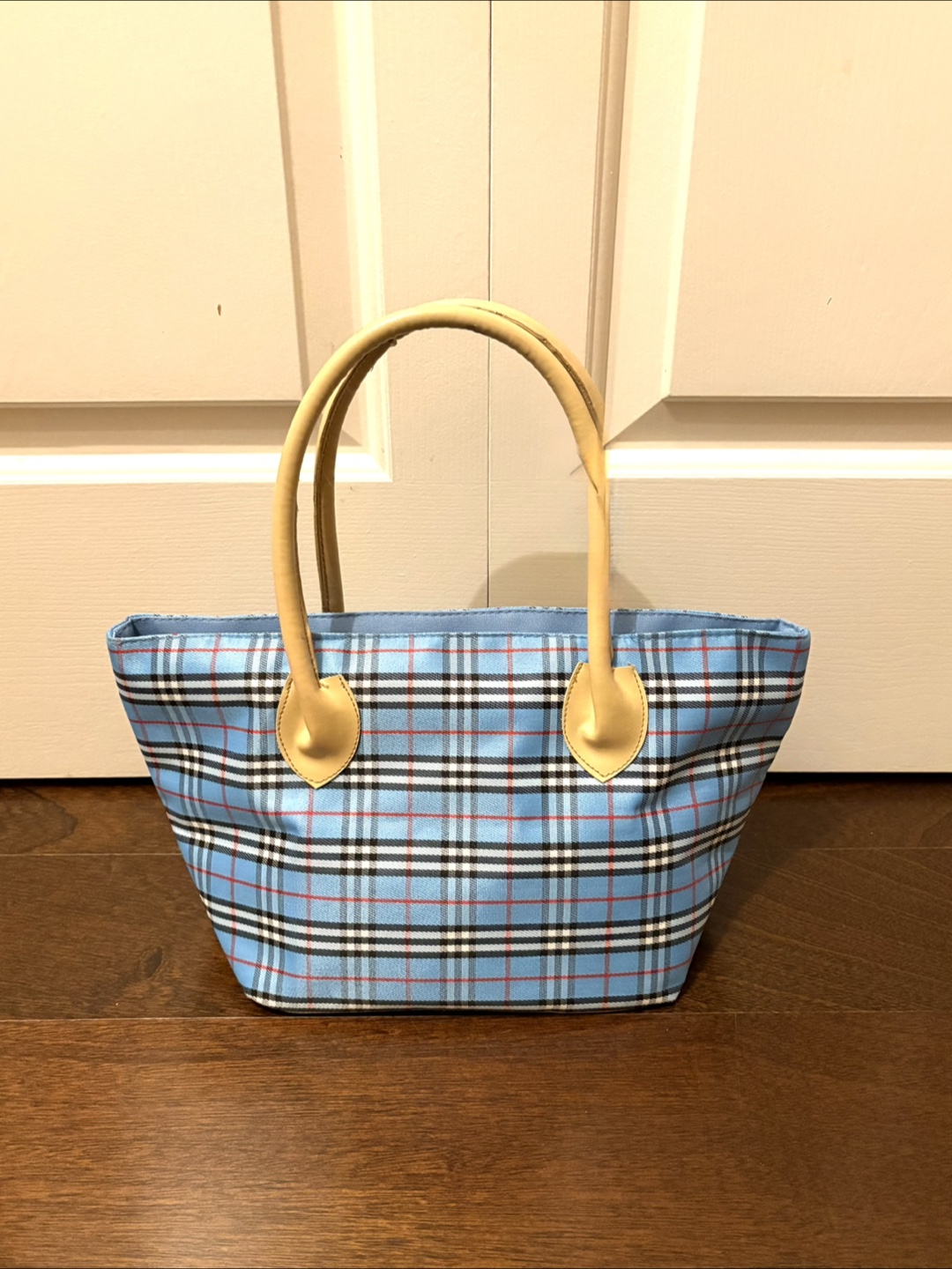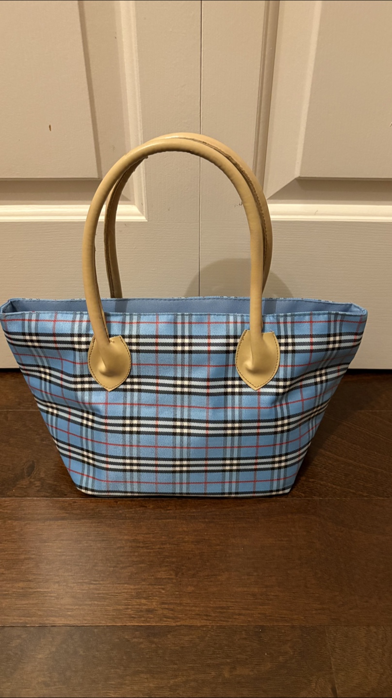 Selling a cute Burberry inspired tote bag in a light blue plaid pattern!