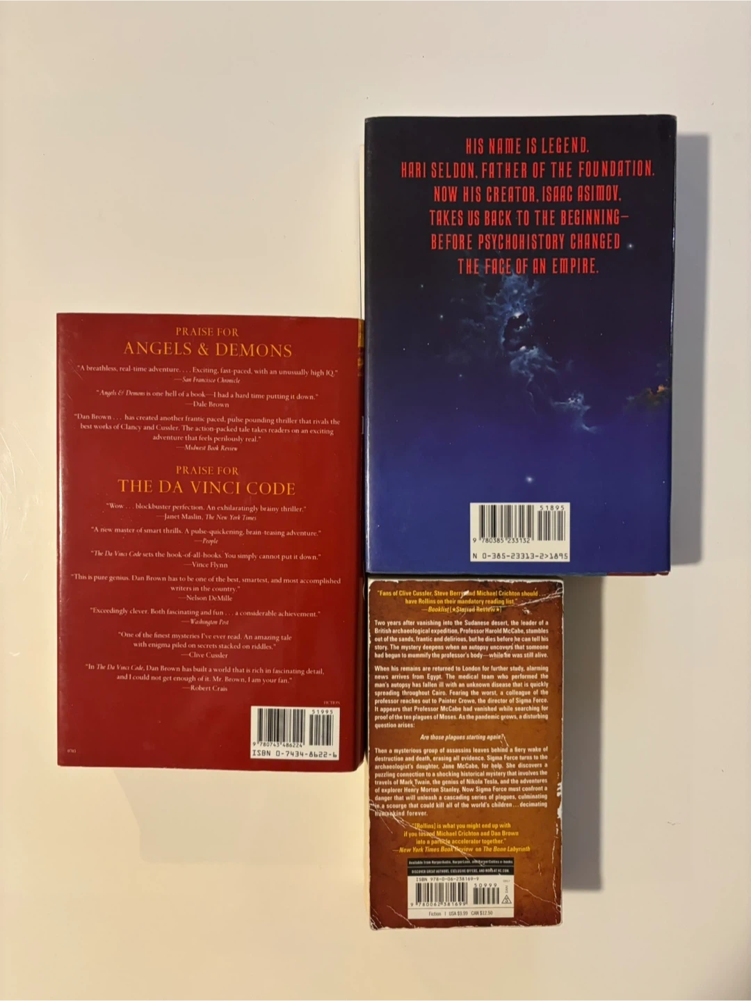Selling a bundle of three paperback books. Includes Dan Brown's Angels & Demons, Isaac Asimov's Prelude to Foundation, and James Rollins' Seventh Plague. All in good condition and ready for a new reader!
