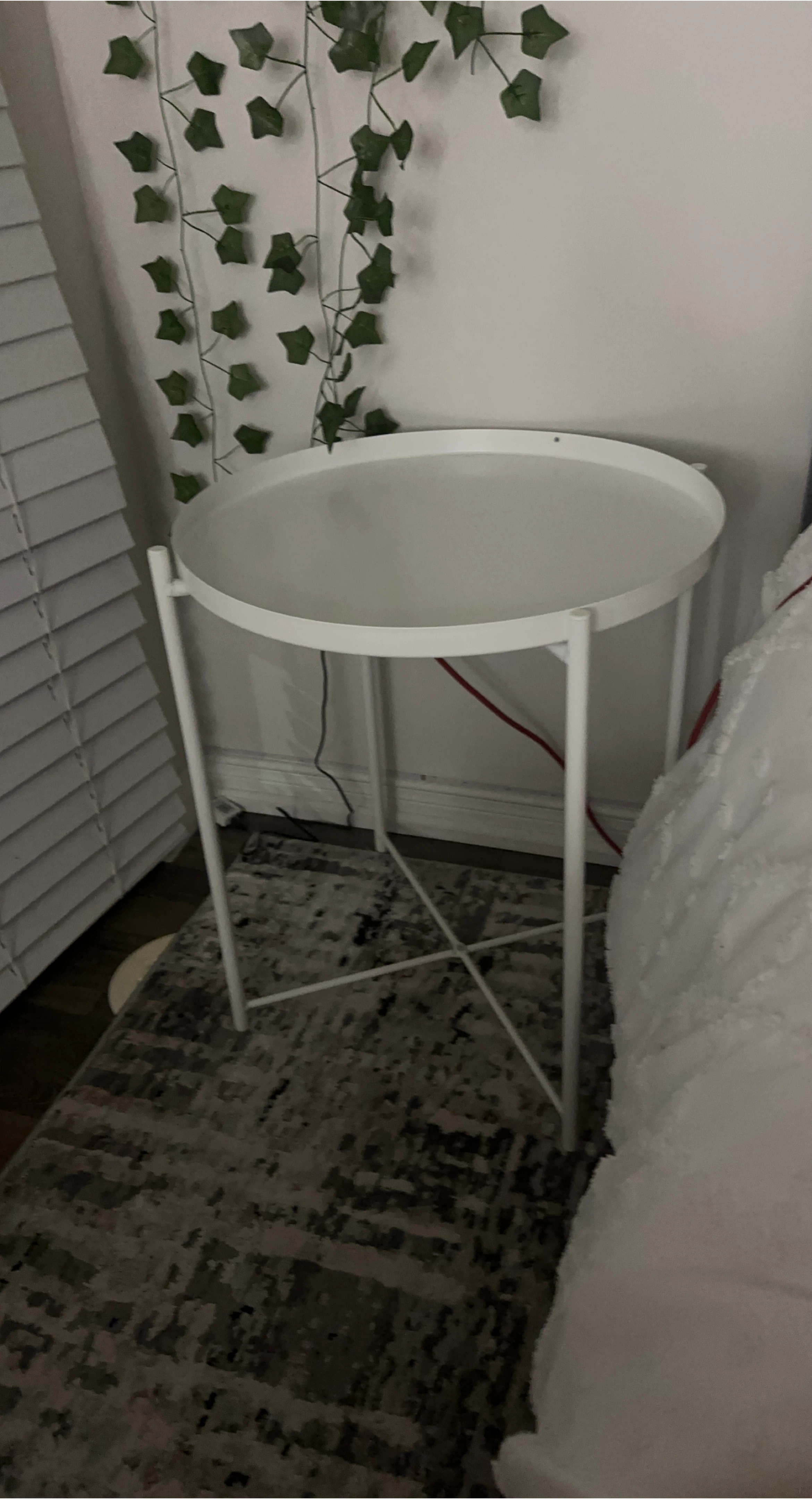 Selling a simple white round side table. It's perfect for small spaces or as a bedside table. The table is in good condition and has a clean, minimalist look that would fit well in any room