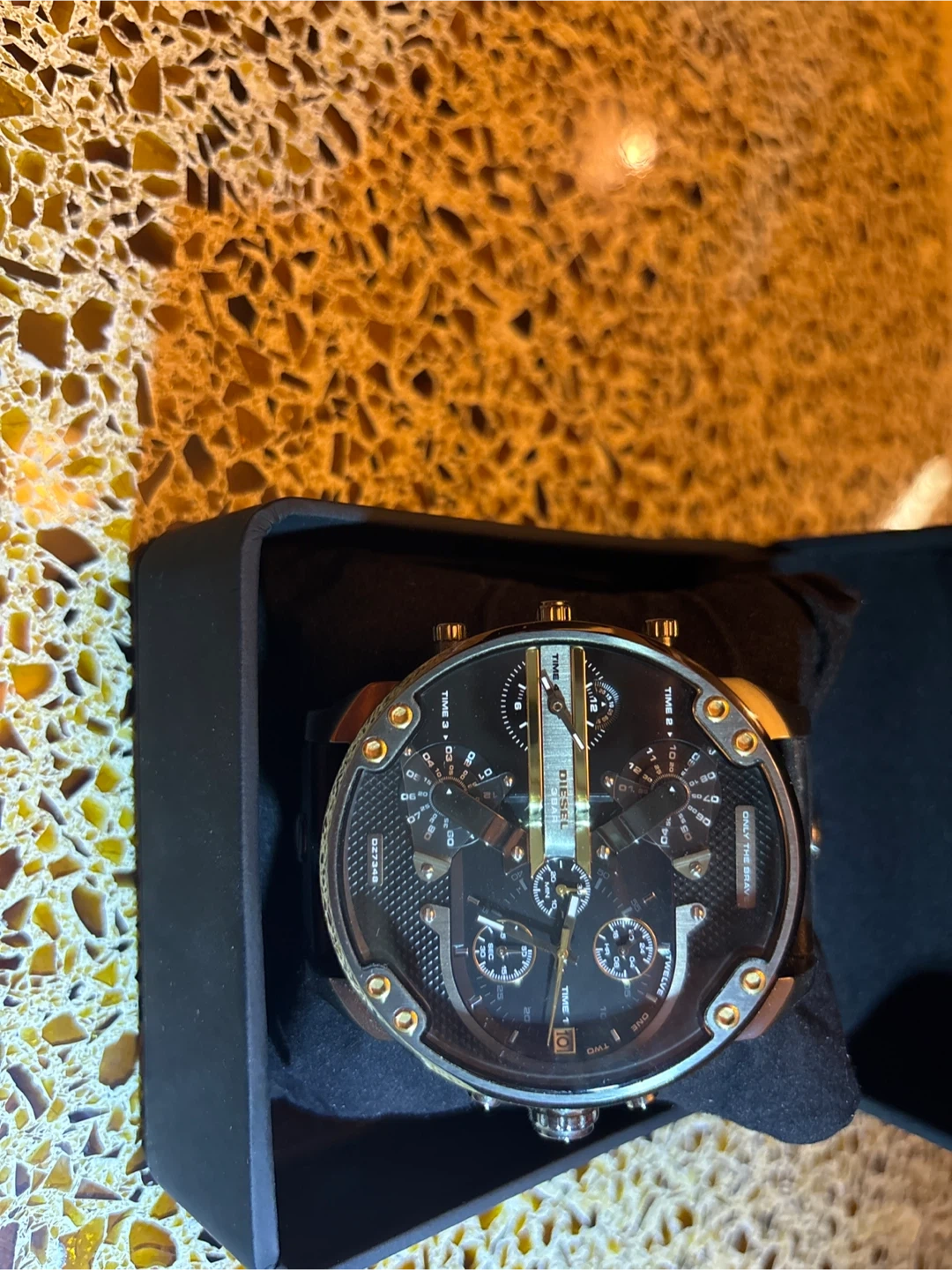 Diesel Mr. Daddy 2.0 watch in new condition! It comes with the box. The watch has a black leather strap and a unique, detailed face. If you're looking for a statement piece, this is it!