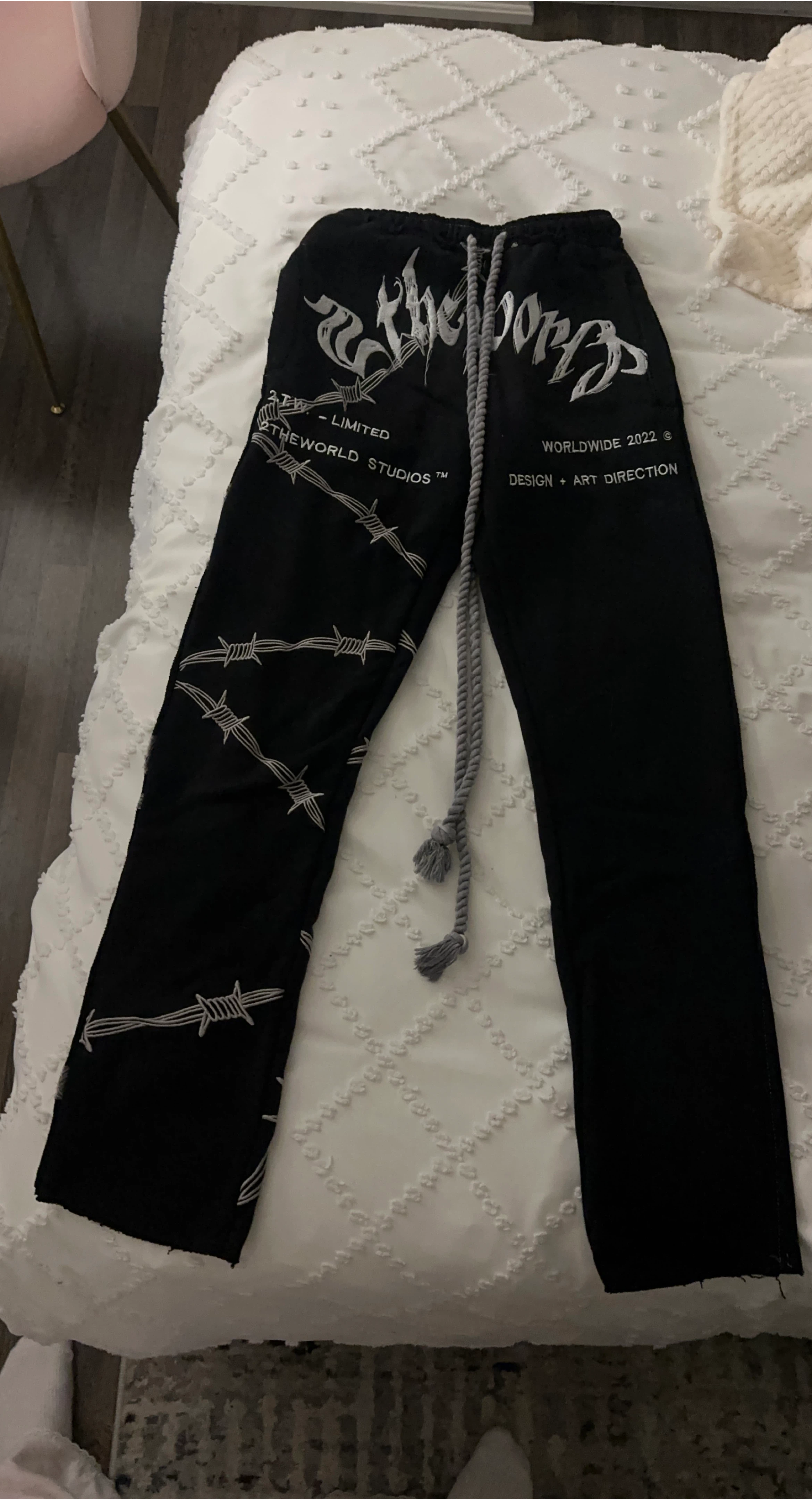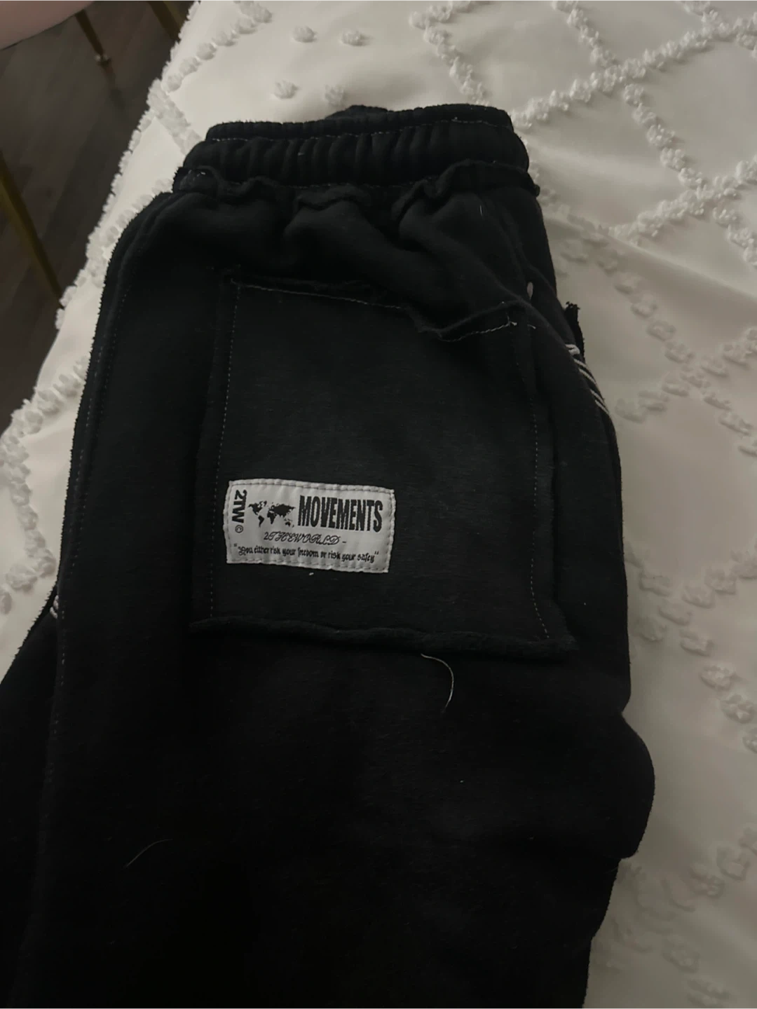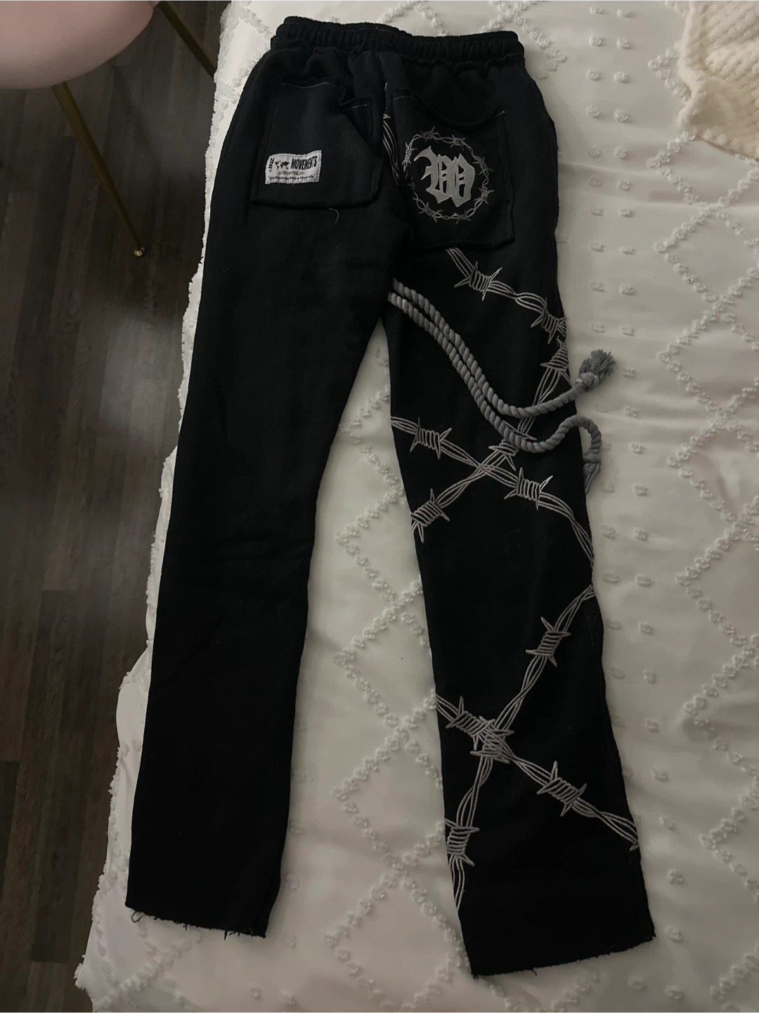 Selling a pair of Movements black sweatpants with a unique graphic design. They're a size small and feature a drawstring waist. The design includes barbed wire and text details!