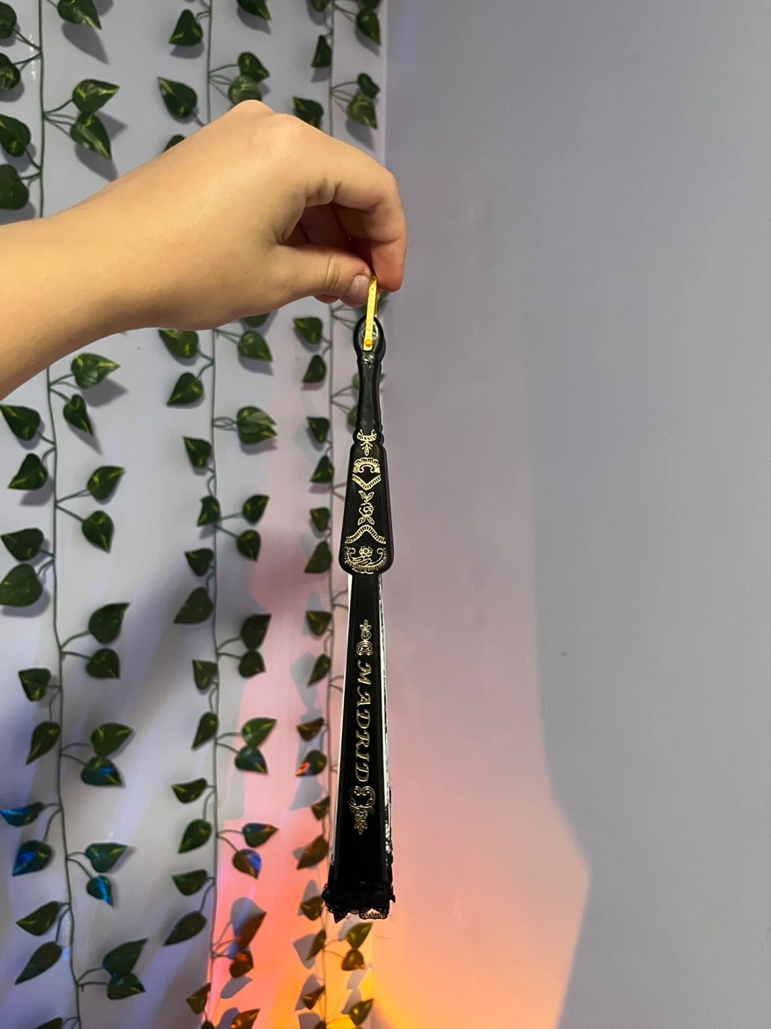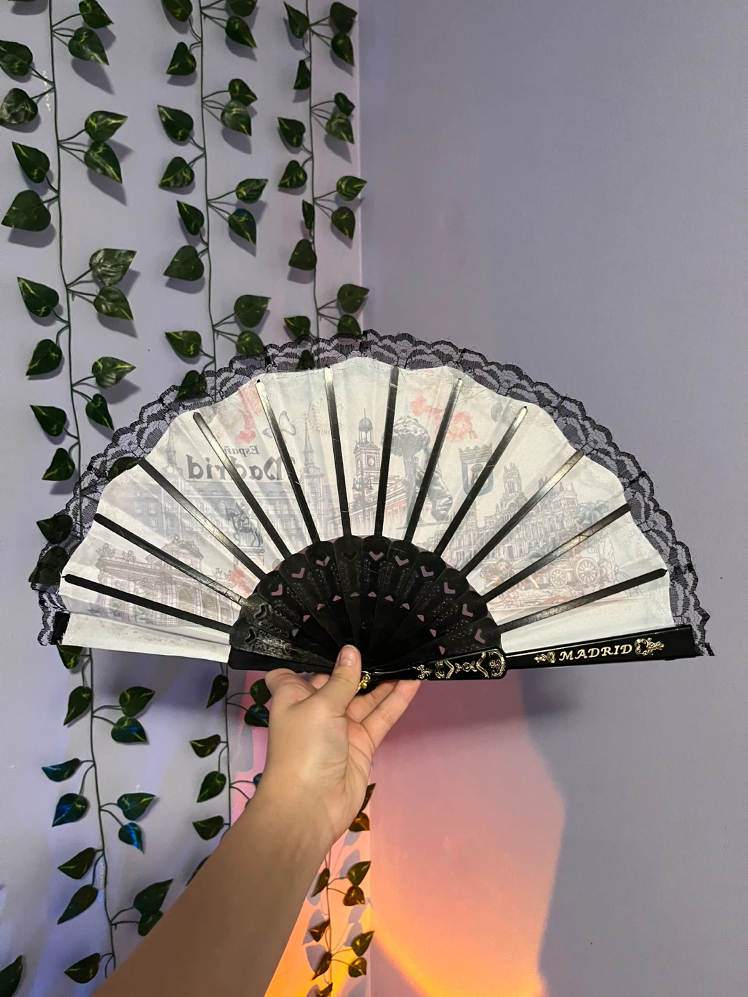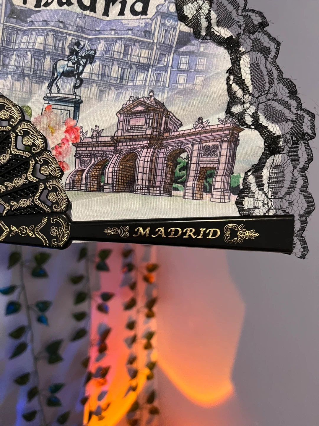 Selling a lovely souvenir fan from Madrid! It features beautiful illustrations of the city's landmarks and a delicate black lace trim. Perfect for adding a touch of Spanish flair to your home or to complement your style✨