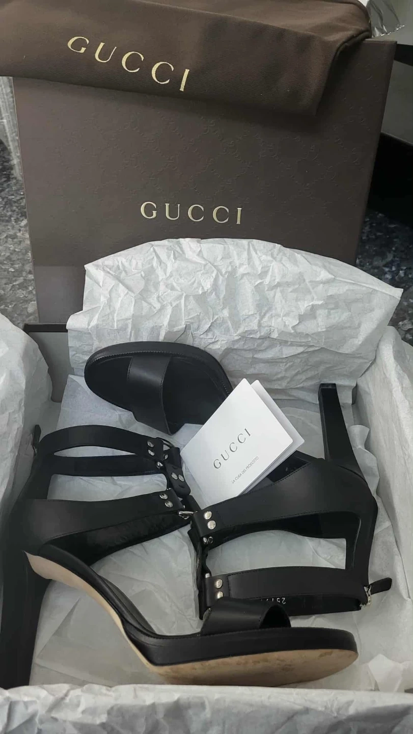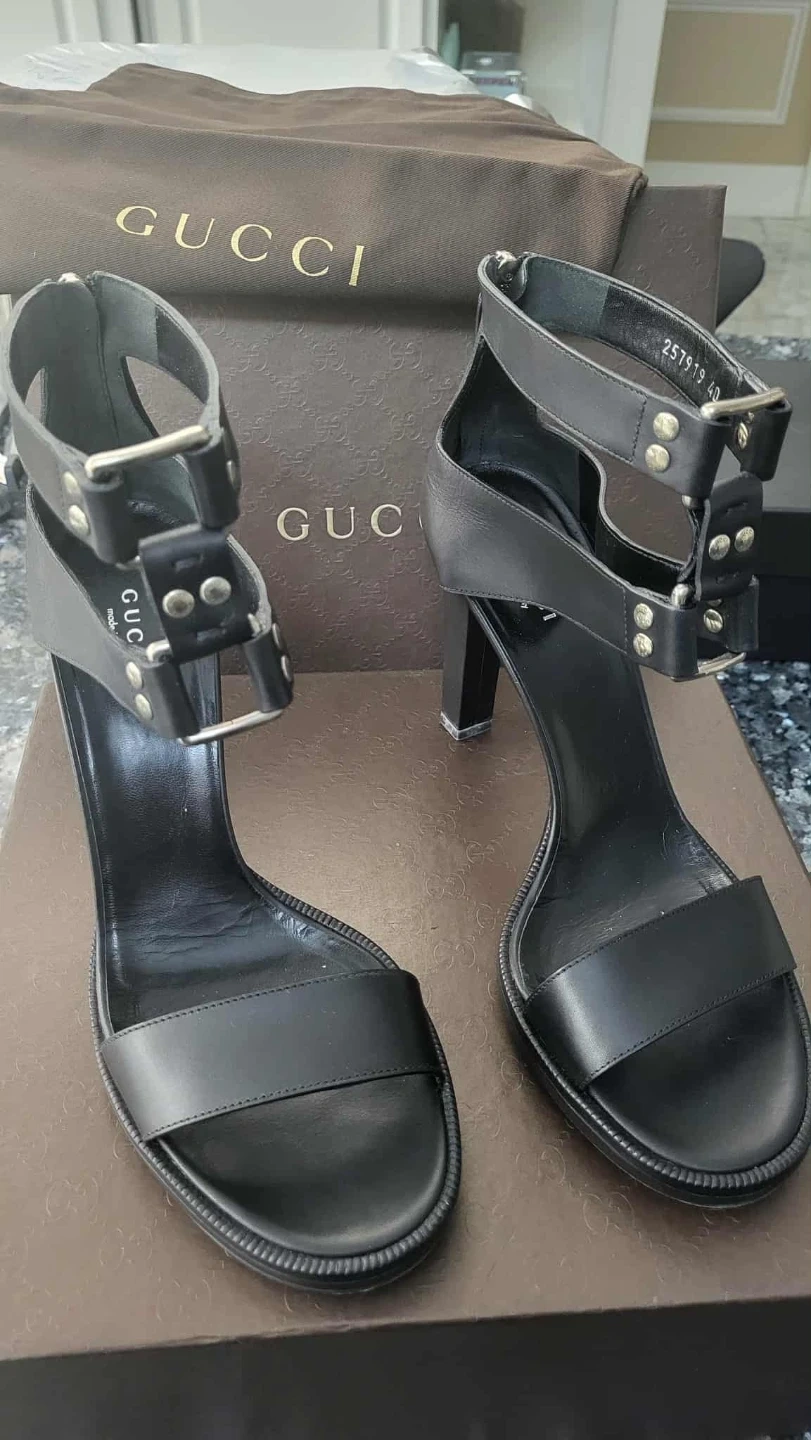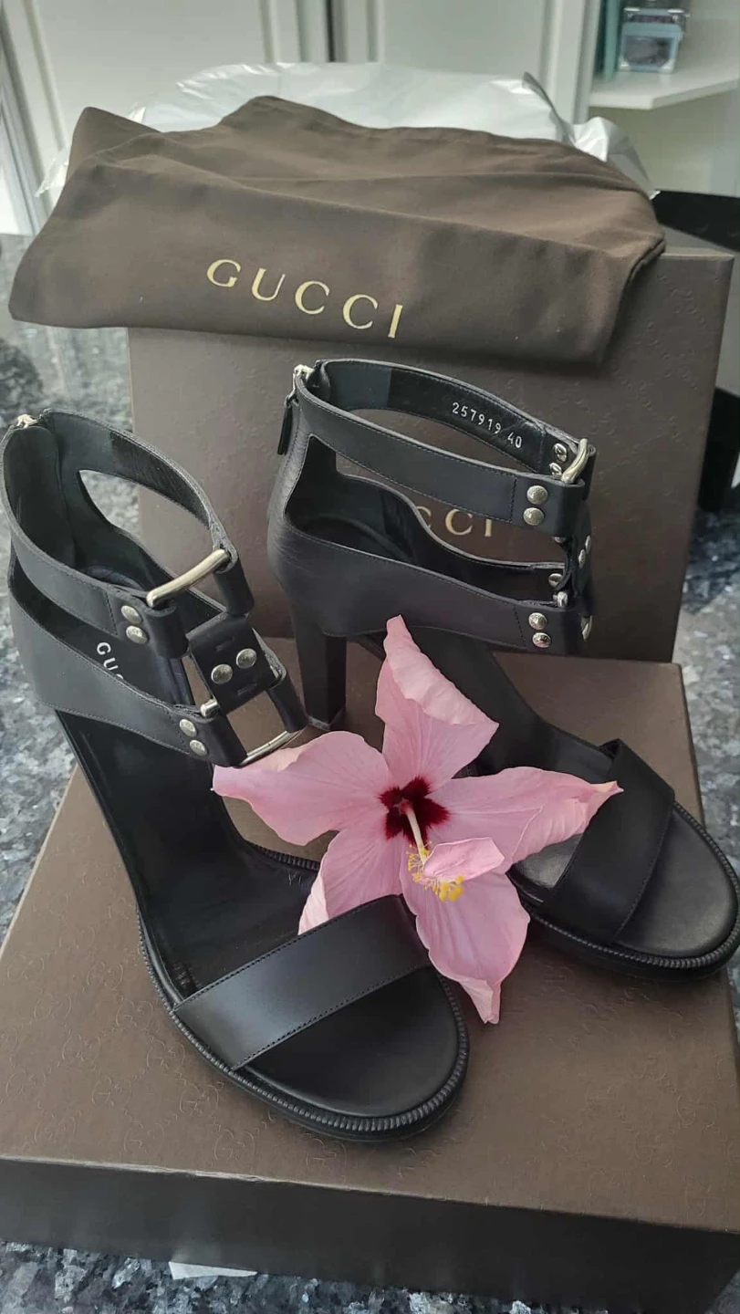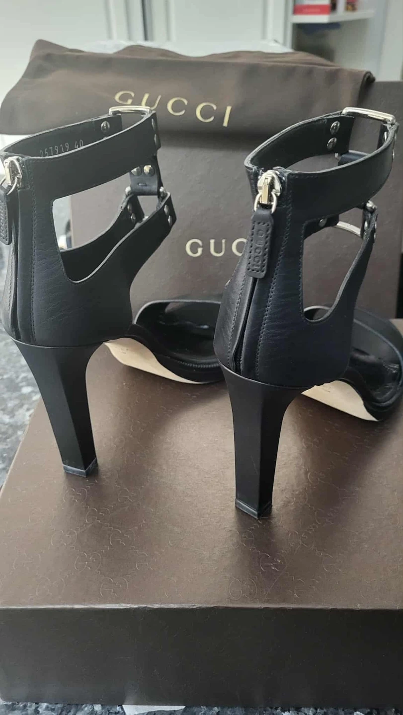 Selling a pair of stylish Gucci black leather heeled sandals in size 40. These heels are in great condition and come with the original box and dust bag. Perfect for a night out or special occasion!