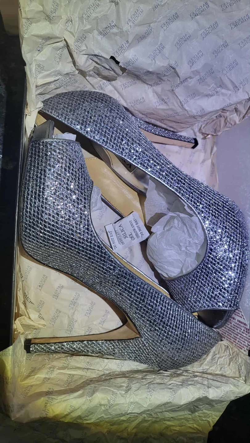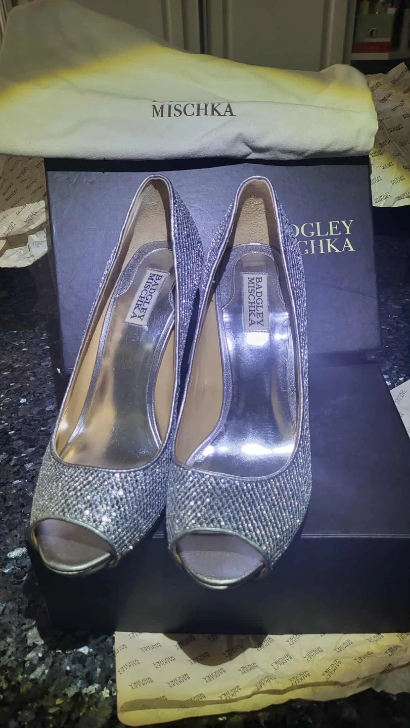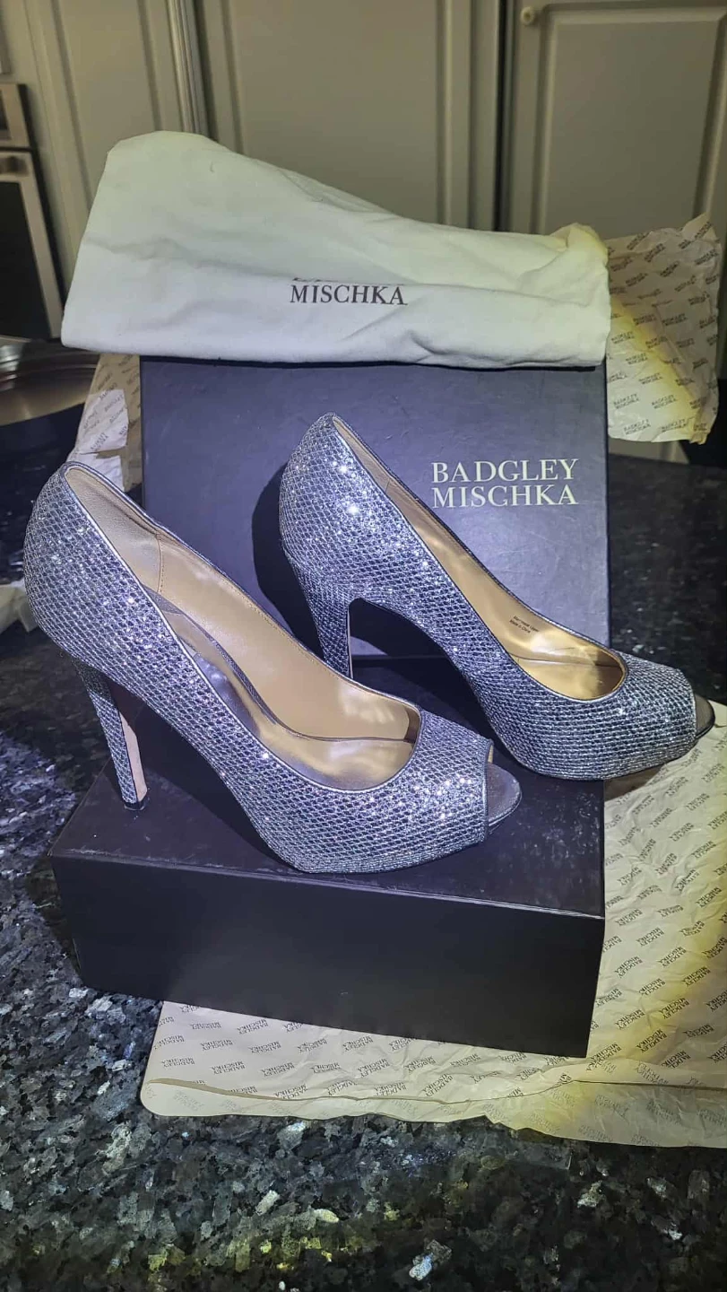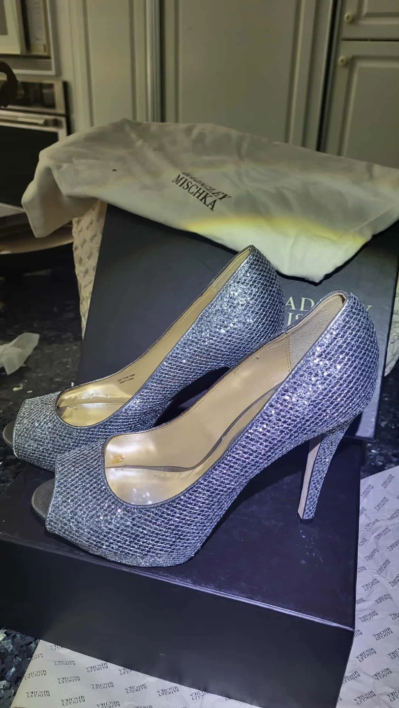 These Badgley Mischka heels are perfect for a special occasion! They're a beautiful silver glitter and come with the original box and dust bag. Wear them once. Size 10. Super comphy..