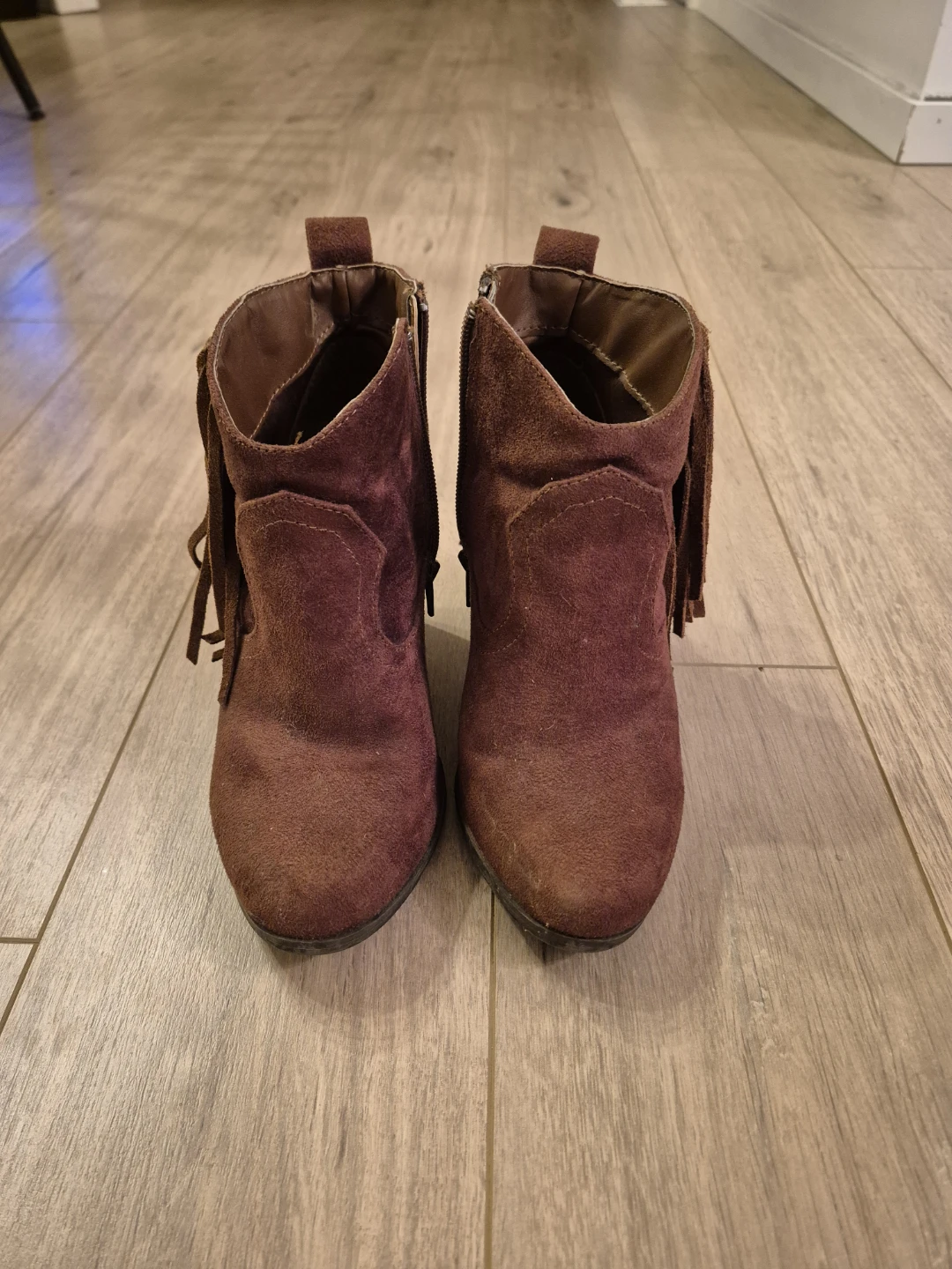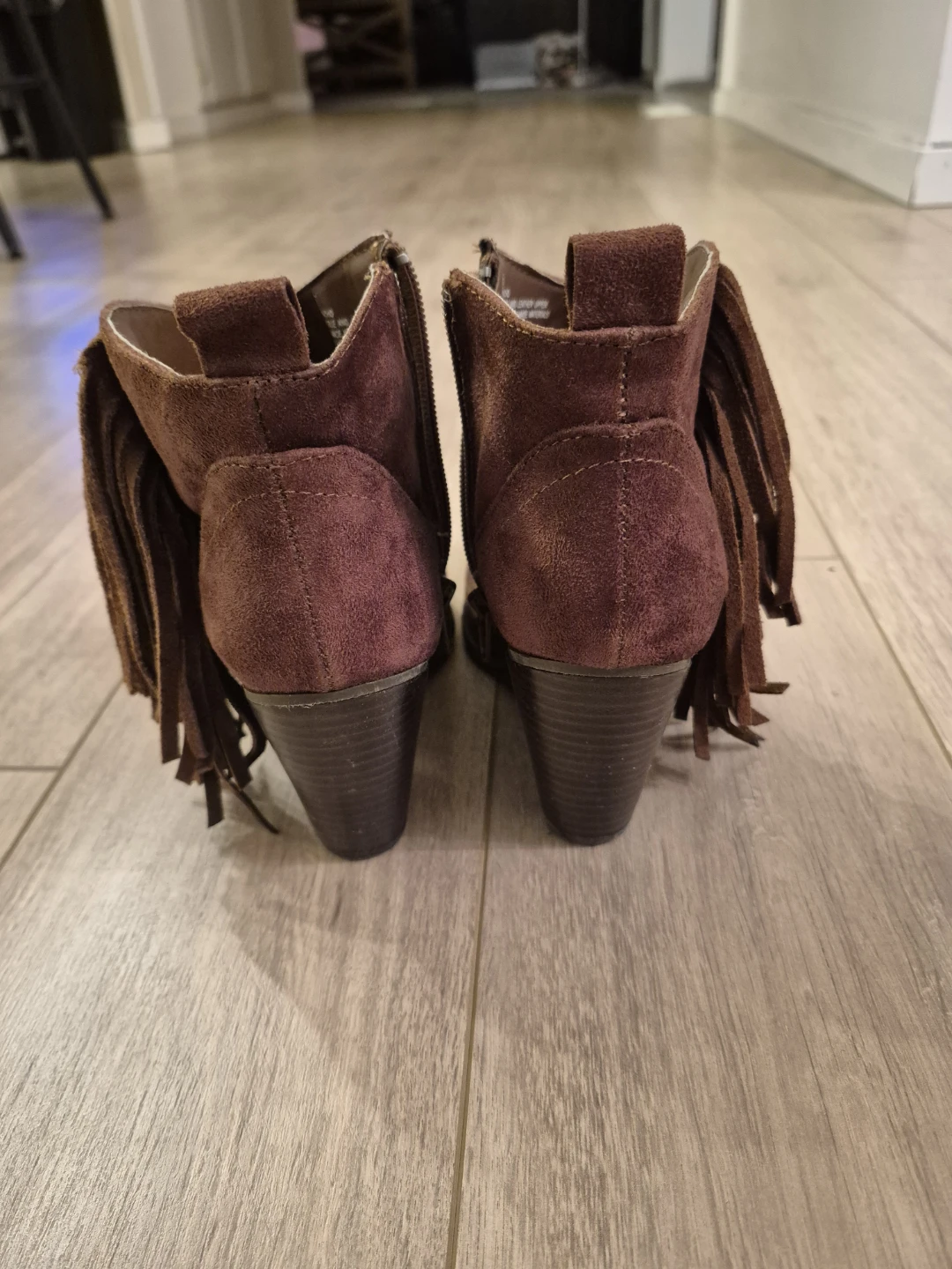 Selling a pair of brown suede fringe booties worn twice. Size 6 $40 obo