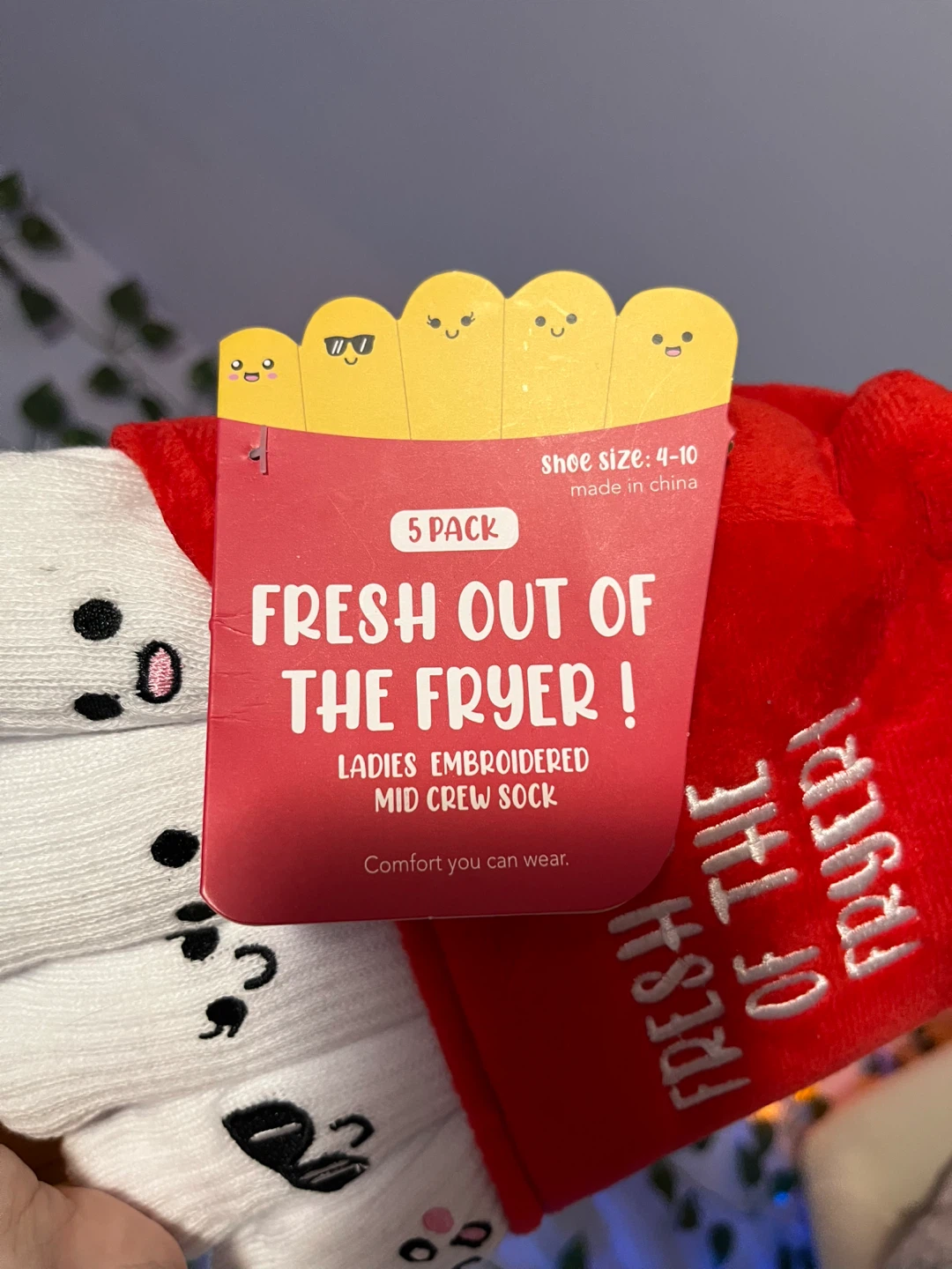 This is a wonderful gift for a friend, family, or partner. These are a super cute 5-pack of ladies embroidered mid-crew socks. They're brand new and come in a fun 'fresh out of the fryer' style package. The size is 4-10, so they'll fit most feet!