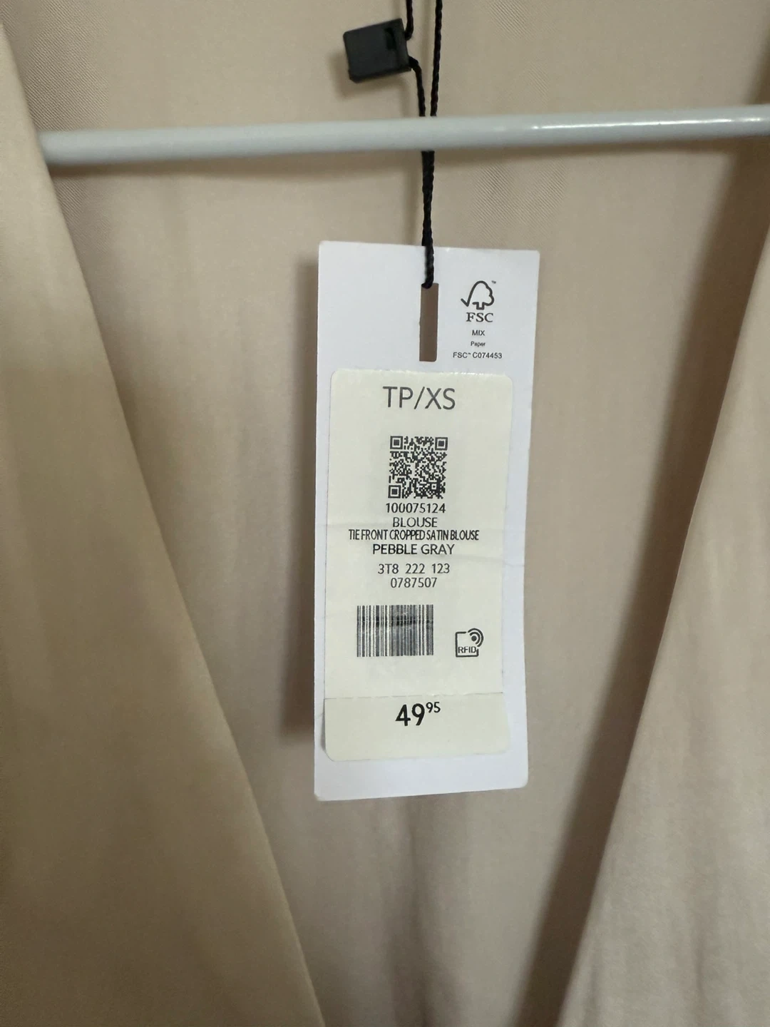 This is a Dynamite tie-front cropped satin blouse in size XS. The colour is pebble gray. It's in new condition with tags still attached. Originally bought for $49.95