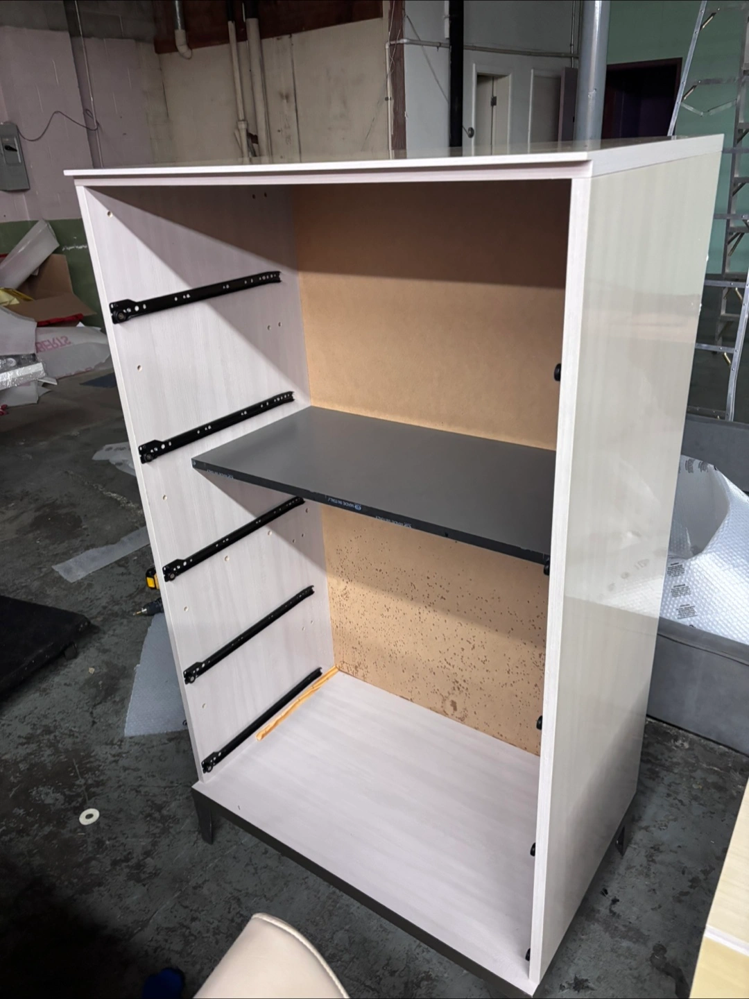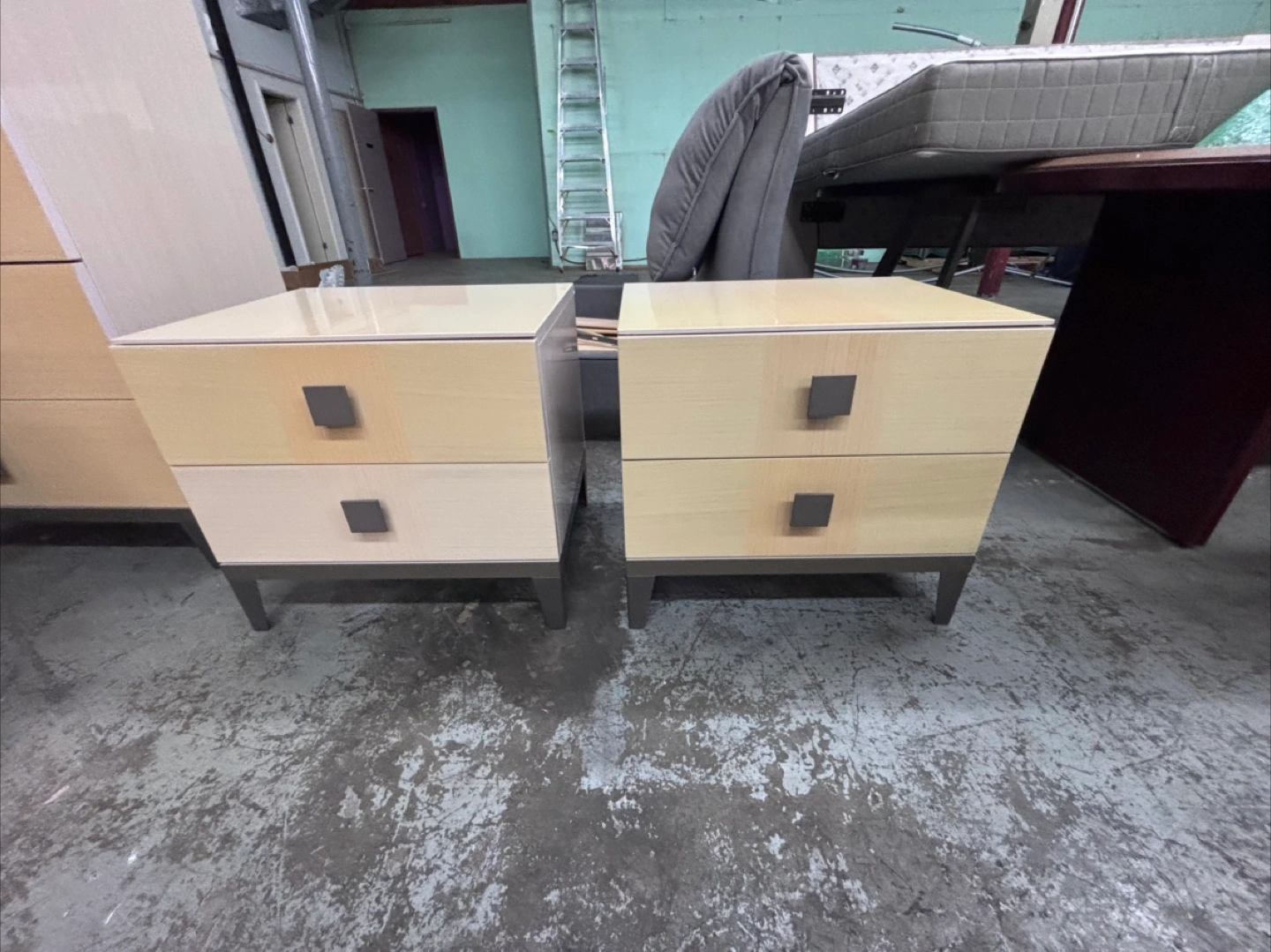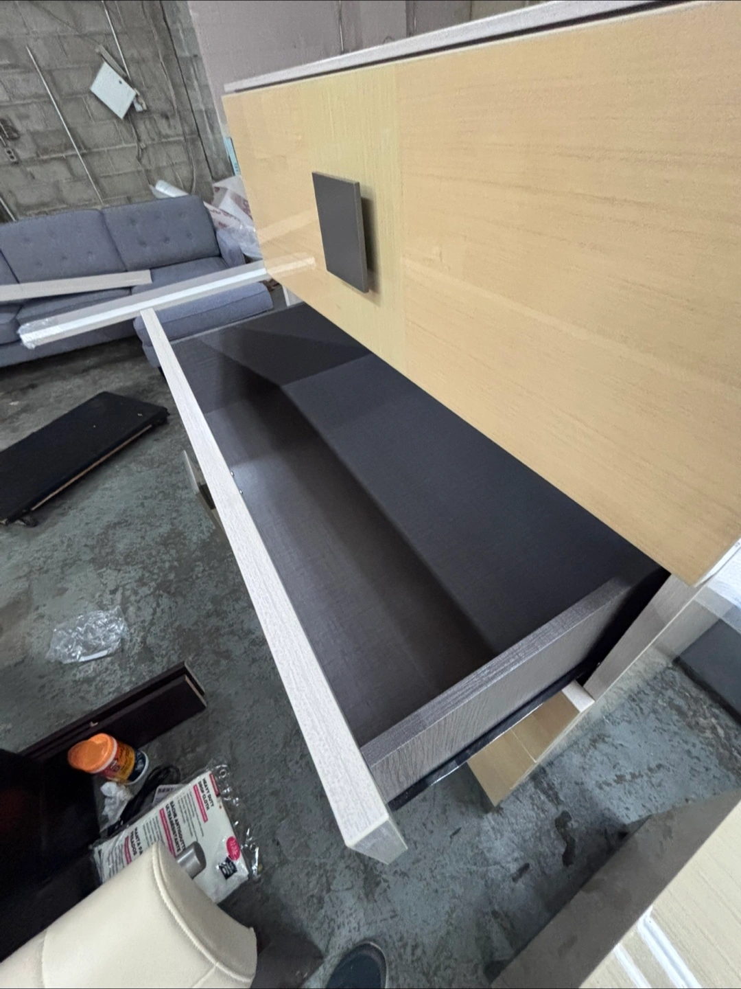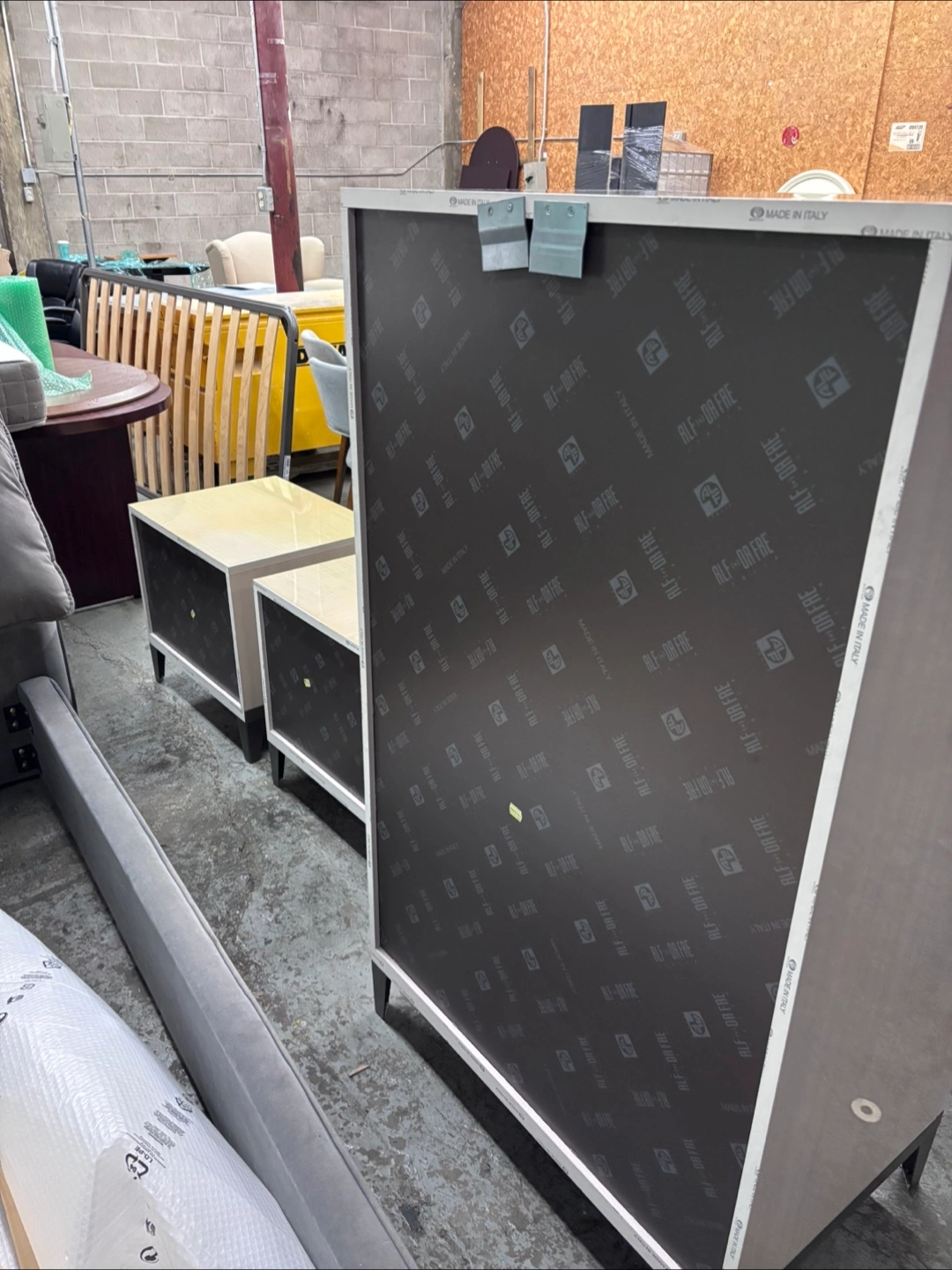 Selling an EQ3 Reverie bedside table and dresser set! And king size bed frame .The set features a modern design with light wood and grey accents. The bedside table has two drawers, while the dresser has multiple drawers for ample storage. Perfect for adding a touch of elegance to your bedroom