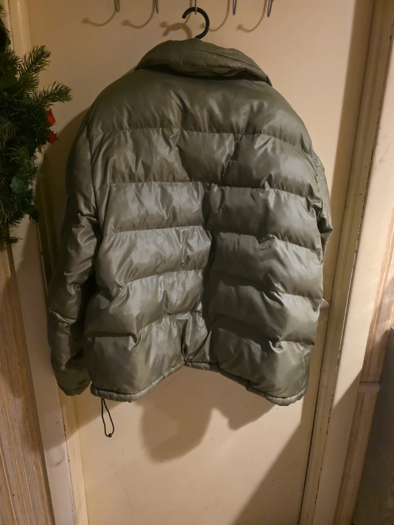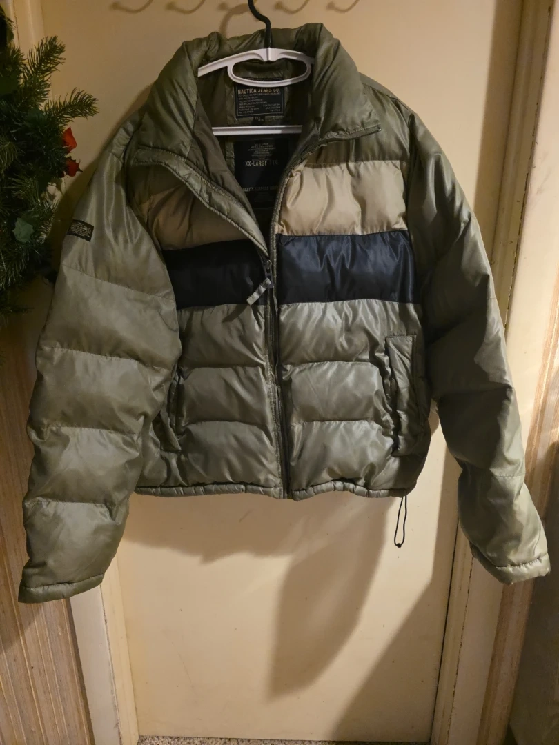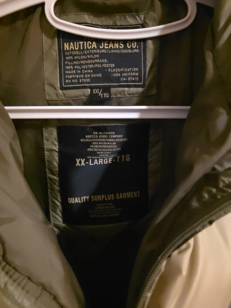 Nautica Jeans Co. puffer jacket in size XXL. The outer layer, exterior lining, and inner lining are all 100% nylon. The filling is 100% polyester. This is a quality surplus garment.