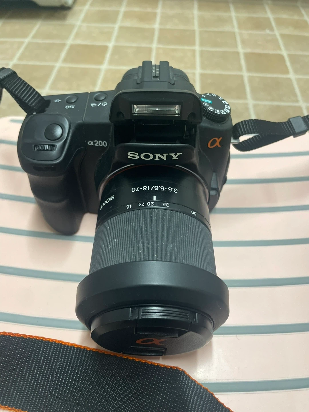 Selling a used Sony Alpha a200 digital SLR camera. It comes with a 3.5-5.6/18-70 lens and a battery charger. Also includes a camera bag for easy transport!