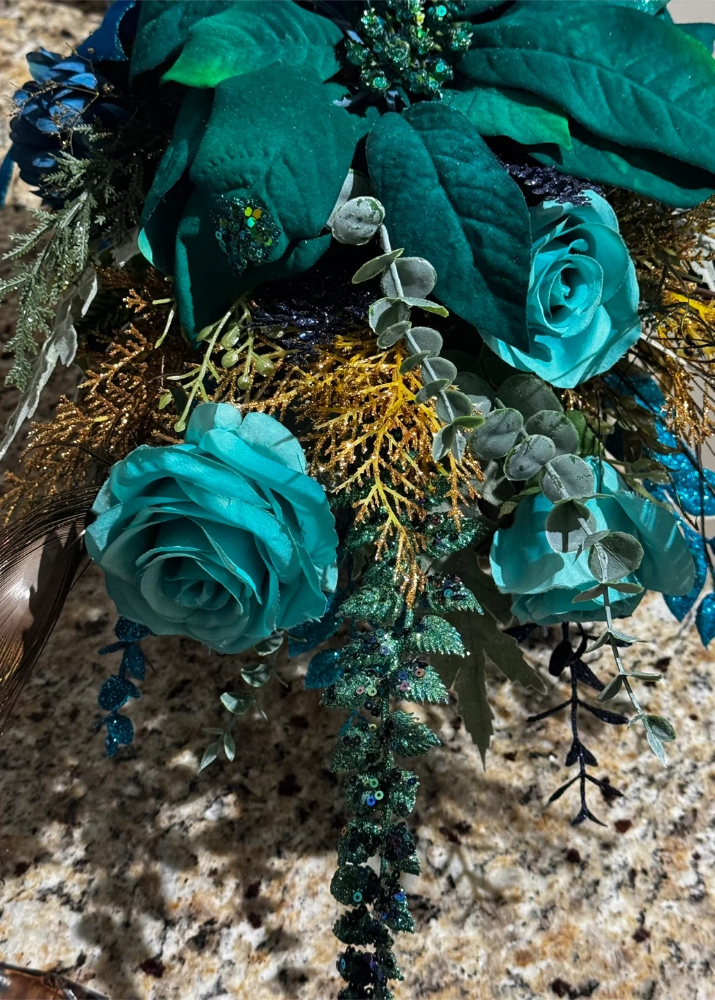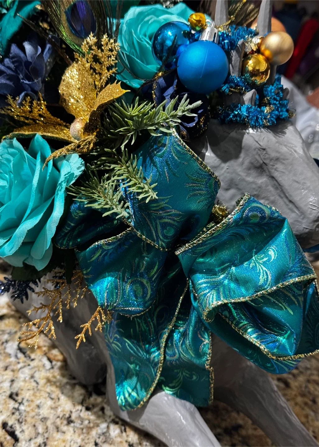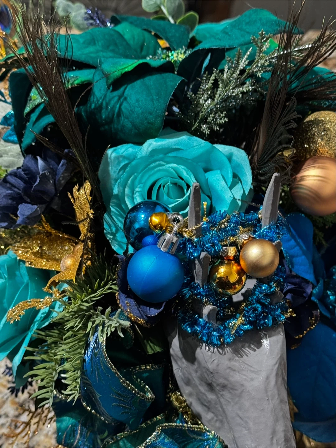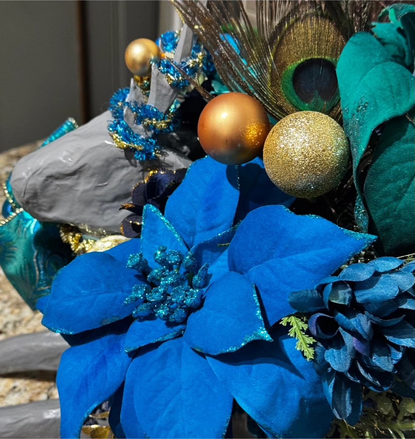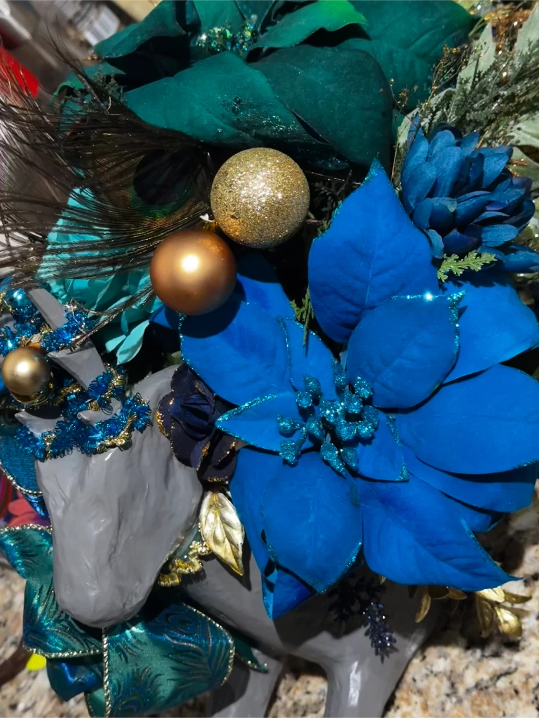 This is a beautiful teal and blue floral deer decoration, perfect for Christmas or any festive occasion! It features a grey deer figure adorned with teal and blue flowers, gold accents, and peacock feathers. It will definitely add a touch of elegance to your home