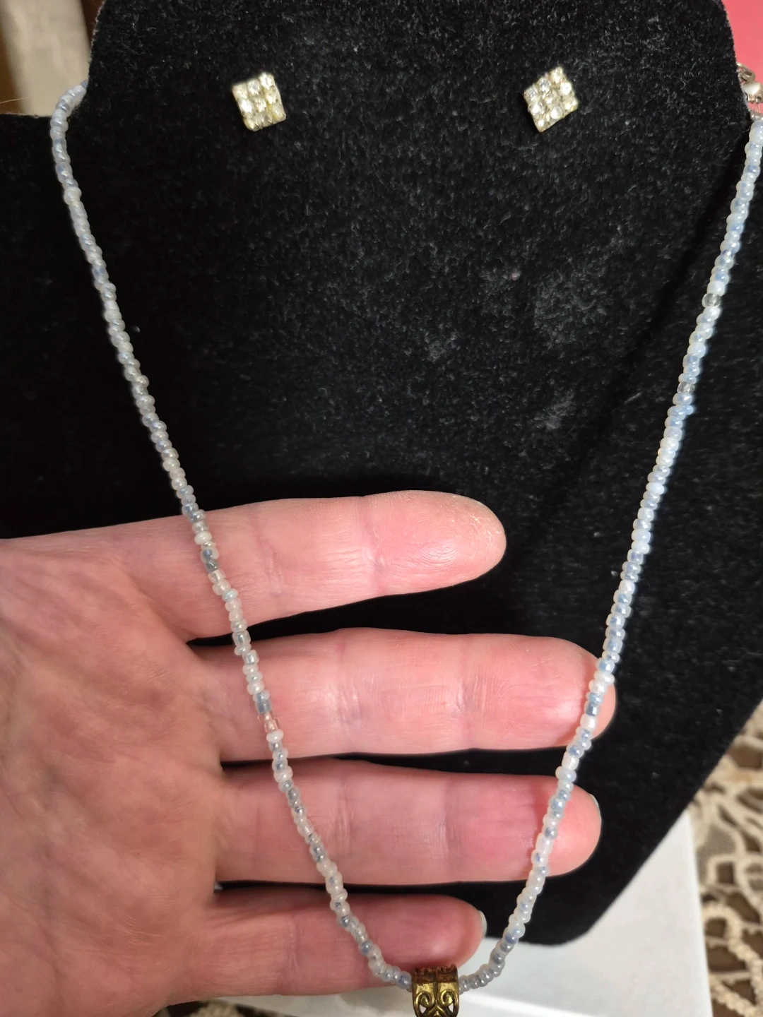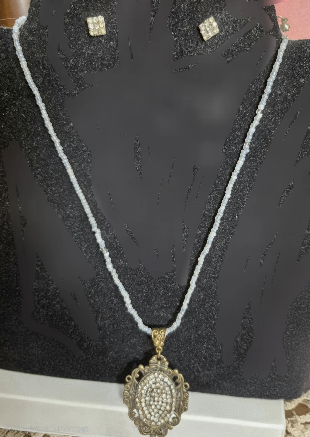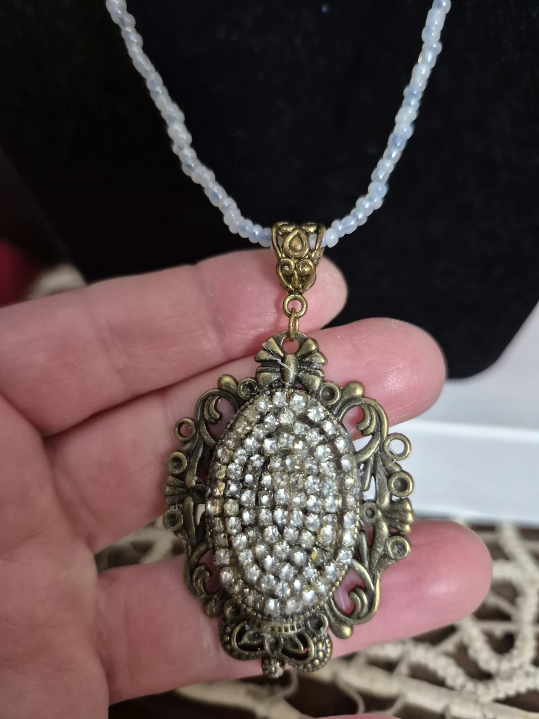 new handcrafted lovely beaded necklace featuring a beautiful rhinestone pendant. It's perfect for adding a touch of sparkle to any outfit. The beads are a soft, light colour and the pendant has an intricate design. ready to be worn!