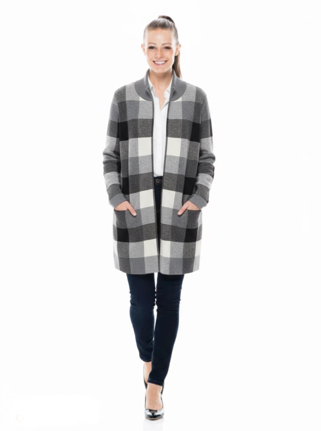 Max Studio cardigan in size XL! It features a stylish plaid pattern in shades of grey, white, and black. The material is a blend of 50% viscose, 28% polyester, and 22% nylon. It also has pockets!