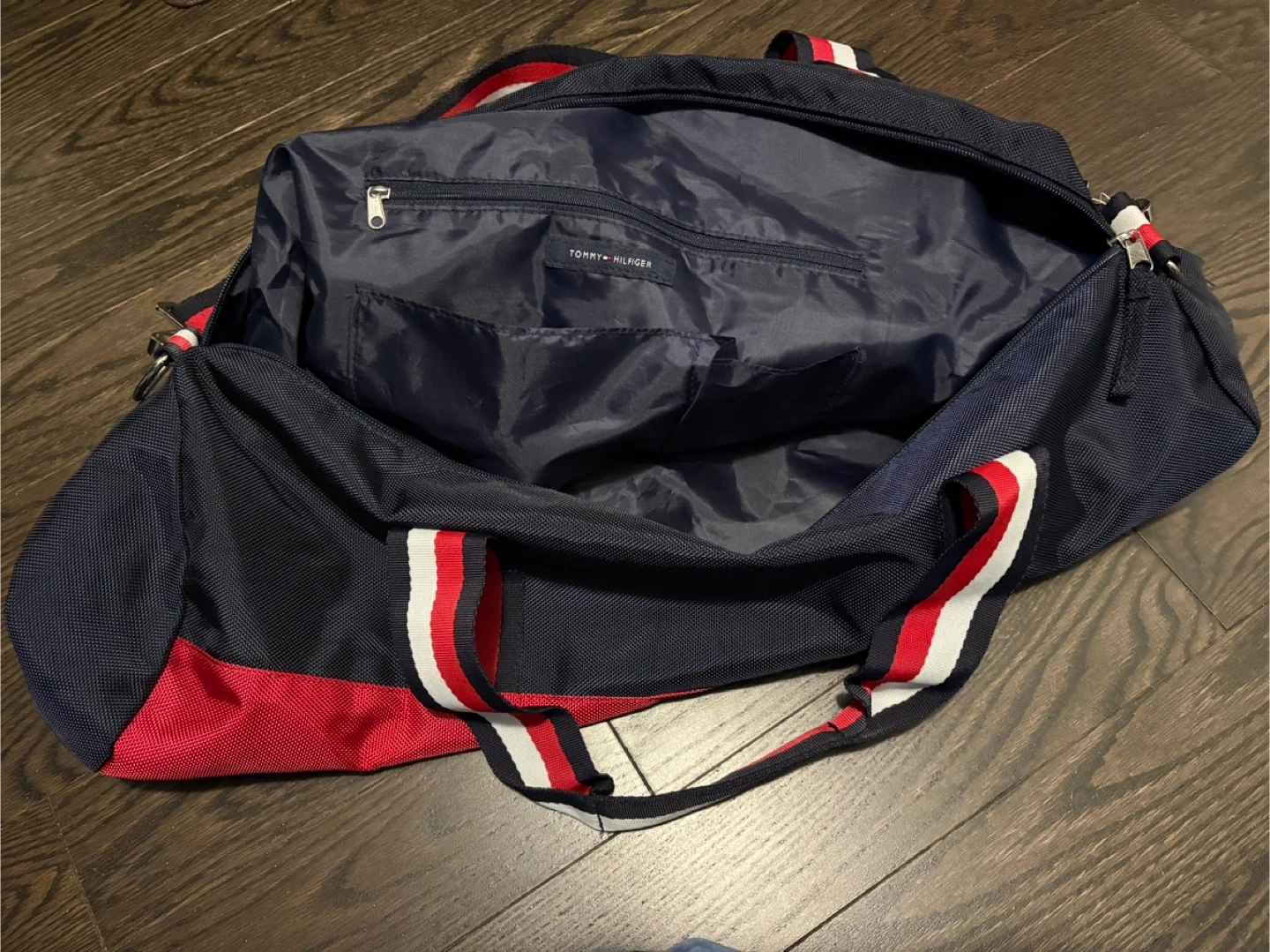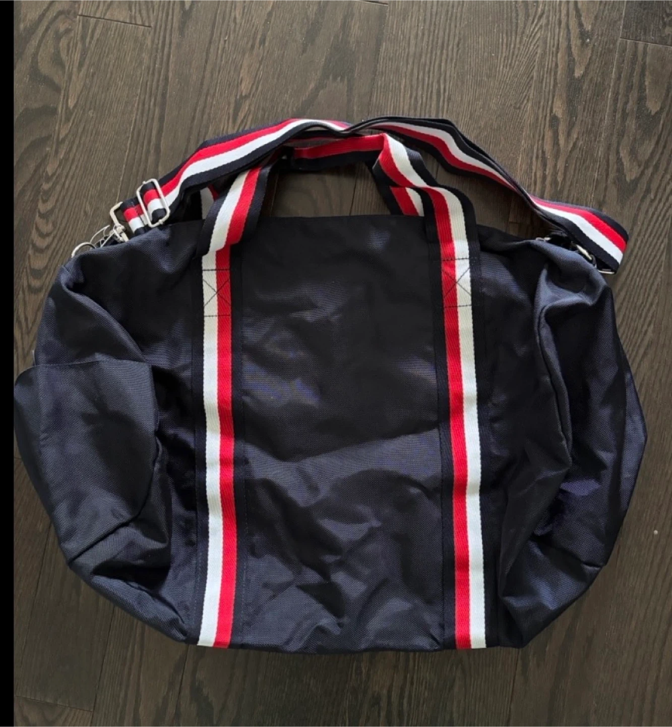 Navy blue Duffle bag. Red, white, and navy striped shoulder straps. Large main compartment. Smaller interior zippered pocket. Perfect for the gym and weekend getaway.