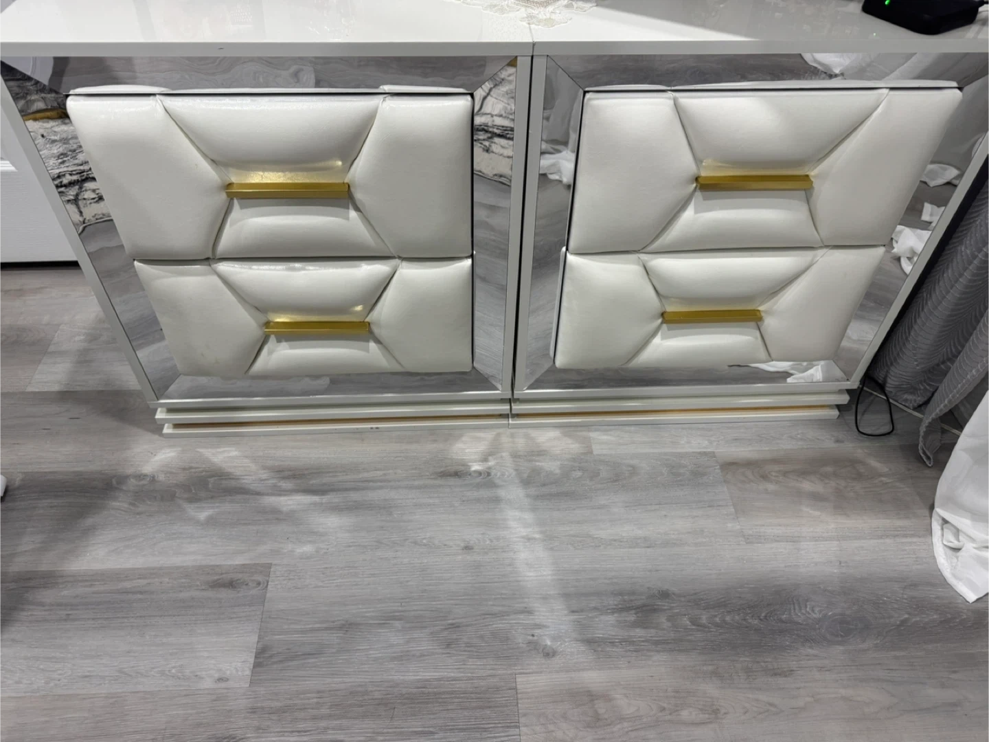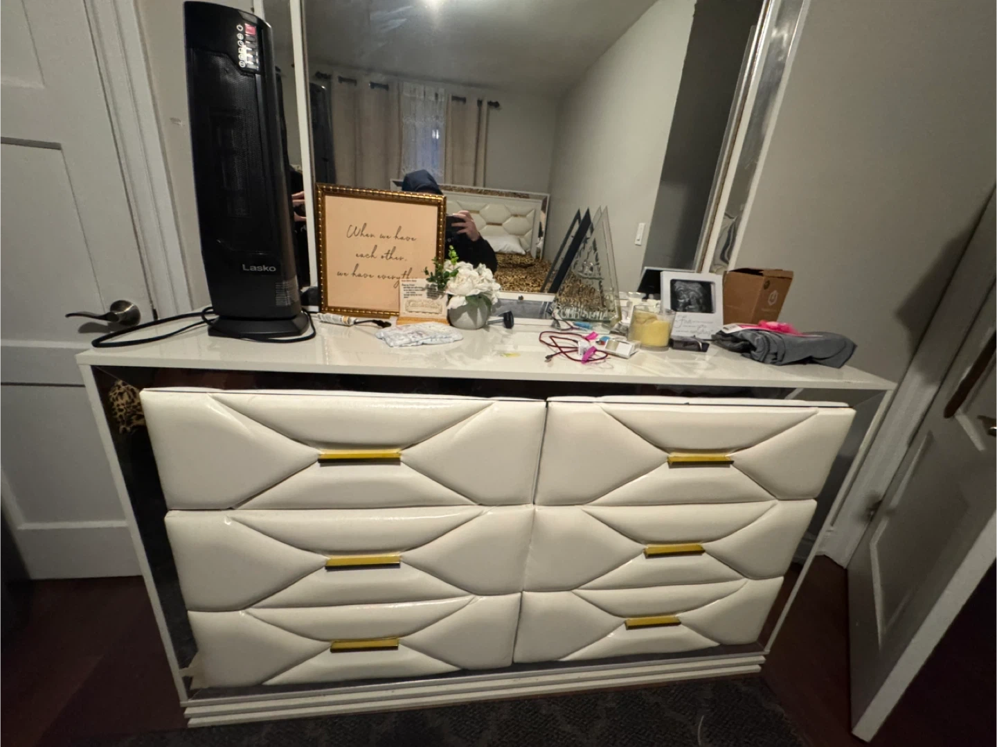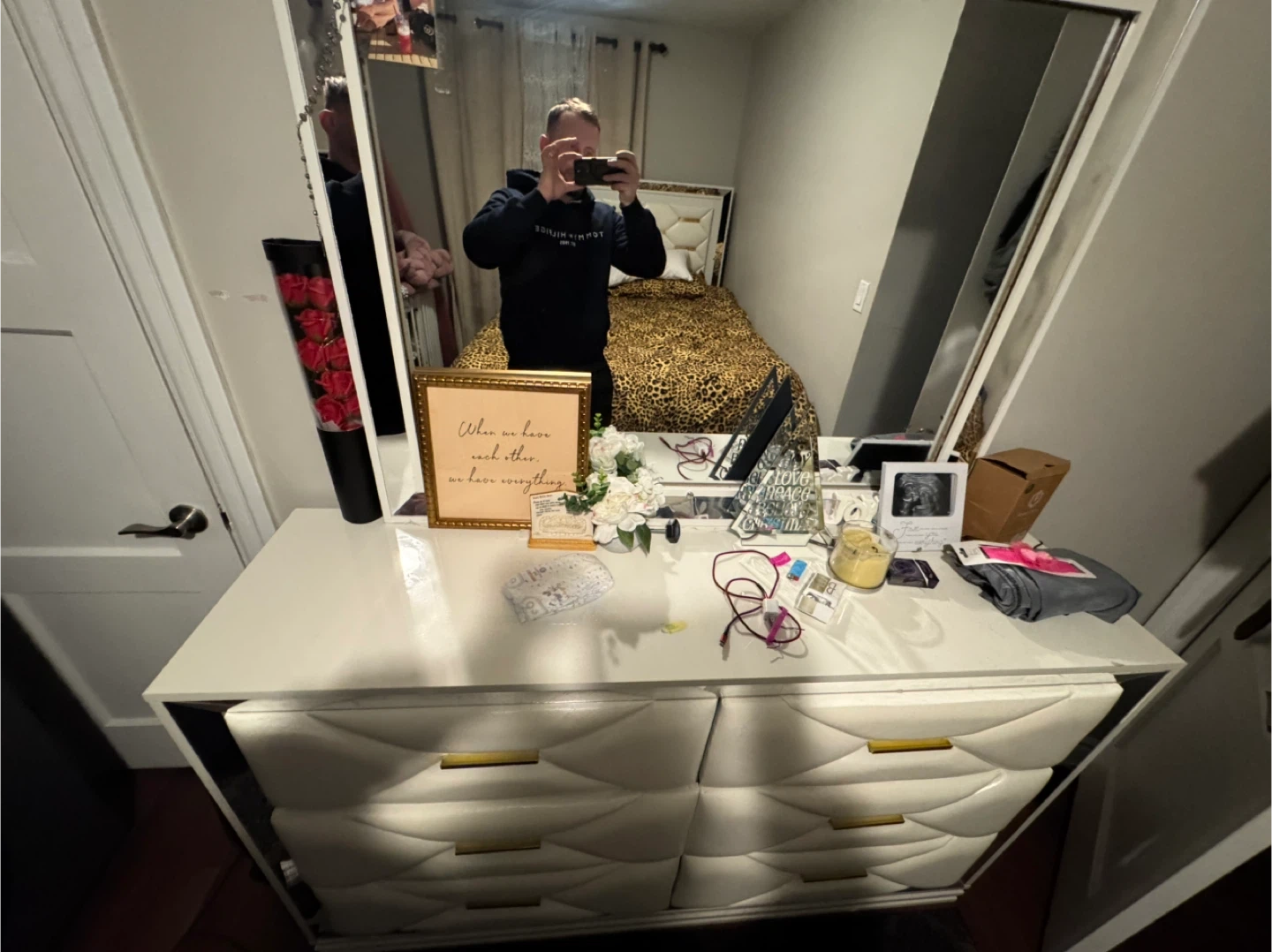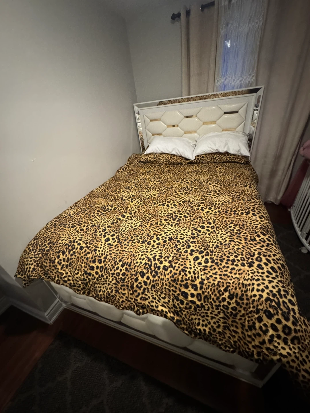Leopard print bedding set in great condition! It includes a queen-sized bed frame and a matching dresser. The dresser is white with gold accents.