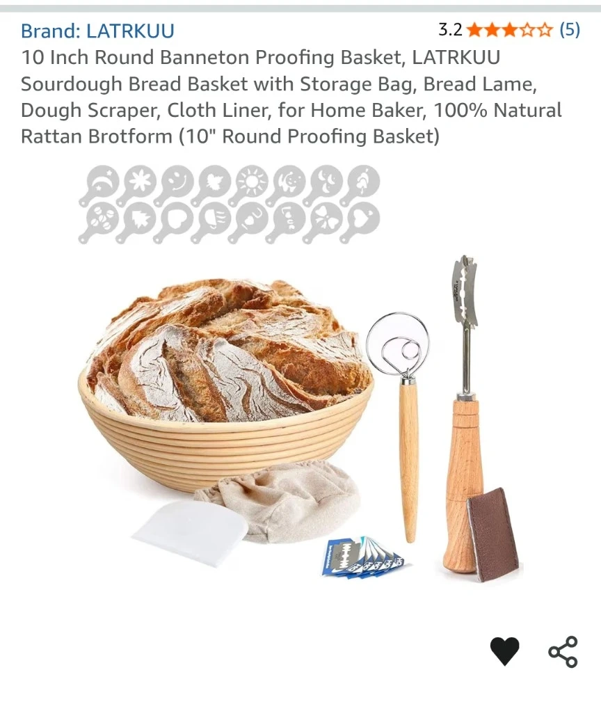 I'm selling a brand new LATRKUU 10 Inch Round Banneton Proofing Basket Kit. It includes a sourdough bread basket with a storage bag, bread lame, dough scraper, and cloth liner. It's perfect for the home baker and made from 100% natural rattan brotform!