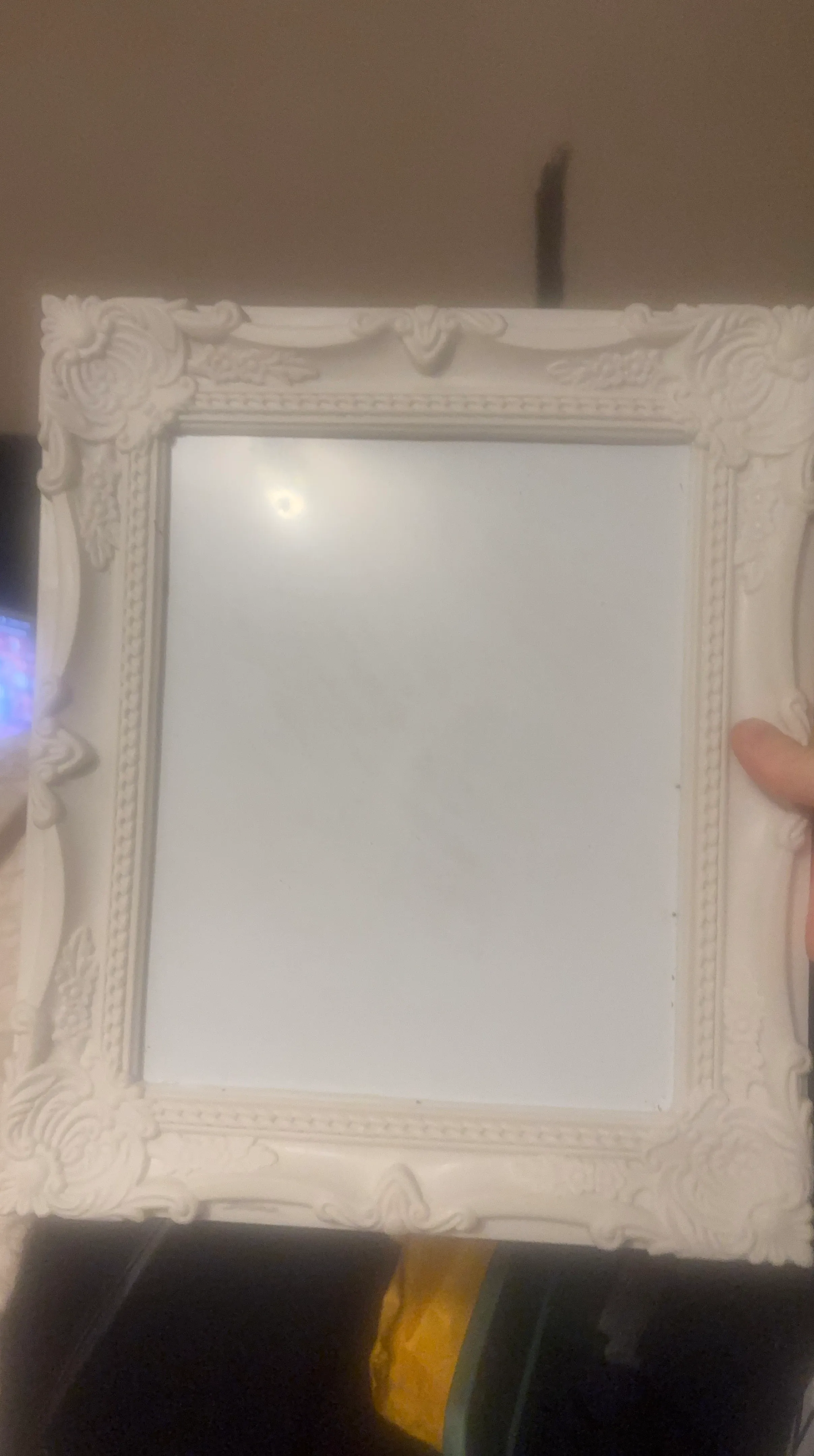 Selling a decorative picture frame with an ornate design. It's white and in good condition. Perfect for adding a touch of elegance to your photos or artwork!