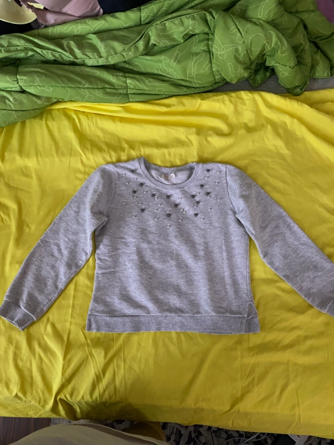 Selling a gently used MCK kids grey sweatshirt in size 10. It's a comfy and stylish piece perfect for layering or wearing on its own. The sweatshirt features cute embellishments around the neckline, adding a touch of charm to the simple design