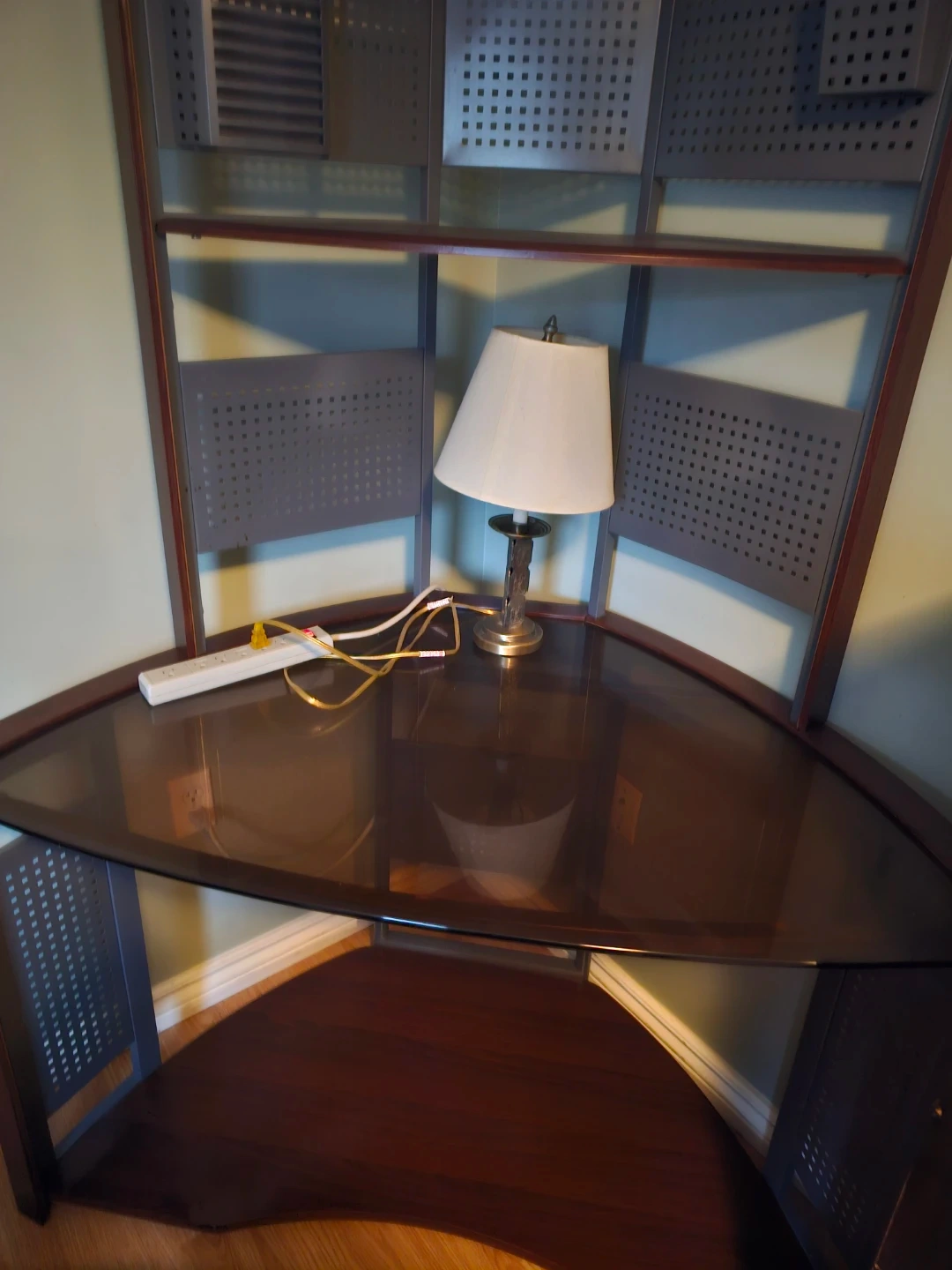 Selling a corner desk with a sleek glass top. It features a dark wood frame and a unique, space-saving design. The desk also has built-in shelving, perfect for storage or displaying items. It's in great condition and ready to enhance your workspace