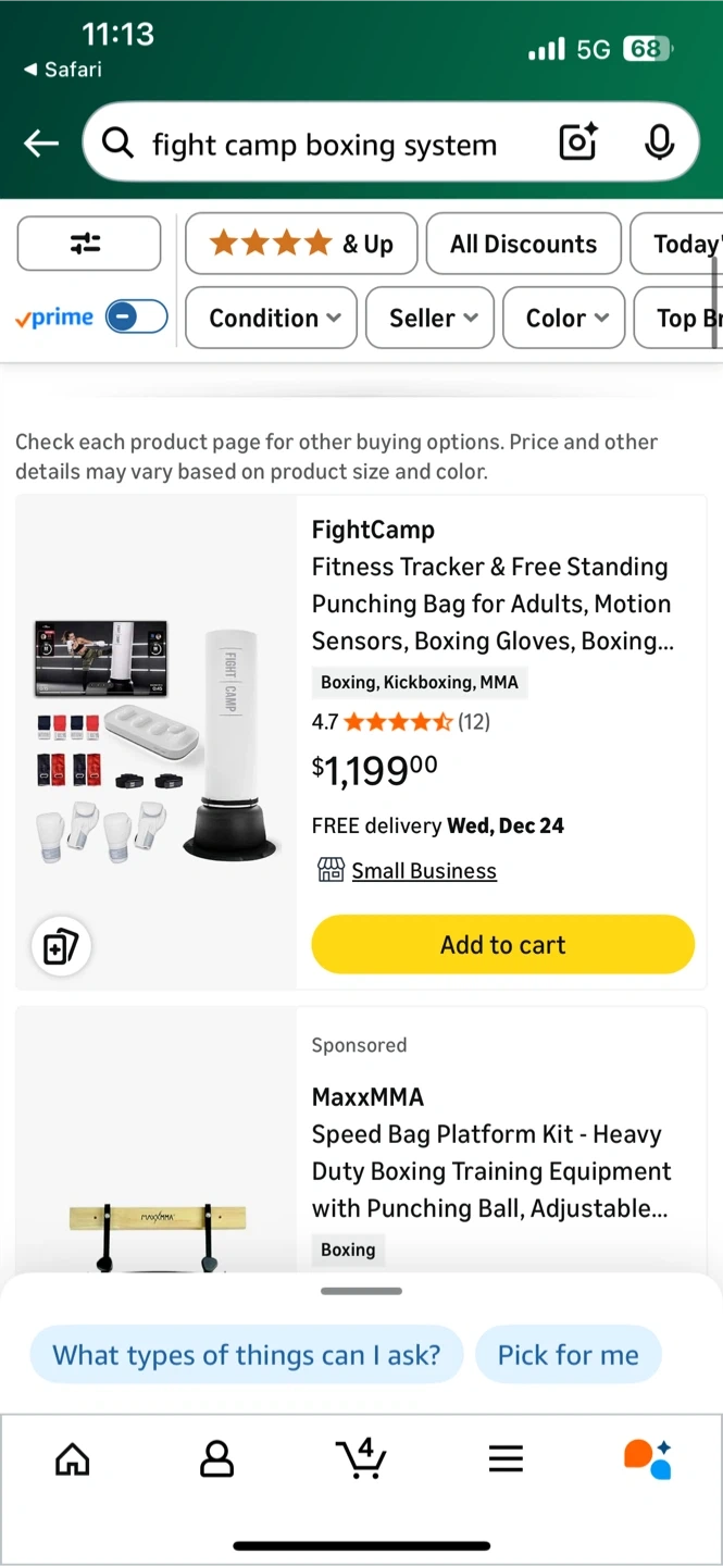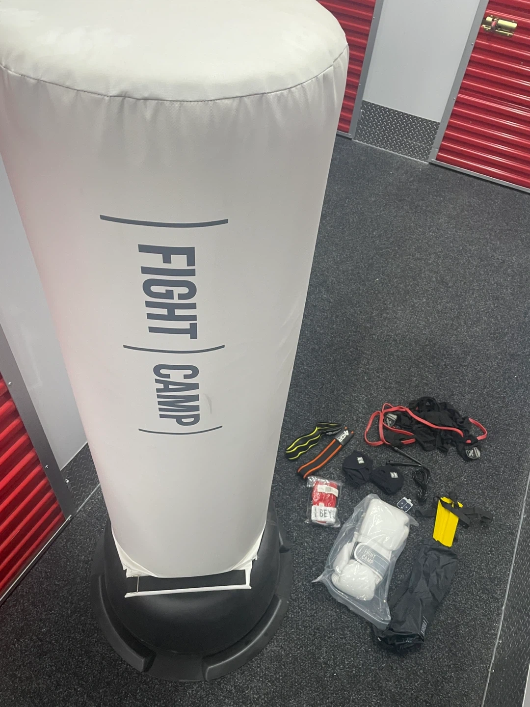 Fight Camp Elite punching bag system. Never used. Includes free-standing boxing bag, bag ring, boxing gloves, sensors, quick wraps, ankle wraps, and heart rate monitor. The base is approximately 28 inches in diameter, and the bag is about 70 inches tall. Perfect for getting a great workout at home! Retails as shown