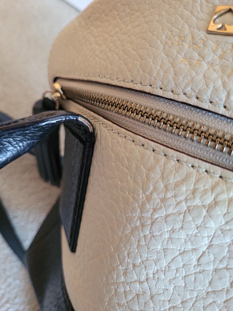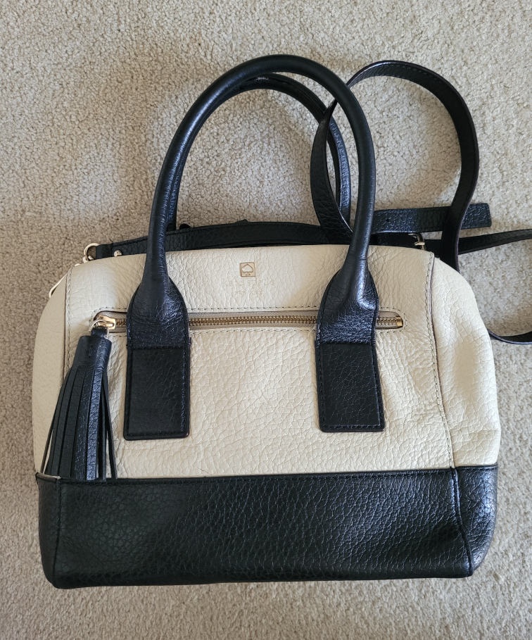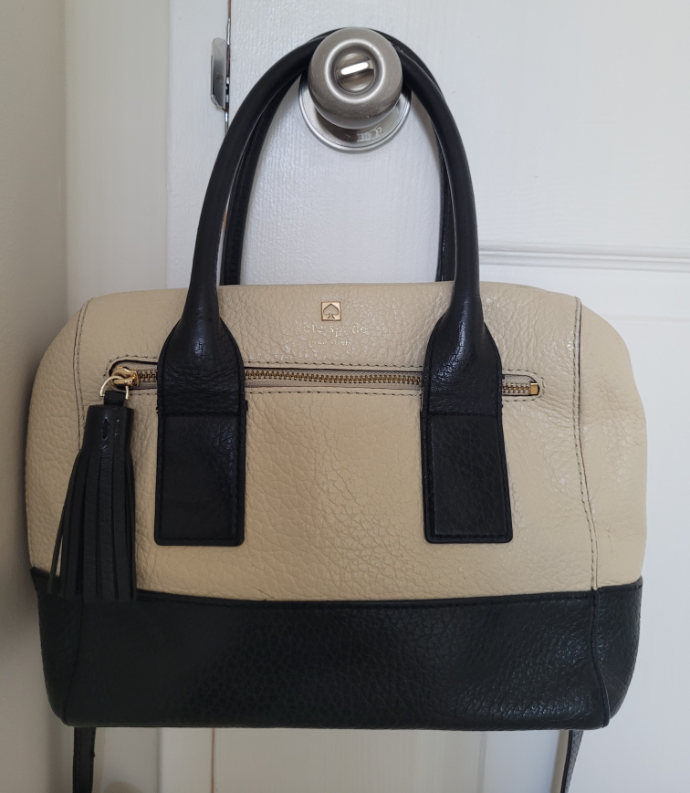 Authentic Kate Spade top handle leather satchel with removable / adjustable shoulder strap in cream & black colour block. In good condition, some wear at leather edges throughout (hardly noticeable when worn), interior is pristine.