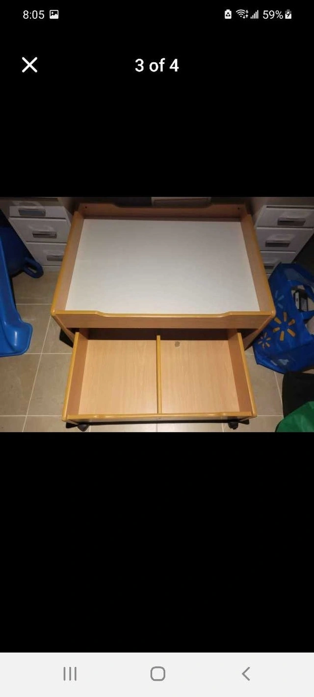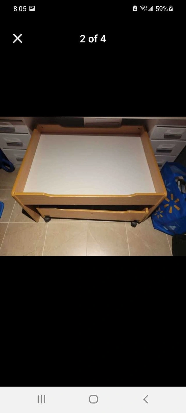 This gently used crafting table with storage is perfect for any child's play area! It features a smooth, spacious surface ideal for art projects, homework, or imaginative play, and includes two large drawers to keep all your supplies neatly organized and easily accessible. This is a great addition to your kid's space!