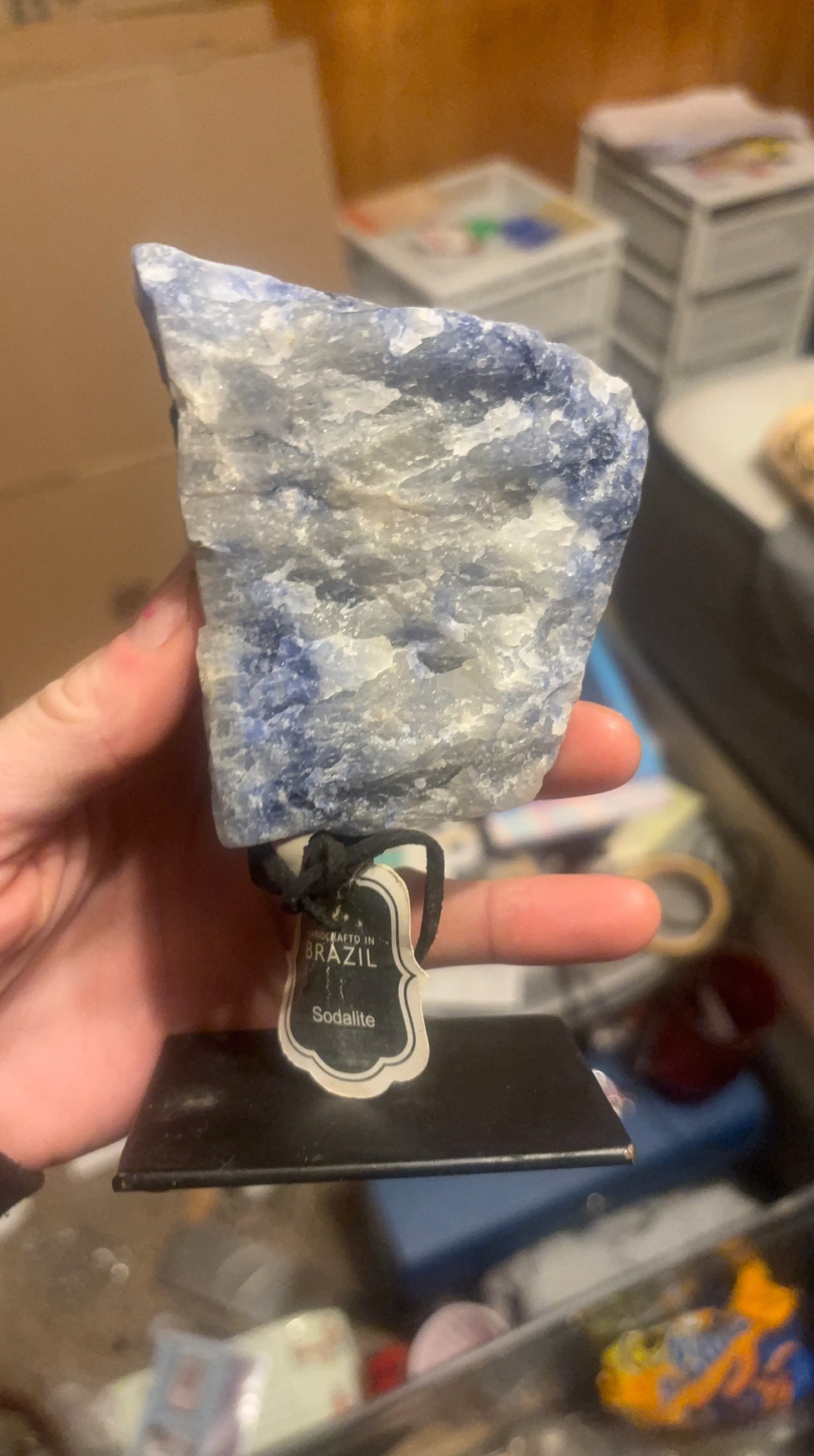 Selling a Sodalite stone from Brazil, displayed on a stand. It has a beautiful blue and white pattern. Perfect for collectors or as a unique decorative piece!