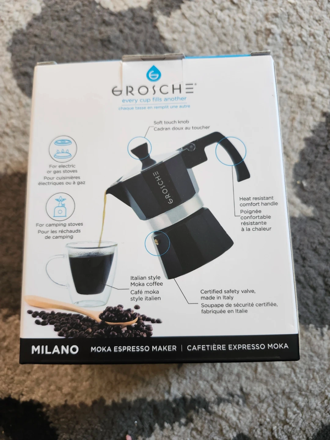 Selling a Grosche Milano Moka Espresso Maker! Brand new, never used! It''s perfect for making Italian-style moka coffee right on your stovetop or camping stove. The box includes a heat-resistant comfort handle and a certified safety valve made in Italy