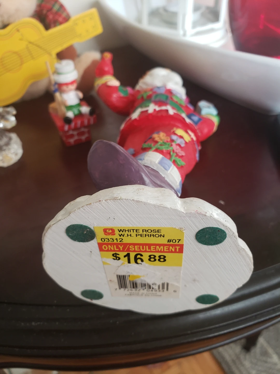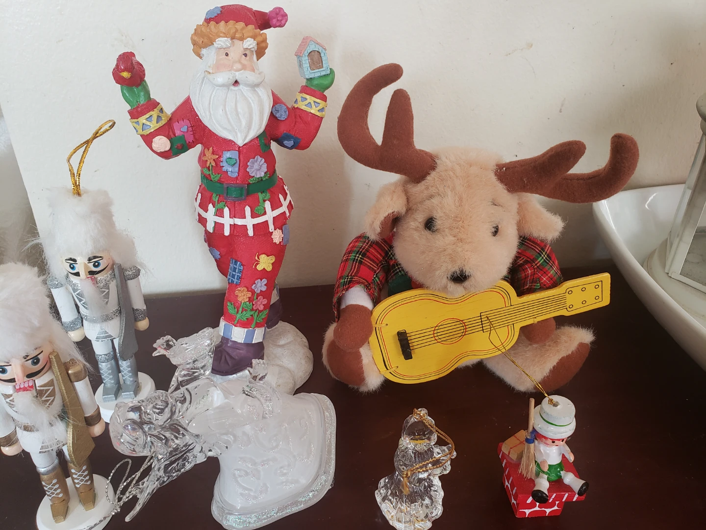 A collection of Christmas decorations including a Santa figurine, nutcrackers, and a crystal angel. The Santa figurine has a price tag of $16.88 from White Rose. Perfect for adding some holiday cheer!