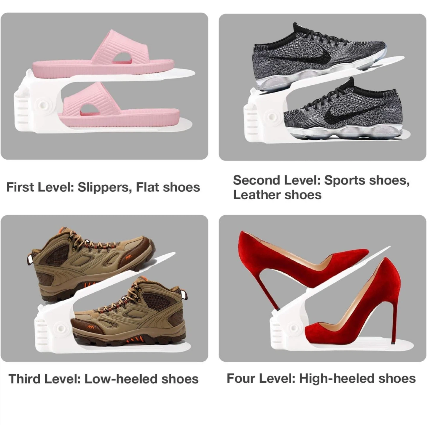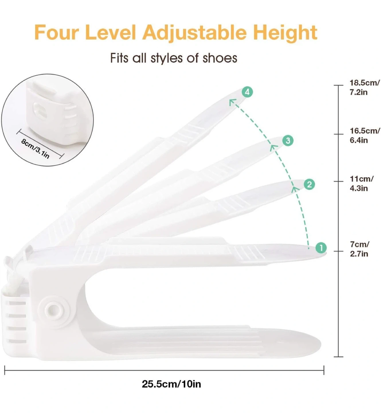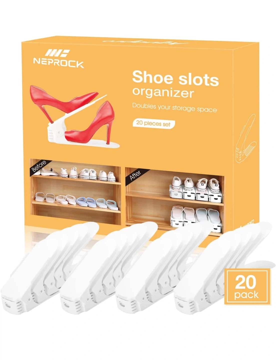 Maximize your closet space with this new 20-pack of NEPROCK shoe slot organizers, designed to neatly stack your shoes. These organizers are adjustable to four different heights, accommodating various shoe types, from flats to heels. They are constructed from durable plastic to keep your shoe collections well organized.
