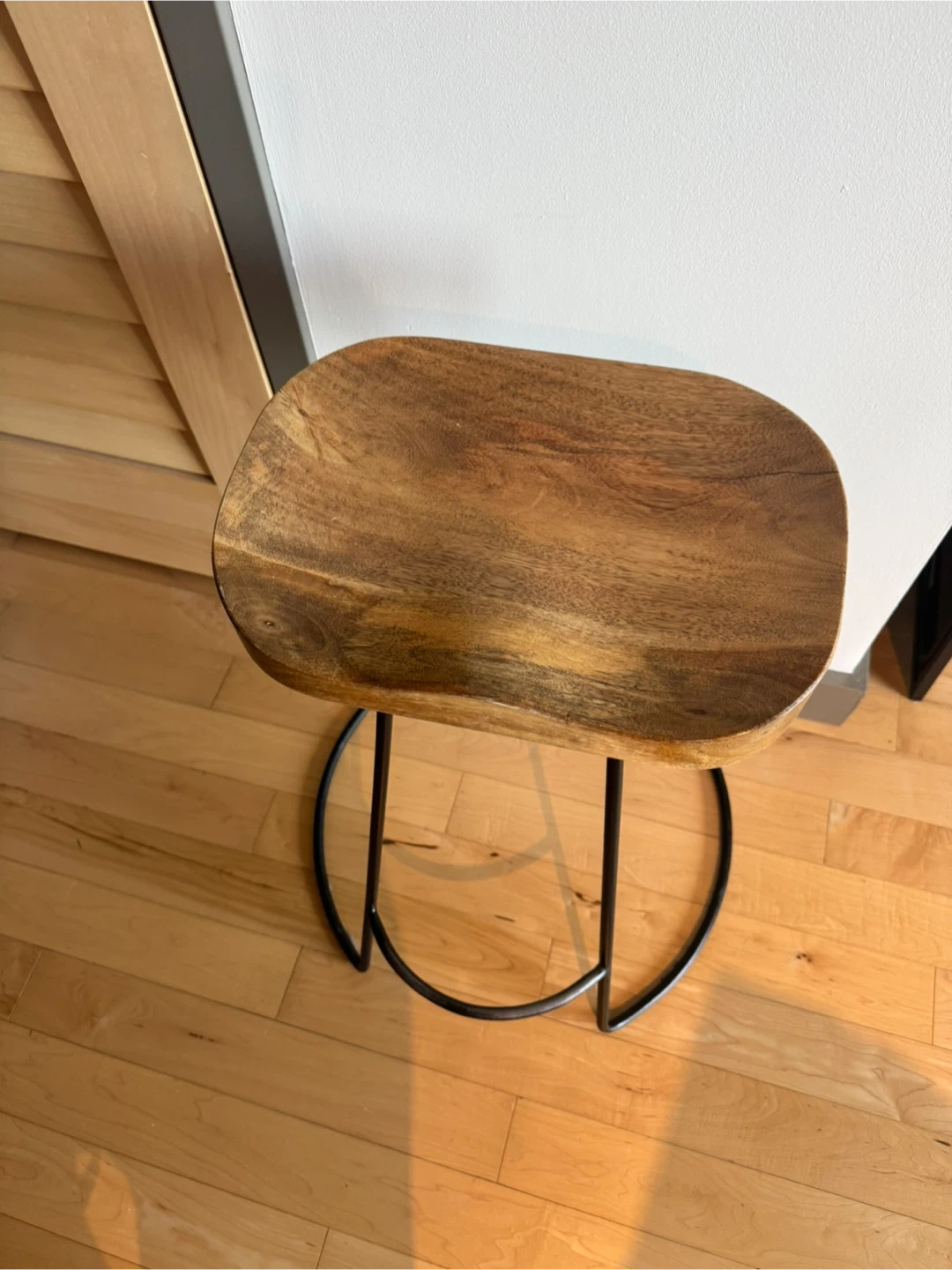 This is a wood saddle seat bar stool with a black metal base. It's in great condition and would be a nice addition to any kitchen or bar area!