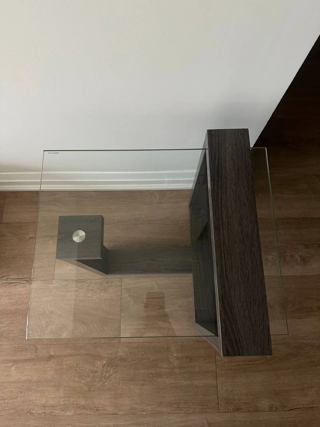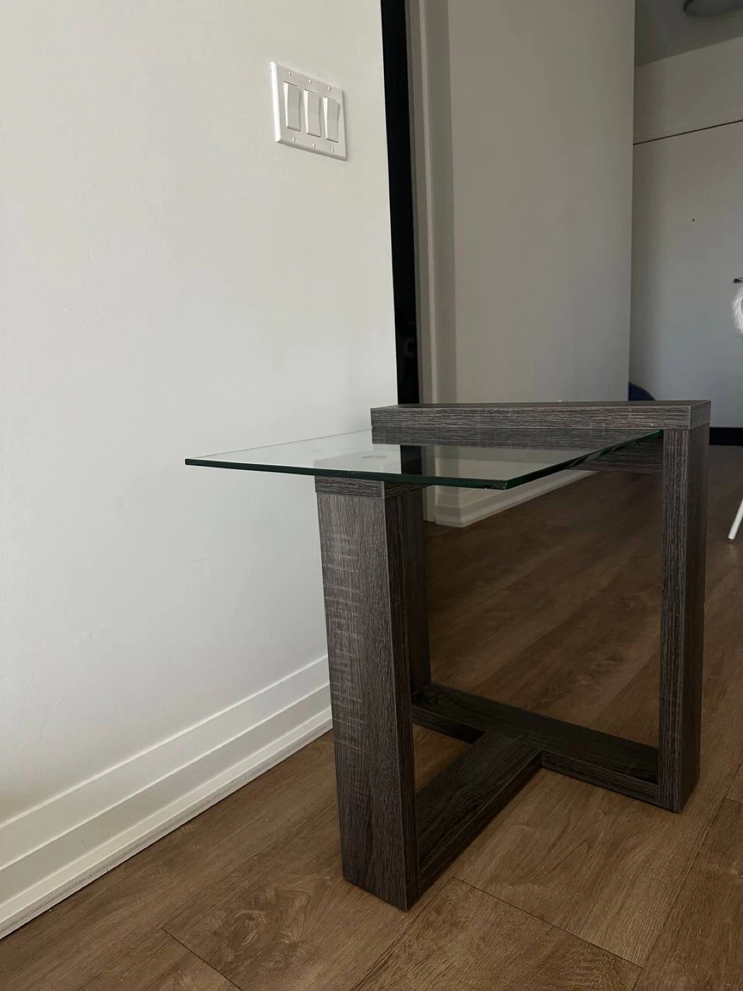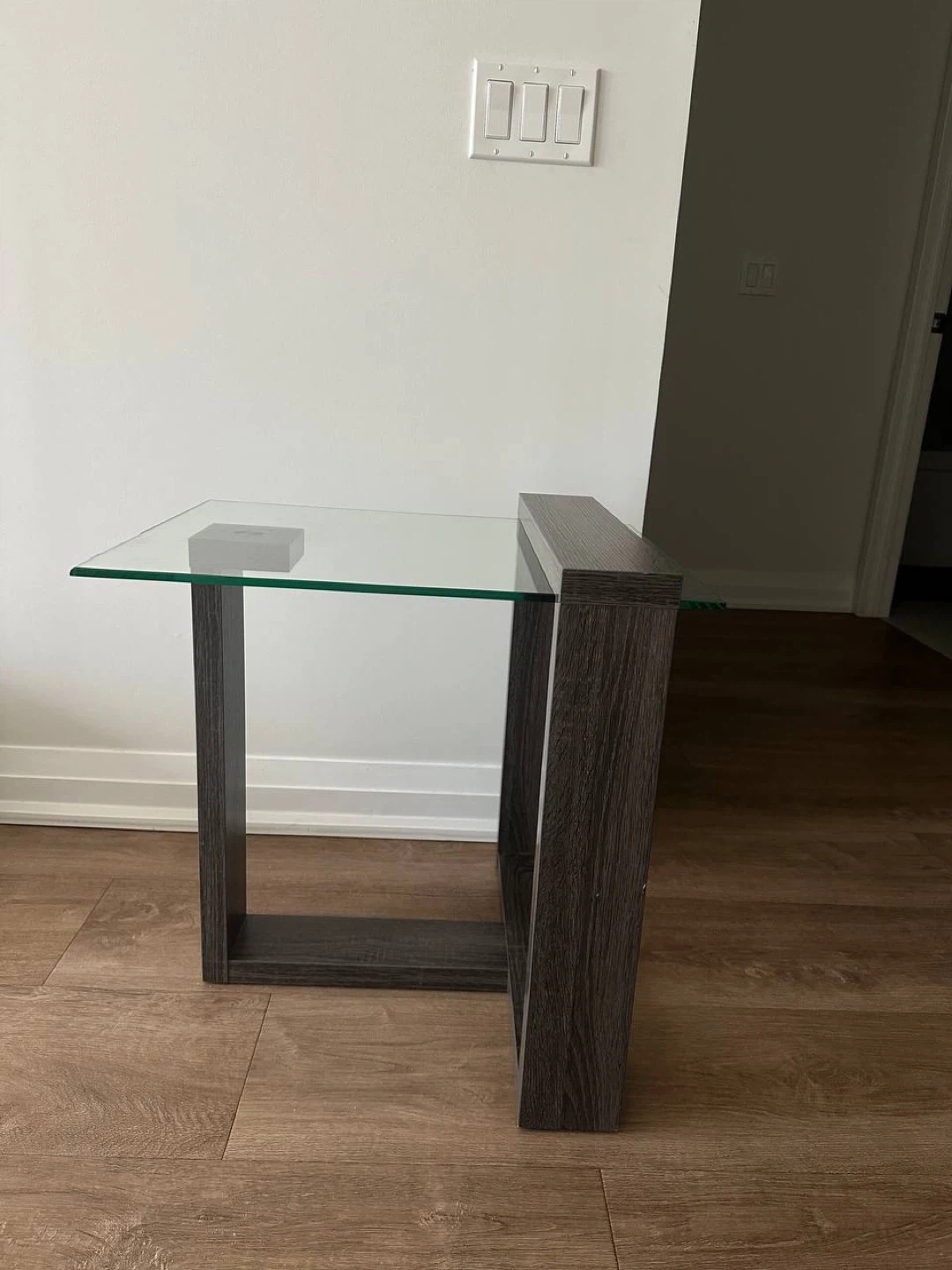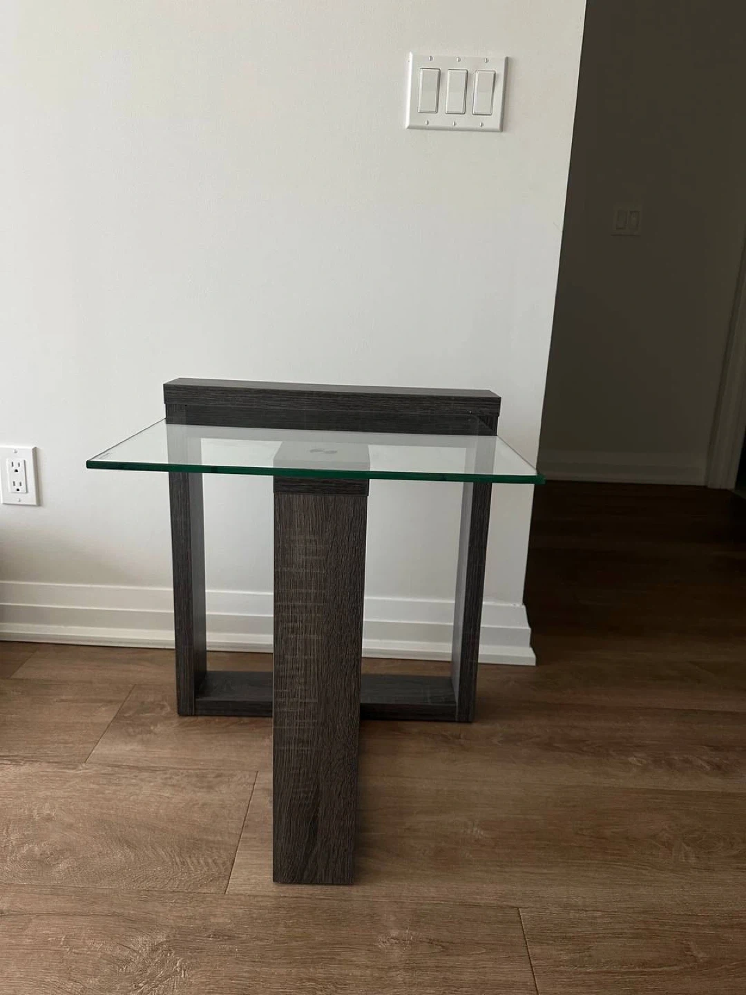 Selling a glass top side table. It features a modern design with a clear glass top and a dark wood-look frame. It's in great shape and would look great in any living room or bedroom!