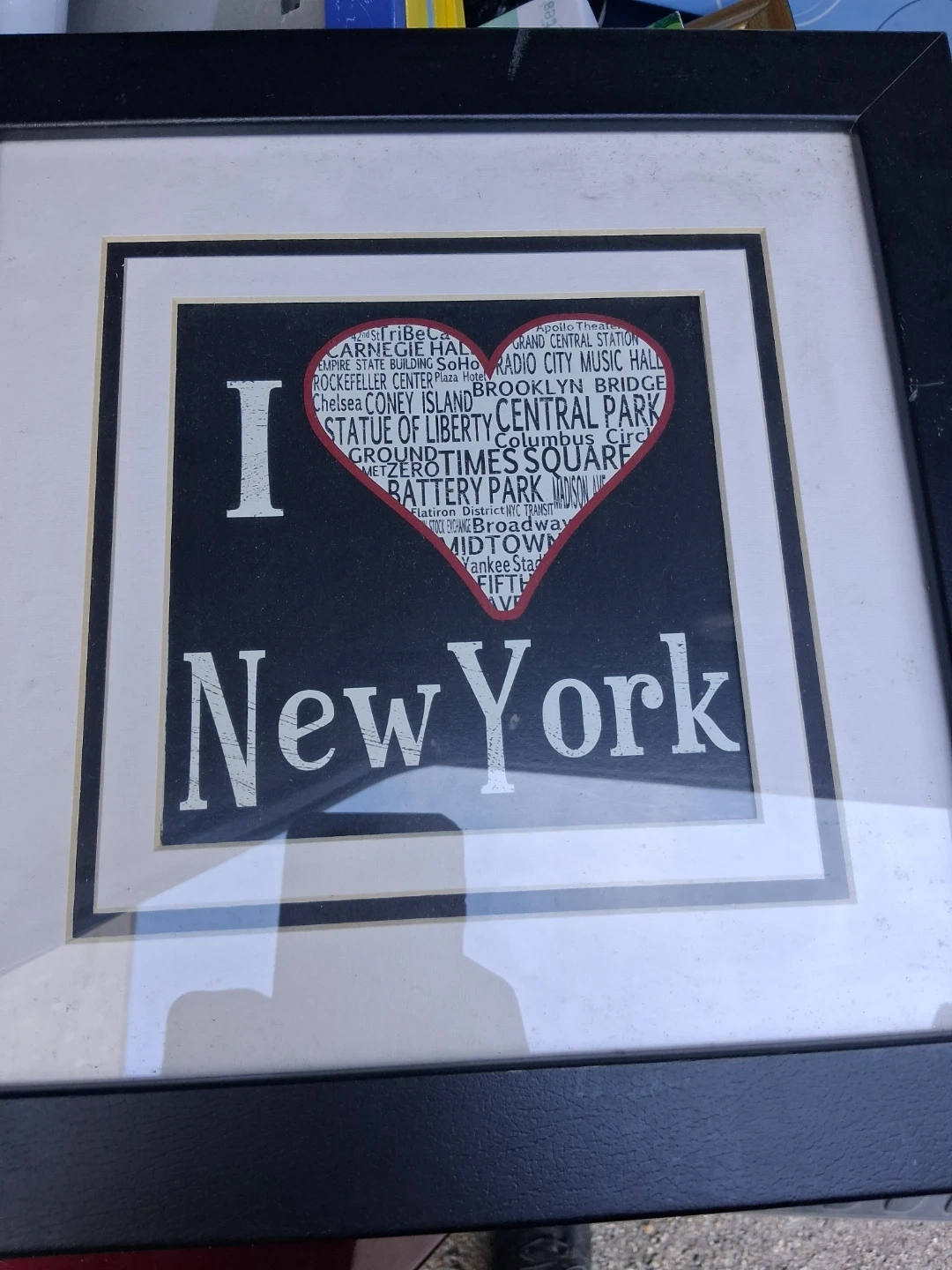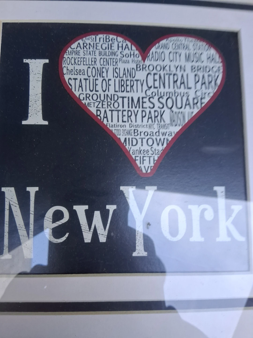 Framed print featuring "I ❤️ New York" design. The heart contains names of famous landmarks and places in New York City.