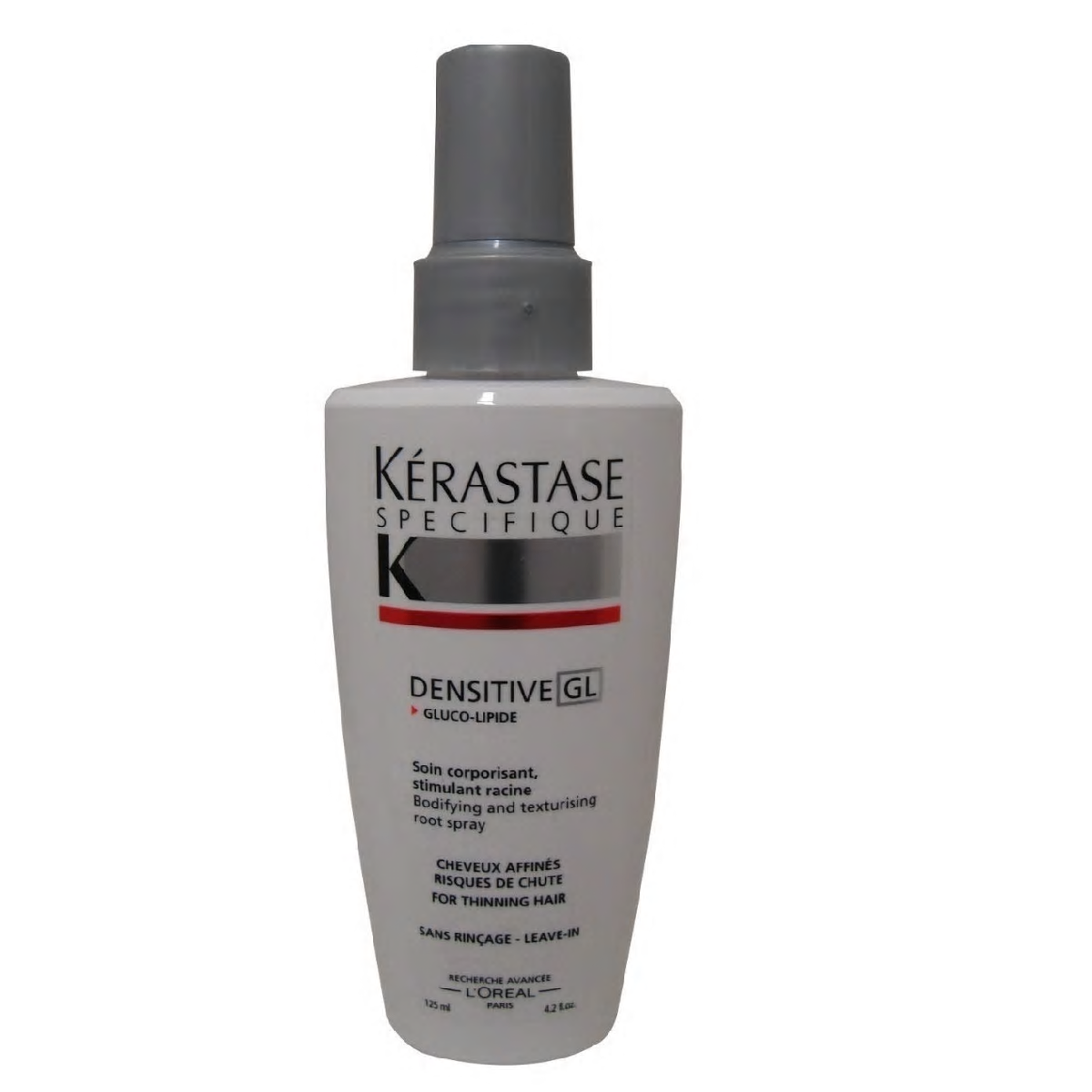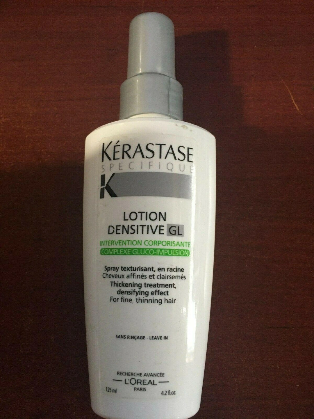 I'm selling a Kérastase Spécifique Lotion Densitive GL. It's a spray texturizer designed for fine, thinning hair. This thickening treatment provides a densifying effect. It's a leave-in product, so there's no need to rinse. The bottle contains 4.2 fl oz (125 ml).