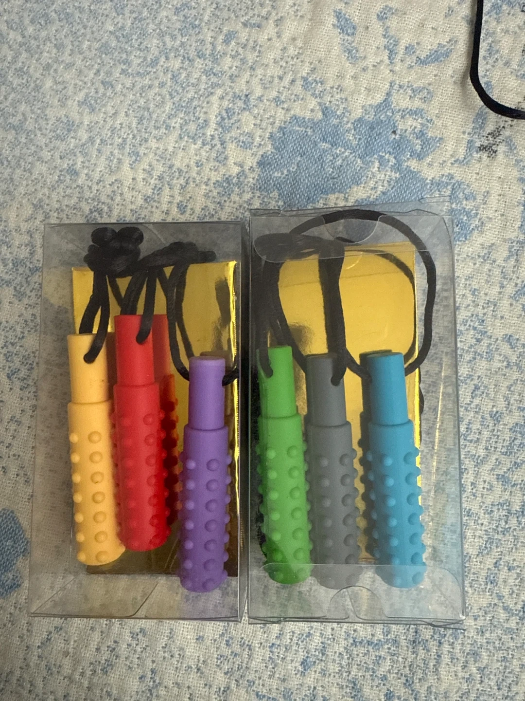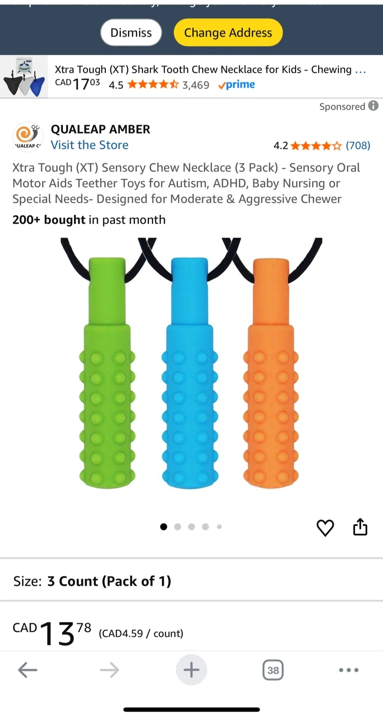 Selling a set of QUALALEAP Sensory Chew Necklaces! Perfect for sensory oral motor aids, these necklaces are designed for moderate and aggressive chewers. They come in a pack of 3 and are great for kids with Autism, ADHD, or those in baby nursing or with special needs. Each pack includes a variety of colours!