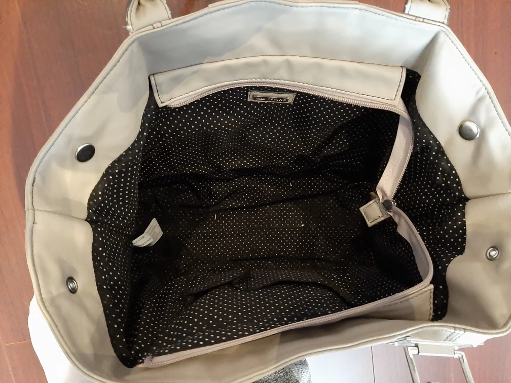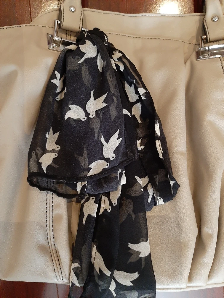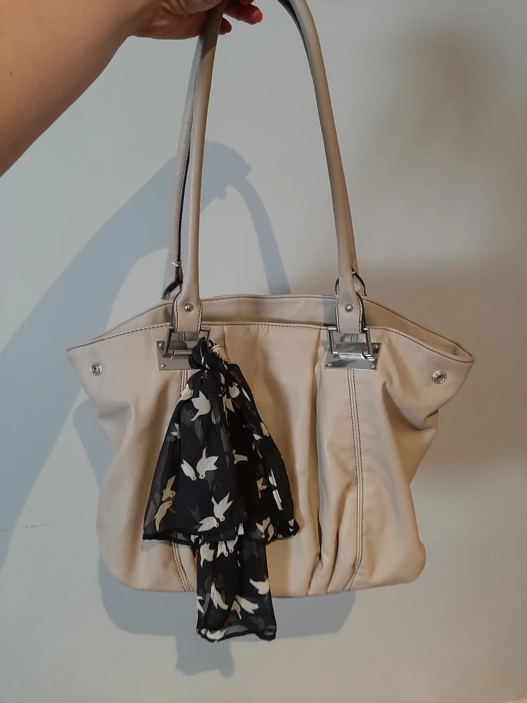 Here's a lovely beige tote bag! It comes with a cute black and white bird-patterned scarf. The inside lining is black with white polka dots. It's in great condition and ready for a new owner! Even fits a laptop.