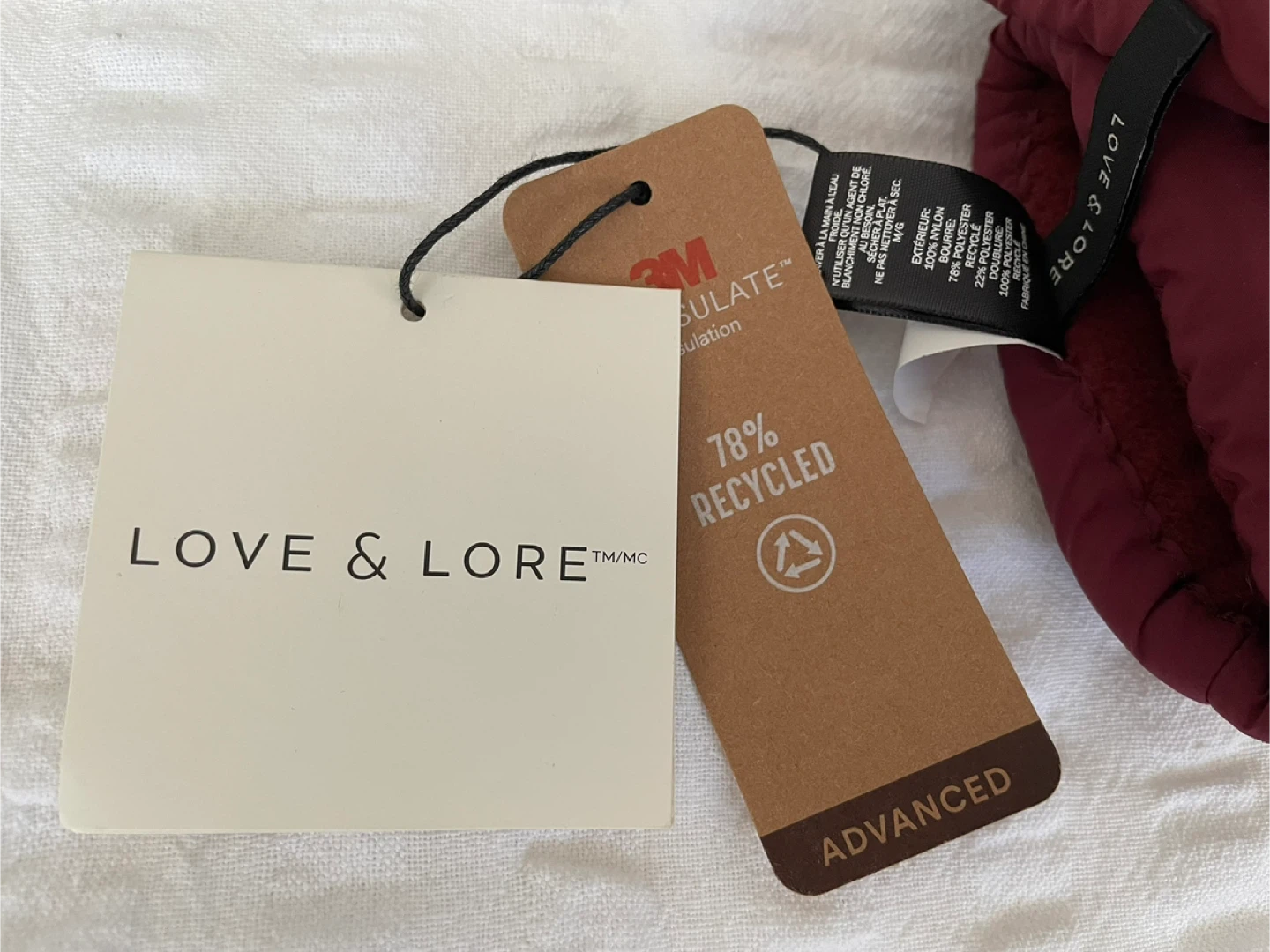 Keep your hands cozy with these Love & Lore mittens! They're a lovely burgundy colour and are made with 78% recycled materials. Perfect for those chilly Canadian winters! Size: Medium, New With Tags.