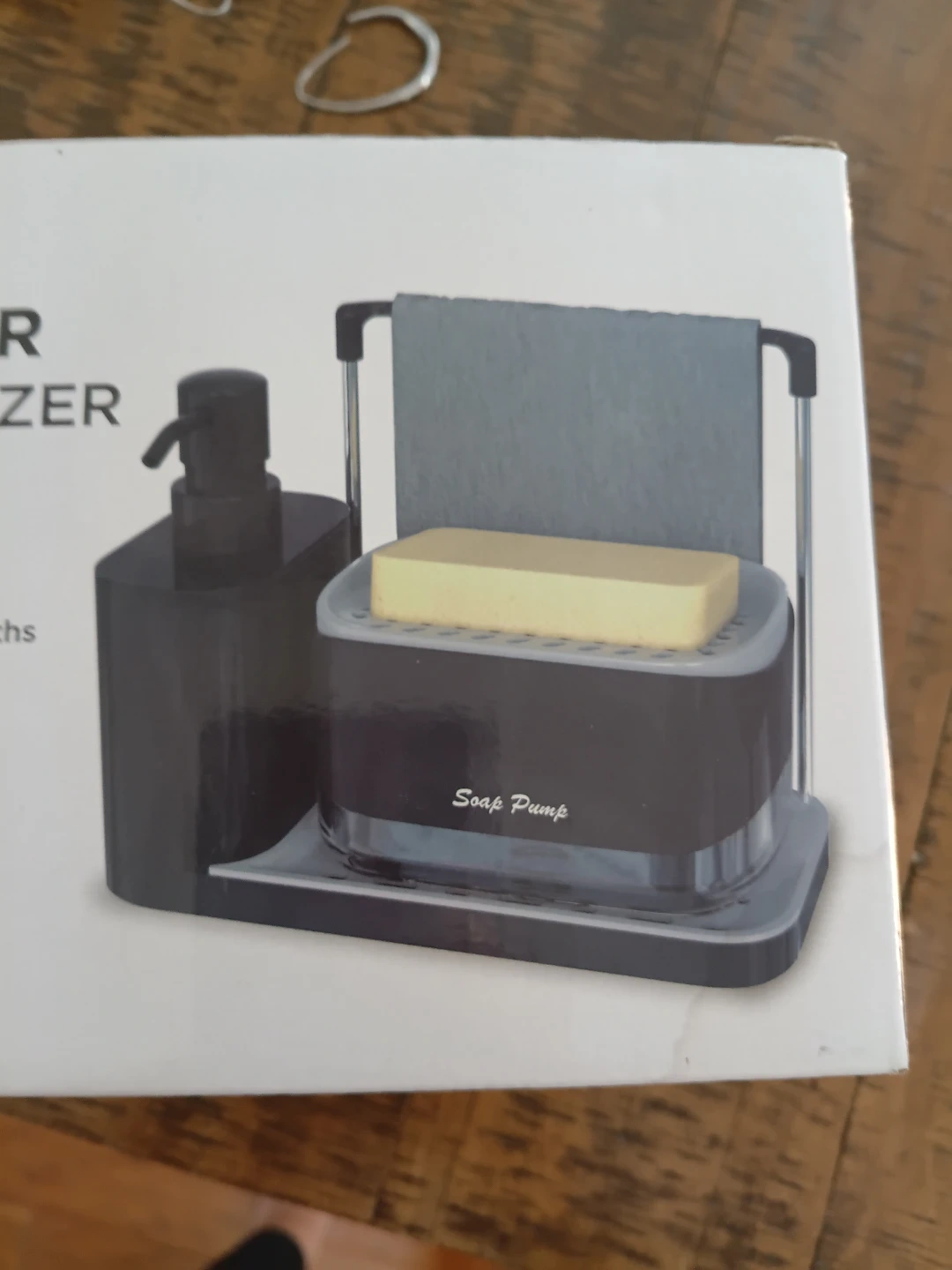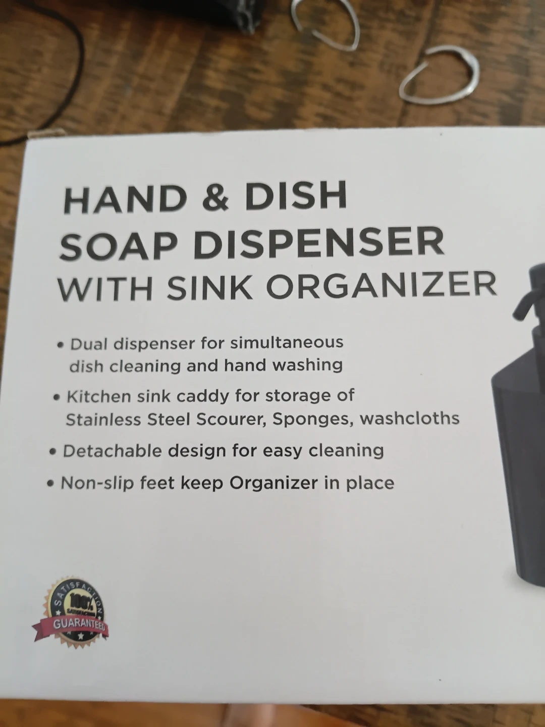 I have a brand new hand and dish soap dispenser with a sink organizer. It is a dual dispenser for simultaneous dish cleaning and hand washing. It also has a kitchen utensil caddy for storage of stainless steel scourers, sponges, and washcloths. It features a detachable design for easy cleaning, and a non-slip feet to keep the organizer in place.